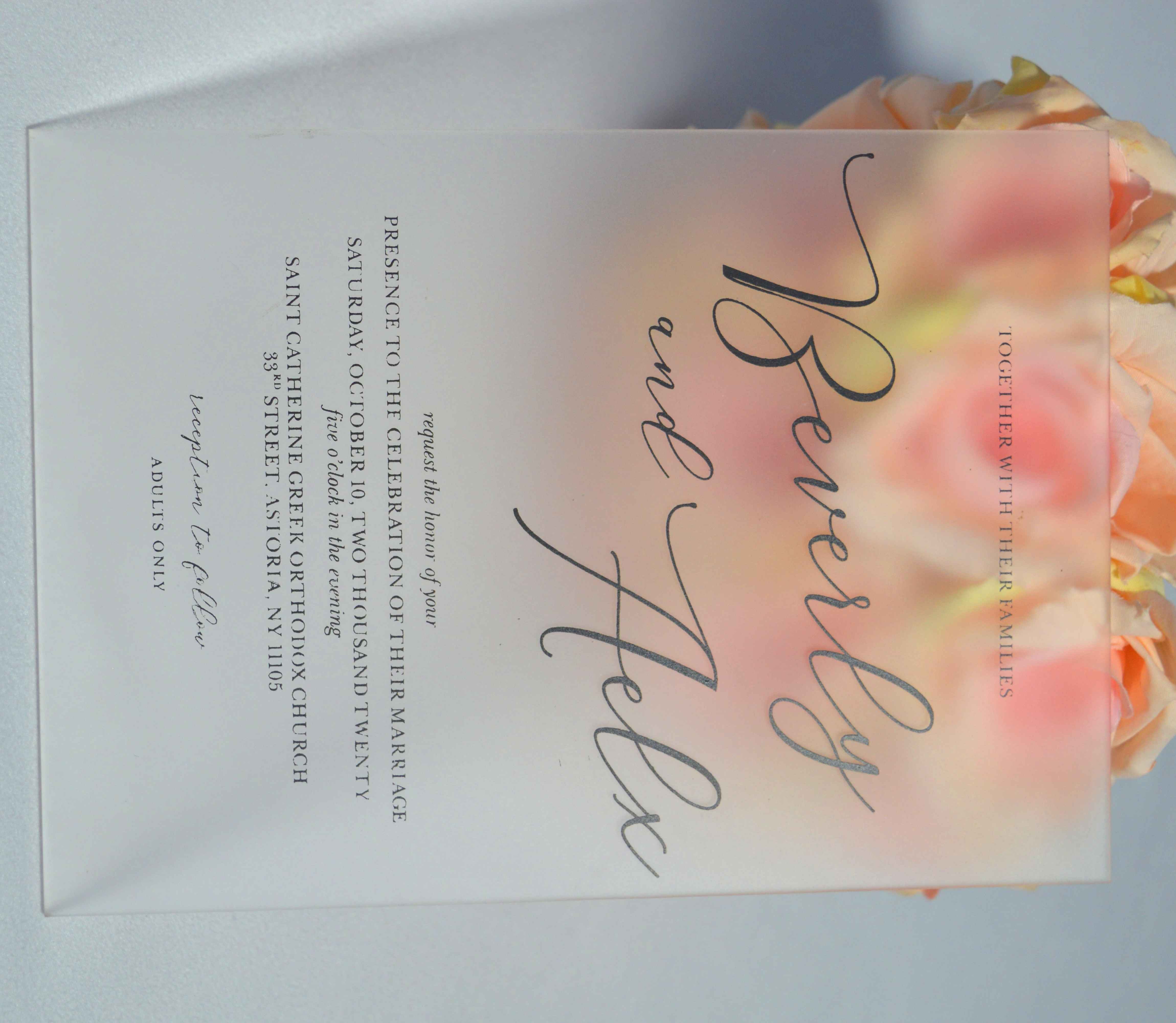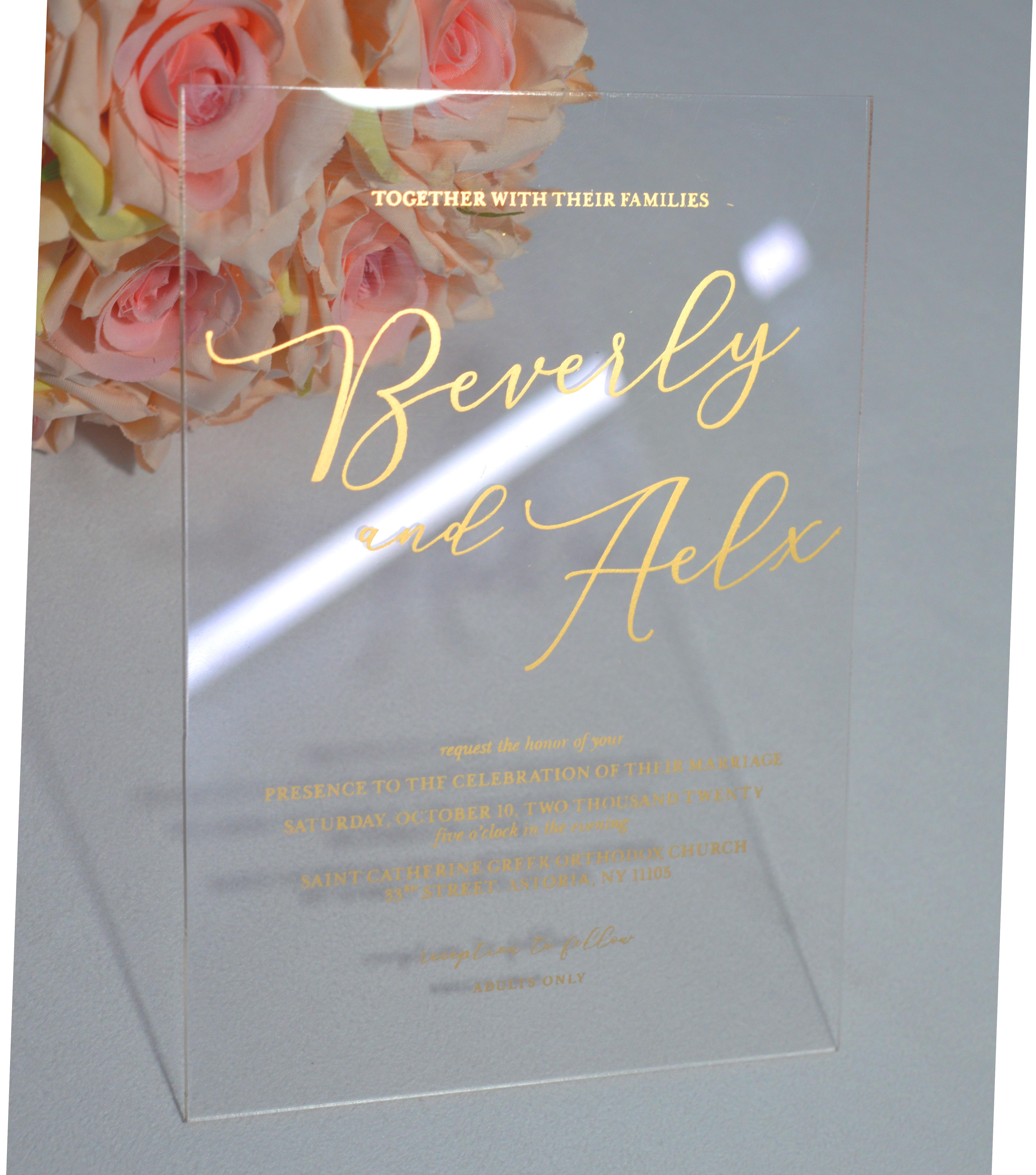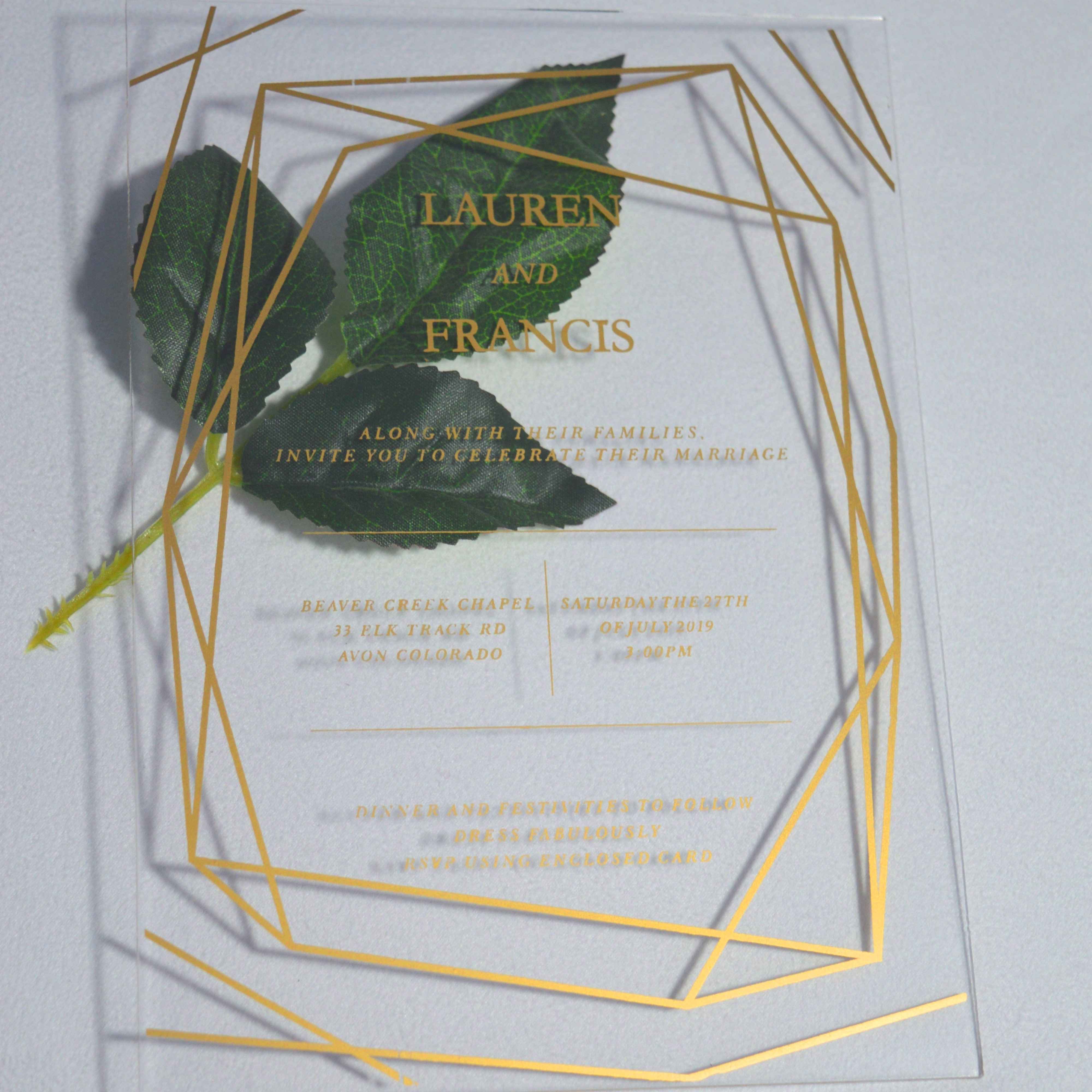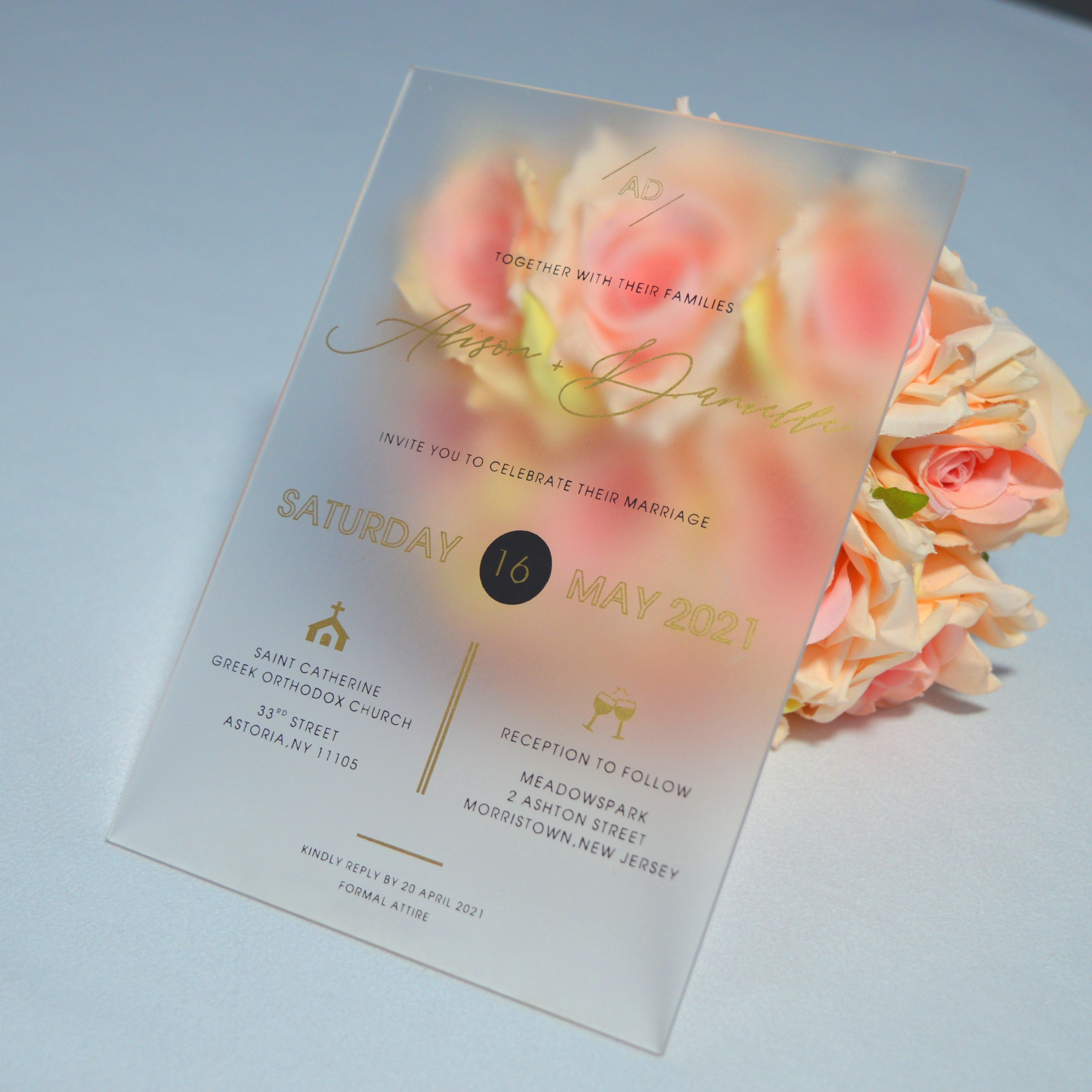 Frosted Acrylic Wedding Invitations with Gold and Black Font