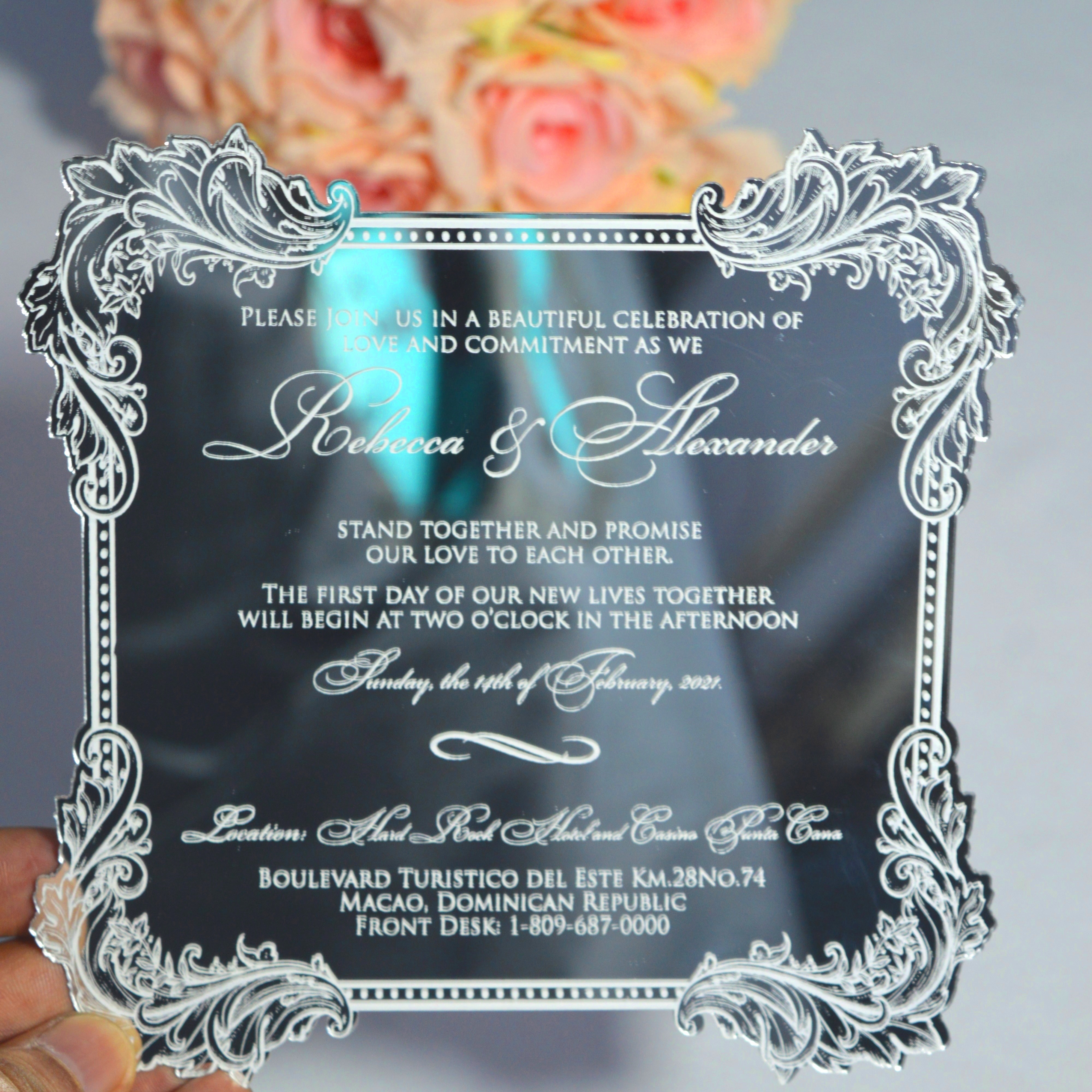Silver Mirror Acrylic Invitation With Floral Laser-Cut Design