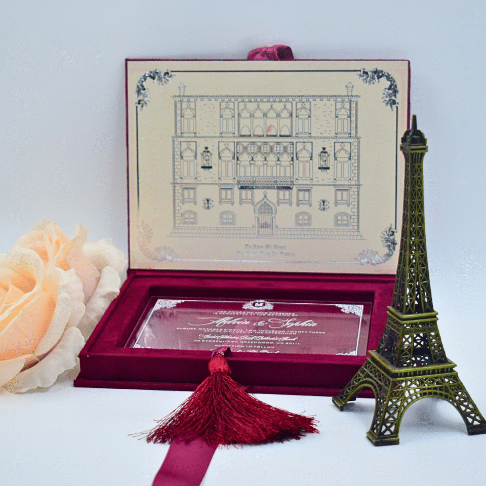Maroon Velvet Wedding Invitation Box: Clear Acrylic Invite