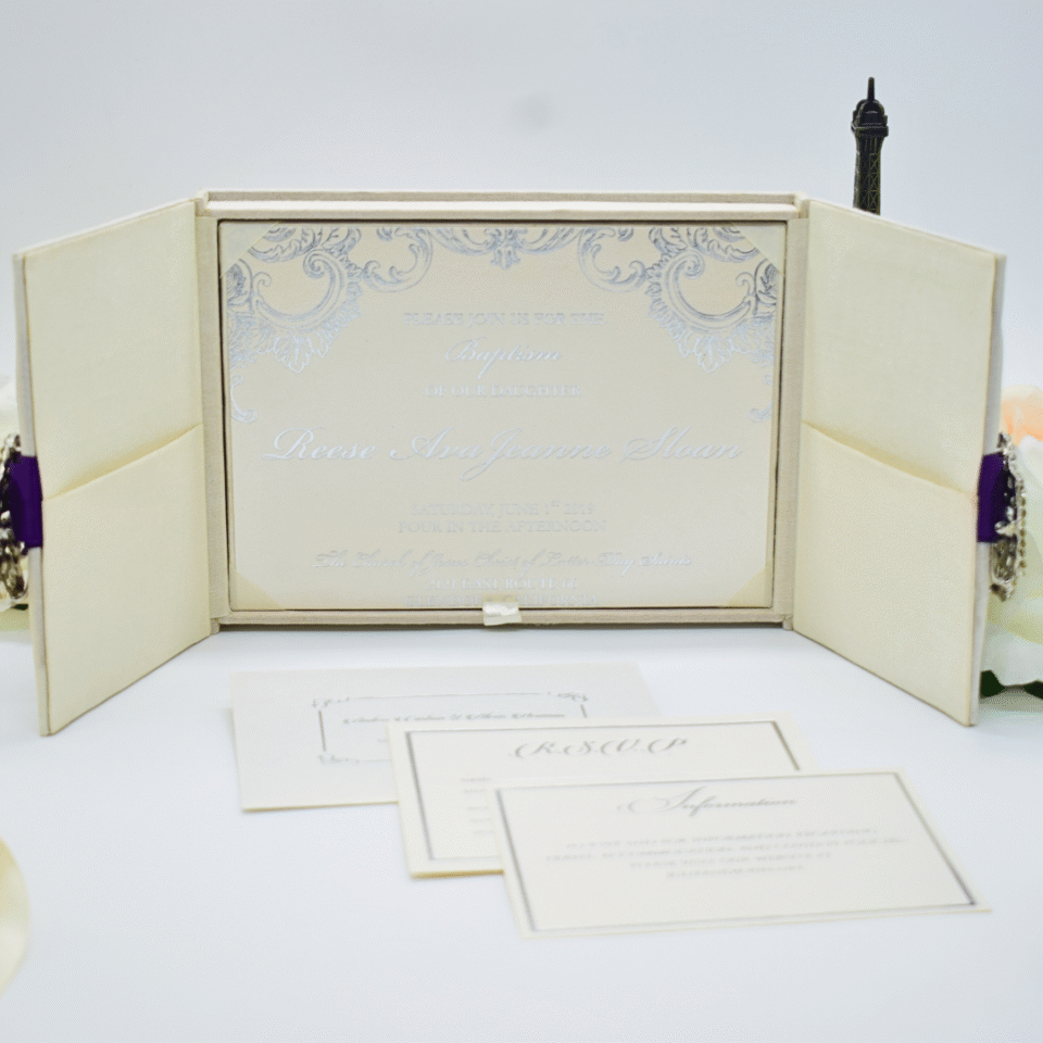 Ivory Trifold Wedding Invitation Box with Custom Foil Monogram
