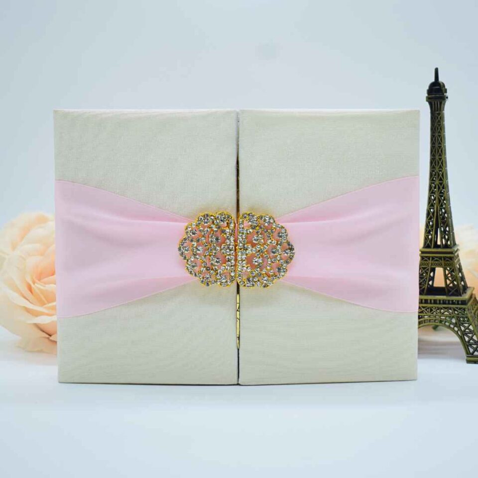 Luxury Gold Silk Wedding Invitation Box with Pearl Brooch