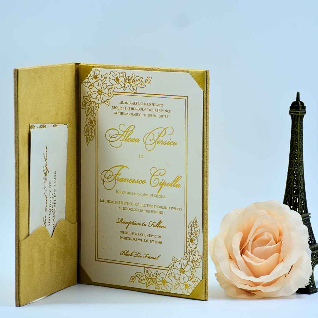 𝕋ℍ𝕀𝕊 𝕃𝕀𝕊𝕋𝕀ℕ𝔾 𝕀ℕℂ𝕃𝕌𝔻𝔼𝕊: A suede bi-fold wedding invitation folio with a gold foil printed custom monogram. This suede folio comes with a foil-printed cardstock invitation insert and a mailing envelope.