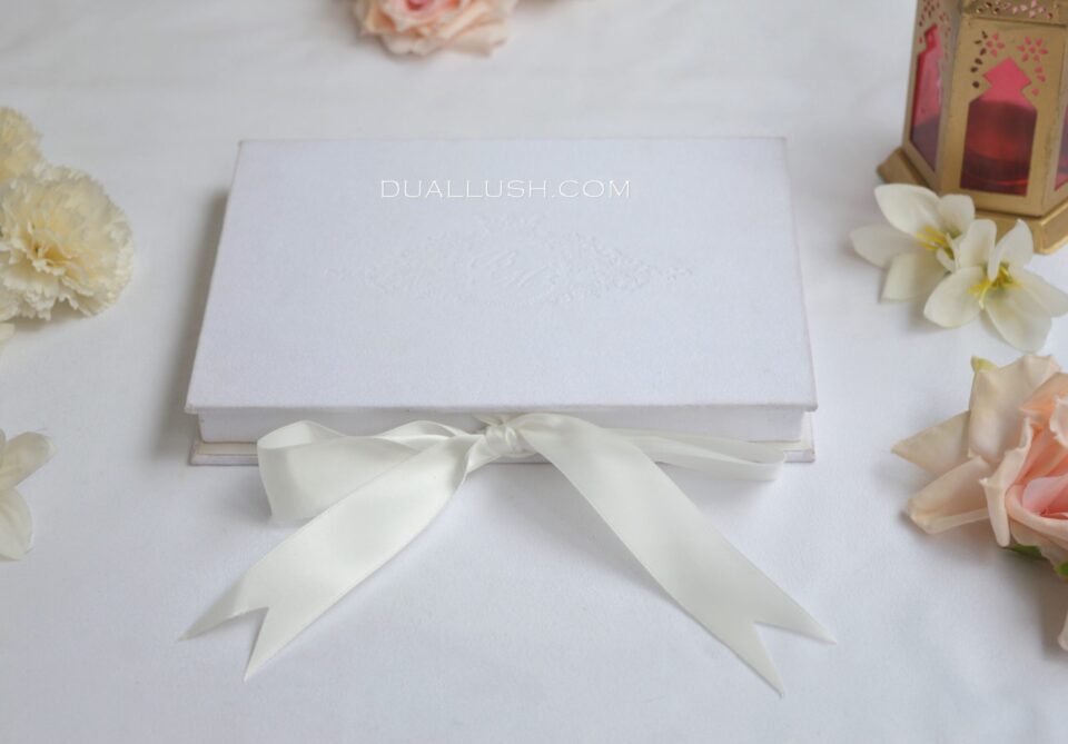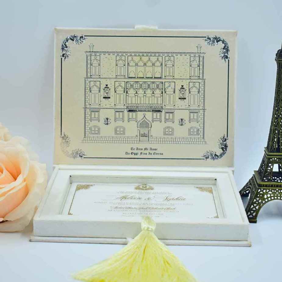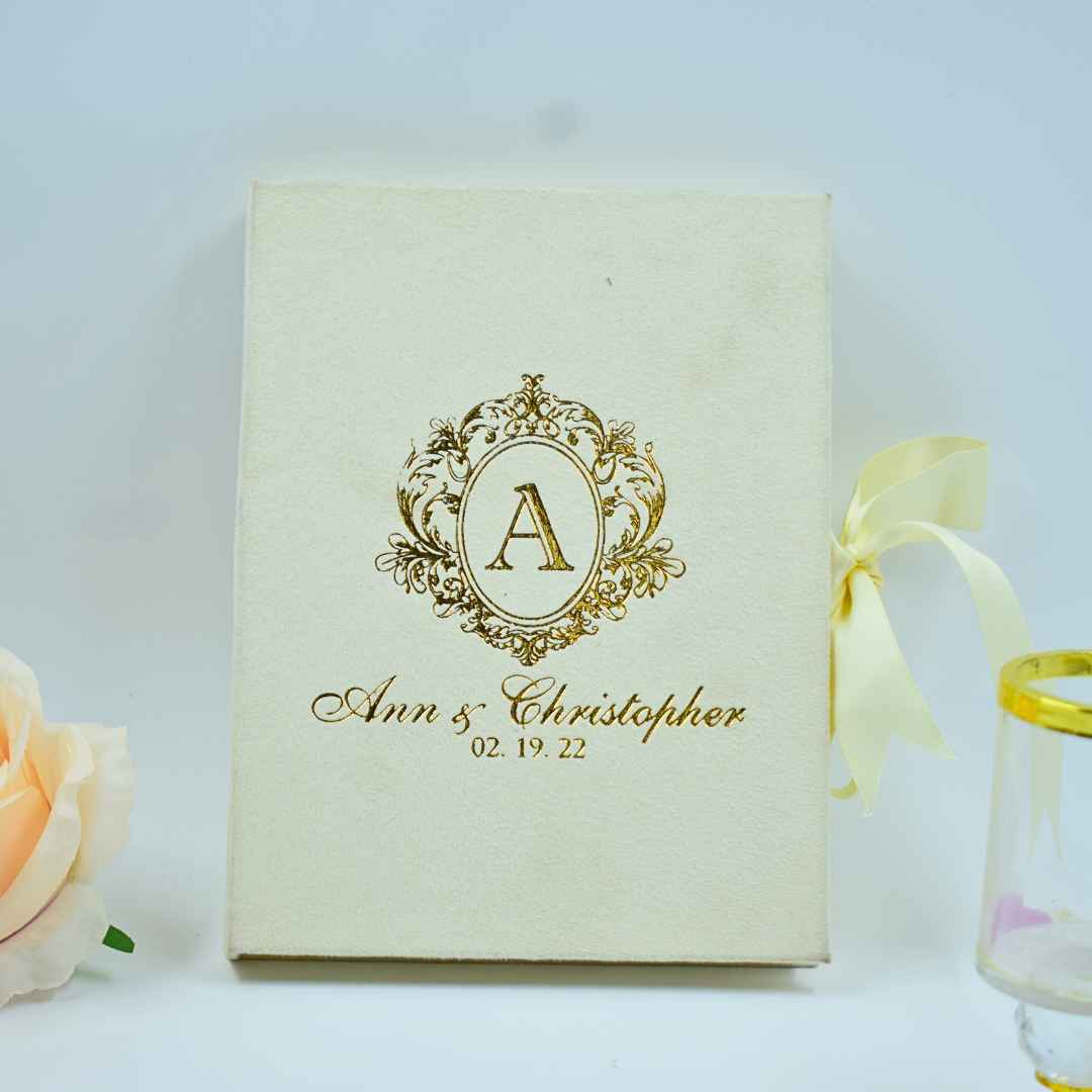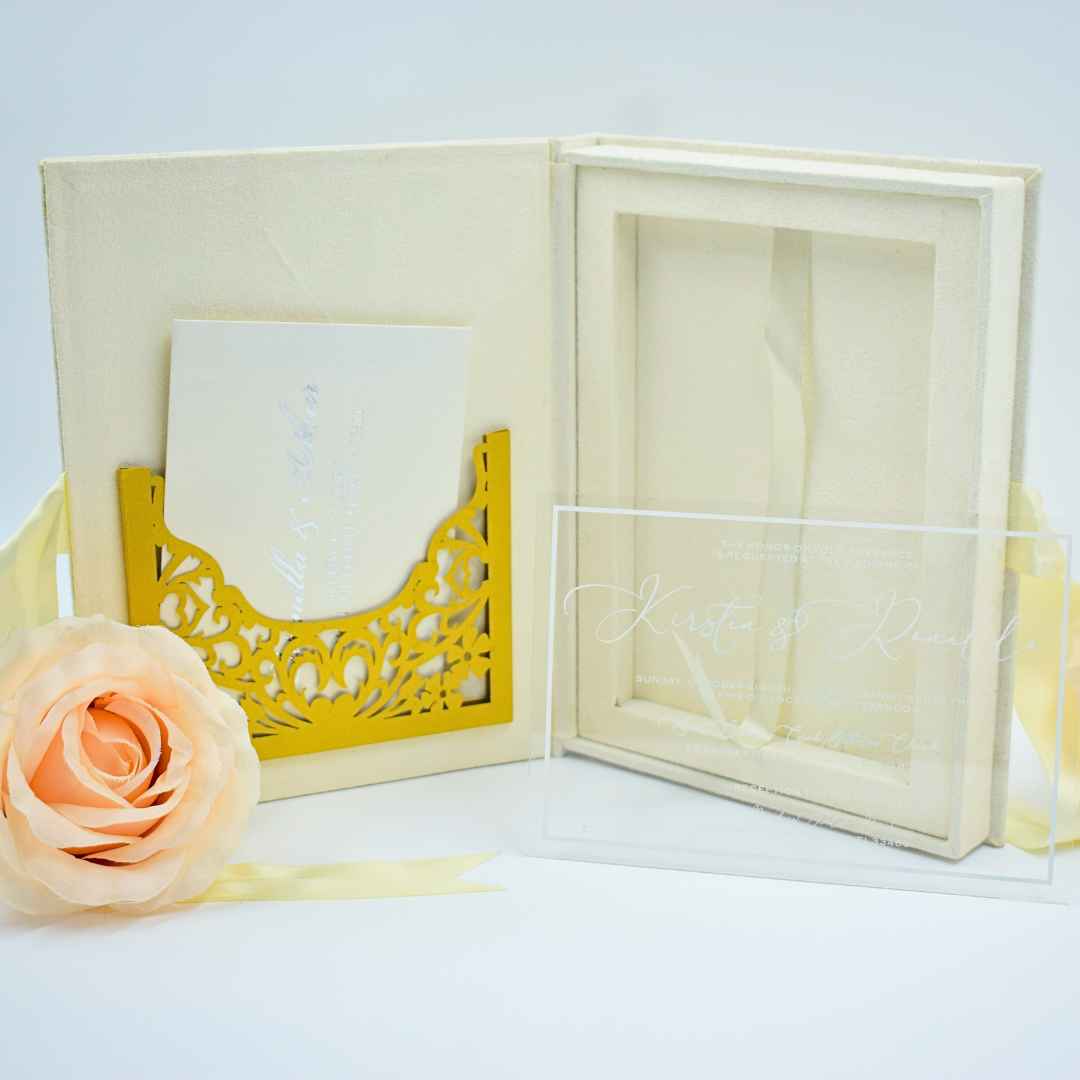 𝕋ℍ𝕀𝕊 𝕃𝕀𝕊𝕋𝕀ℕ𝔾 𝕀ℕℂ𝕃𝕌𝔻𝔼𝕊: A premium hardboard velvet wedding invitation box, adorned with a custom foil monogram and a picturesque depiction of your venue on the flap. The box comes with a silk screen-printed acrylic invitation. A high quality cardstock mailing envelope completes this beautiful invitation suite.