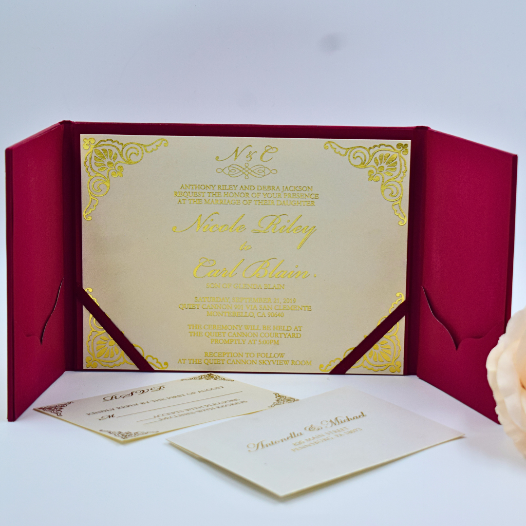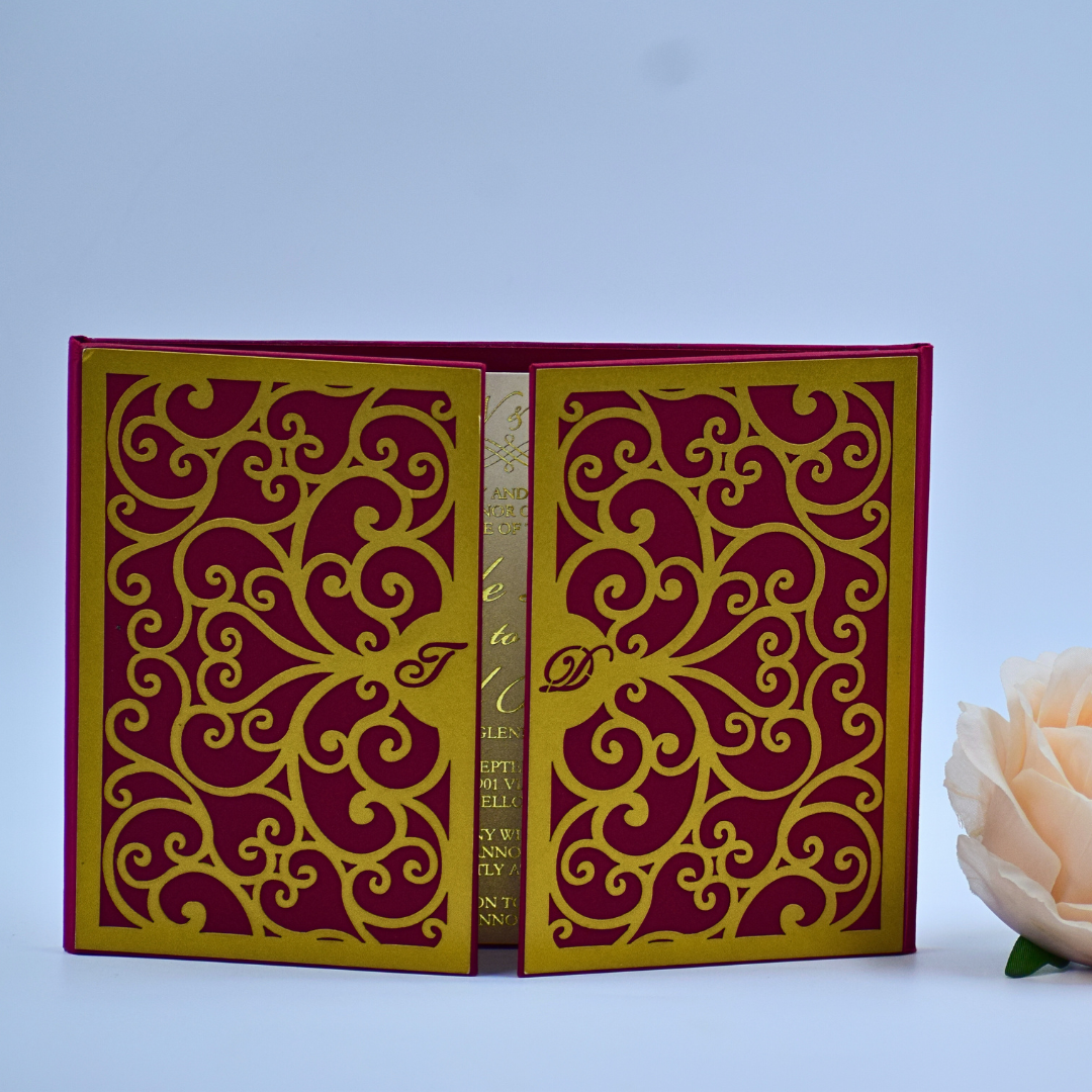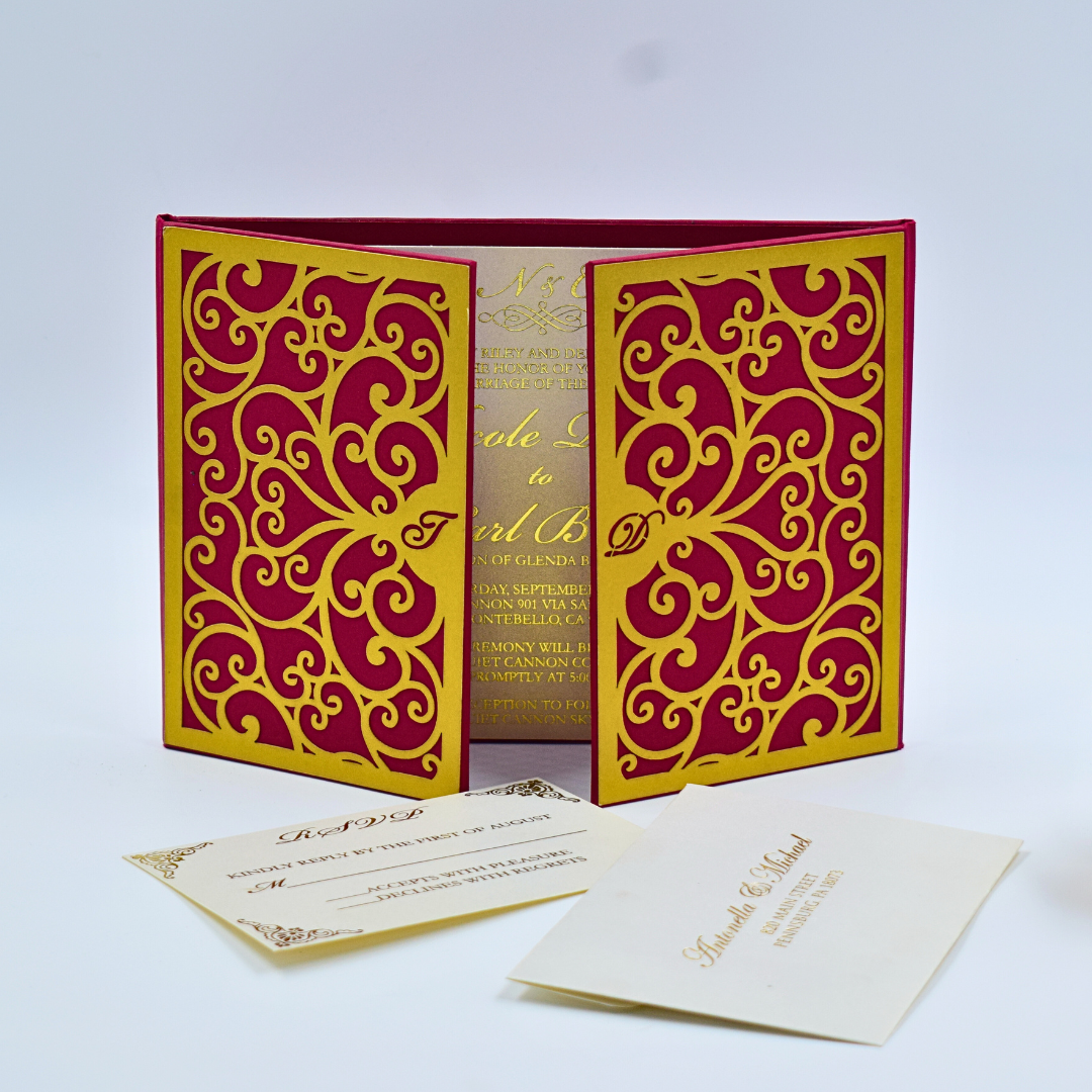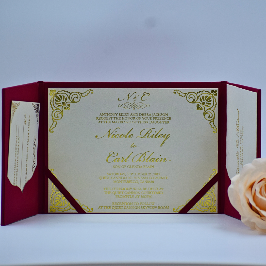 𝕋ℍ𝕀𝕊 𝕃𝕀𝕊𝕋𝕀ℕ𝔾 𝕀ℕℂ𝕃𝕌𝔻𝔼𝕊: A tri-fold beautiful mirror acrylic wedding invitation folio with laser cut art work design and a real foil invitation insert card printed on pearl shimmery cardstock.