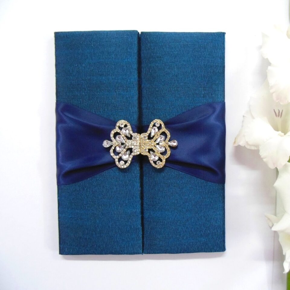 𝕋ℍ𝕀𝕊 𝕃𝕀𝕊𝕋𝕀ℕ𝔾 𝕀ℕℂ𝕃𝕌𝔻𝔼𝕊: A silk wedding invitation box with double trim satin ribbon and crystal rhinestones buckle brooch, a silk cardholder with ribbon and rhinestone buckle brooch, a chocolate/candy tray, and a pearl shimmery cardstock printed invitation insert with foil print.