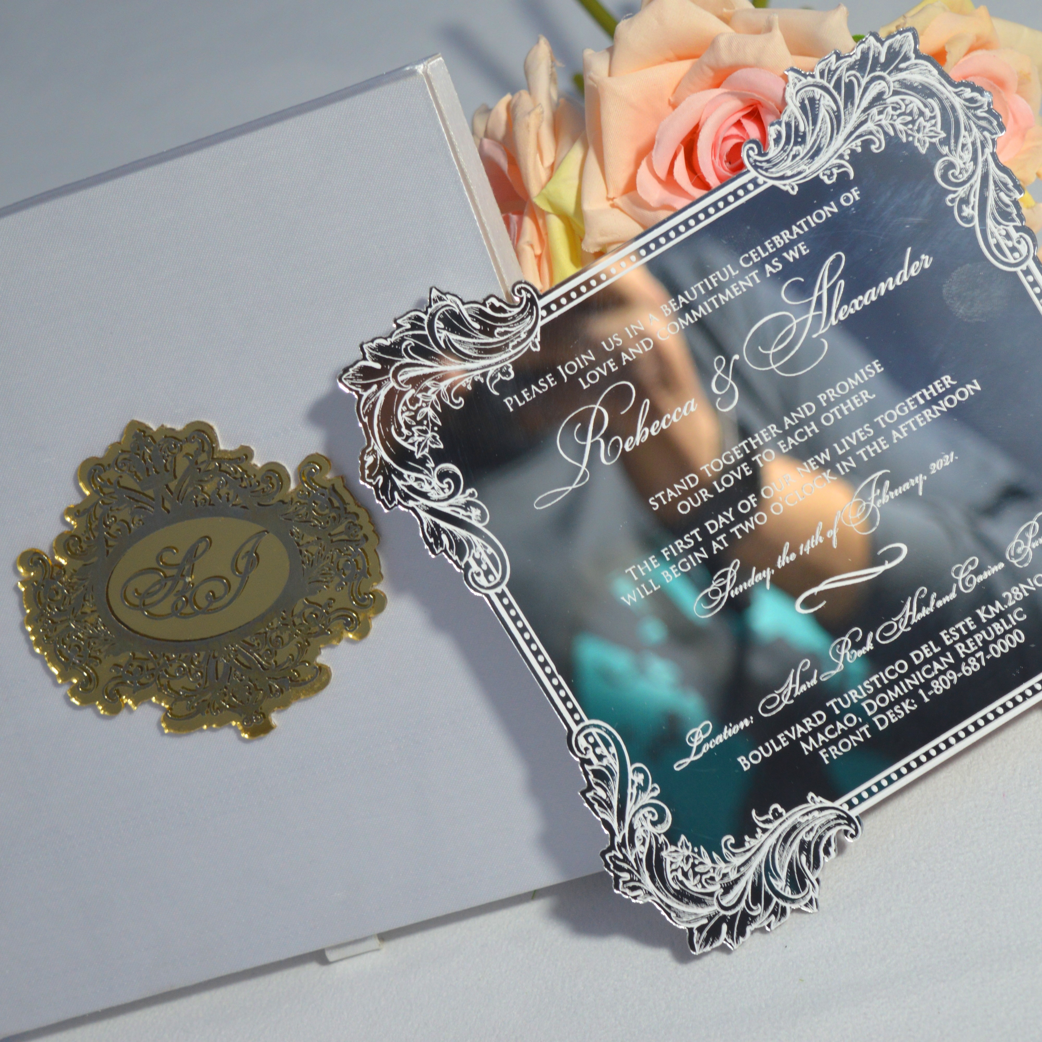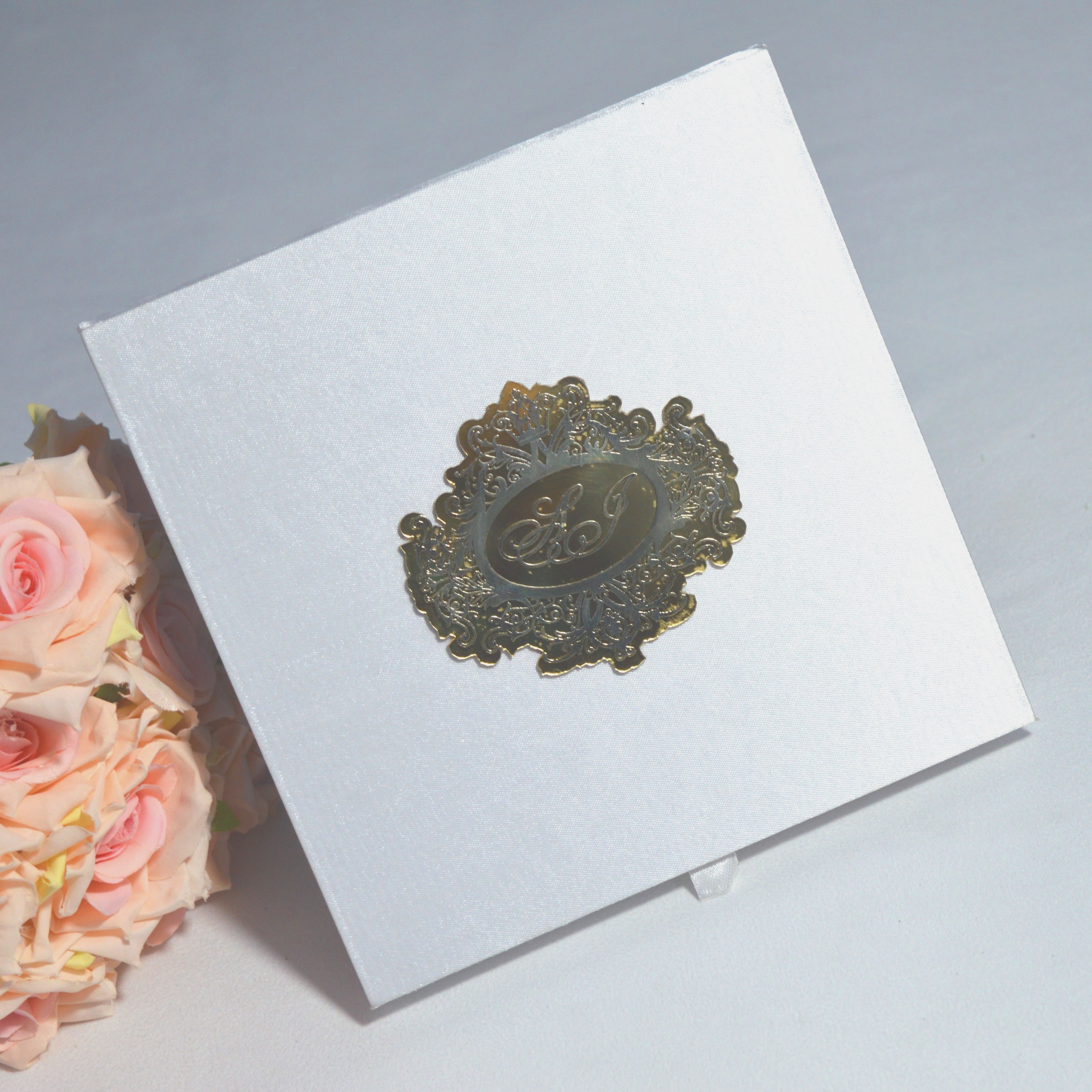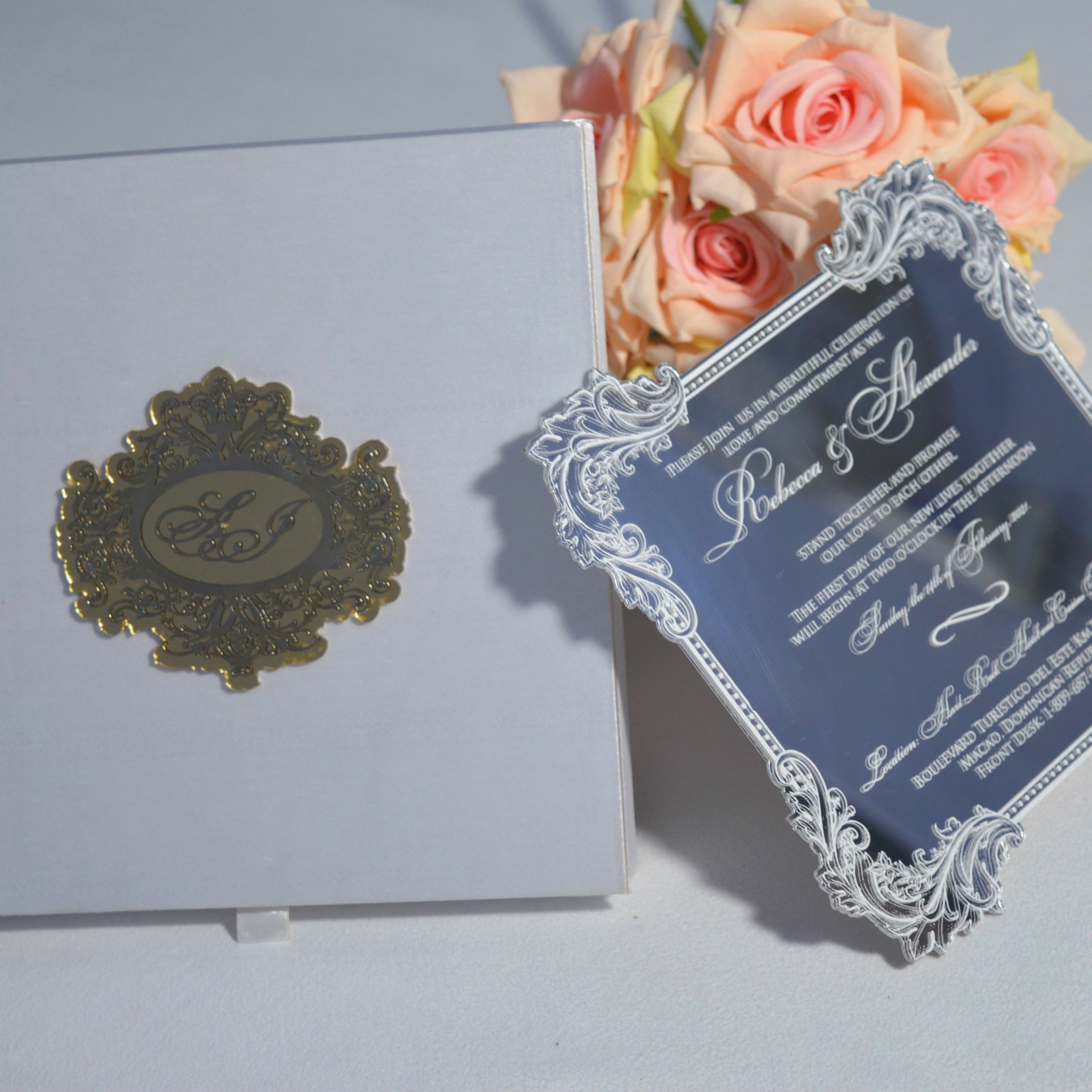πβππ πππππβπΎ πββπππ»πΌπ: A satin hinged lid wedding invitation box with a custom electroplated acrylic monogram. The box comes with a mirror acrylic invitation with laser-cut floral artwork and silk screen printed details. The boxed invitation has a pocket inside the lid for additional enclosure insert cards.