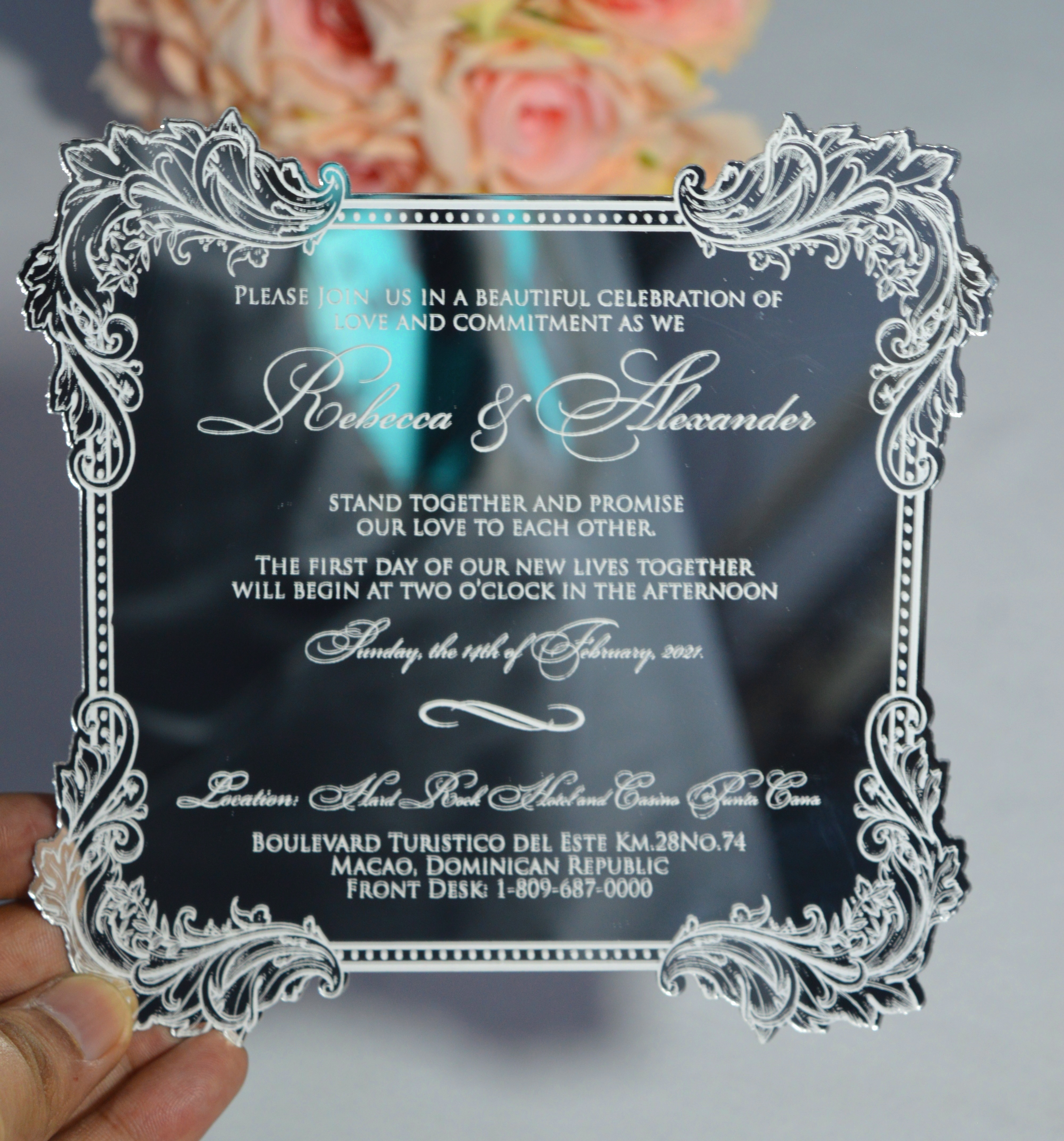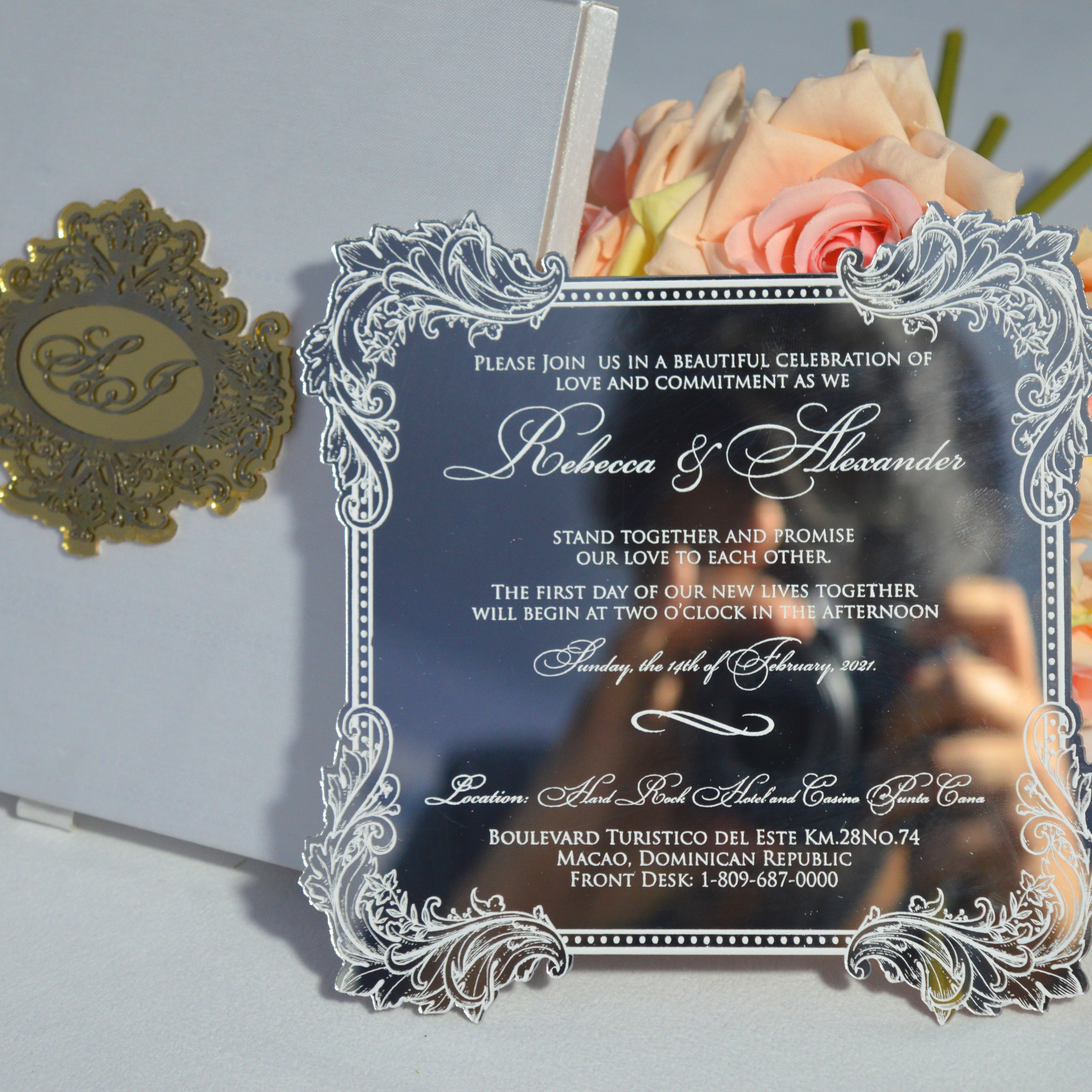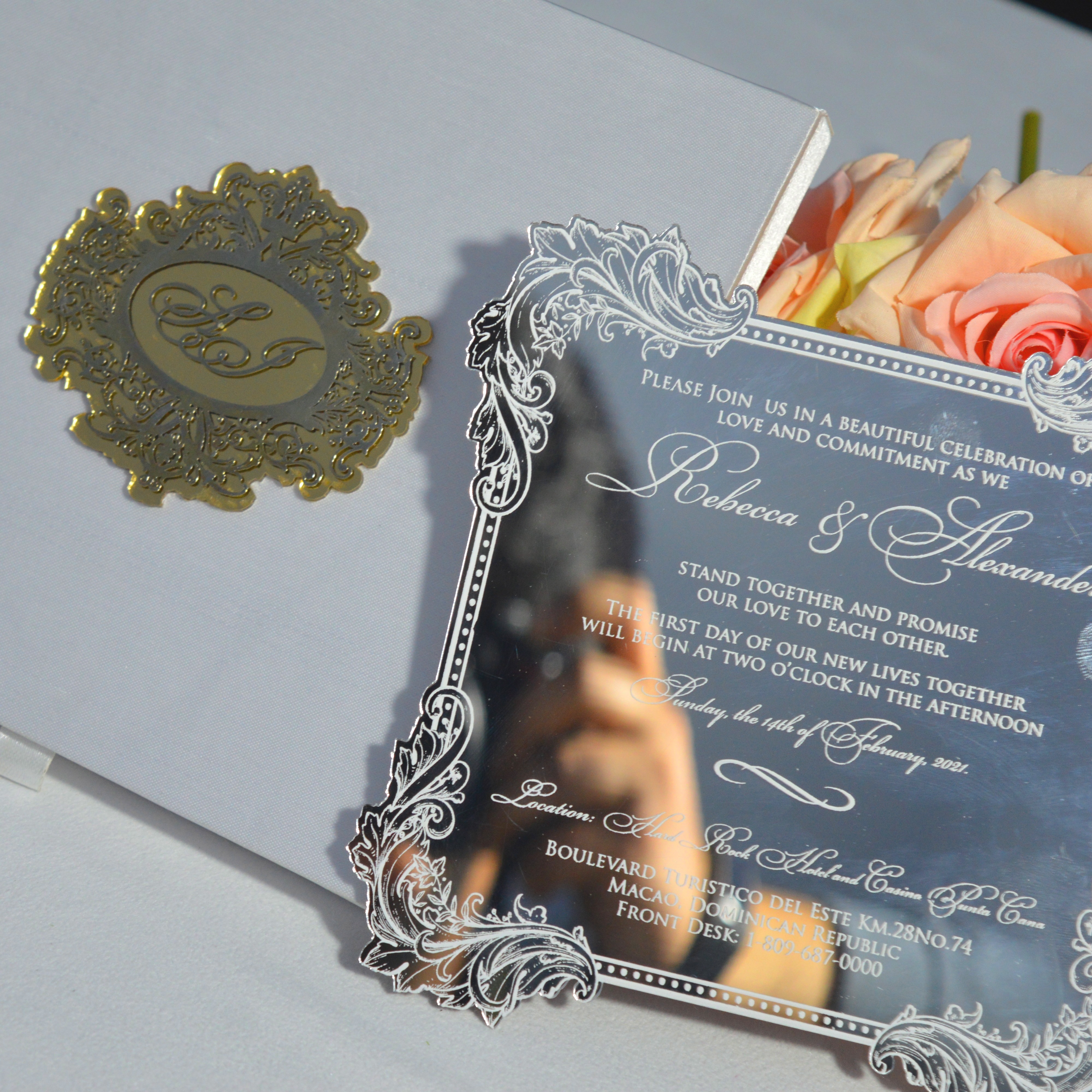 πβππ πππππβπΎ πββπππ»πΌπ: A satin hinged lid wedding invitation box with a custom electroplated acrylic monogram. The box comes with a mirror acrylic invitation with laser-cut floral artwork and silk screen printed details. The boxed invitation has a pocket inside the lid for additional enclosure insert cards.