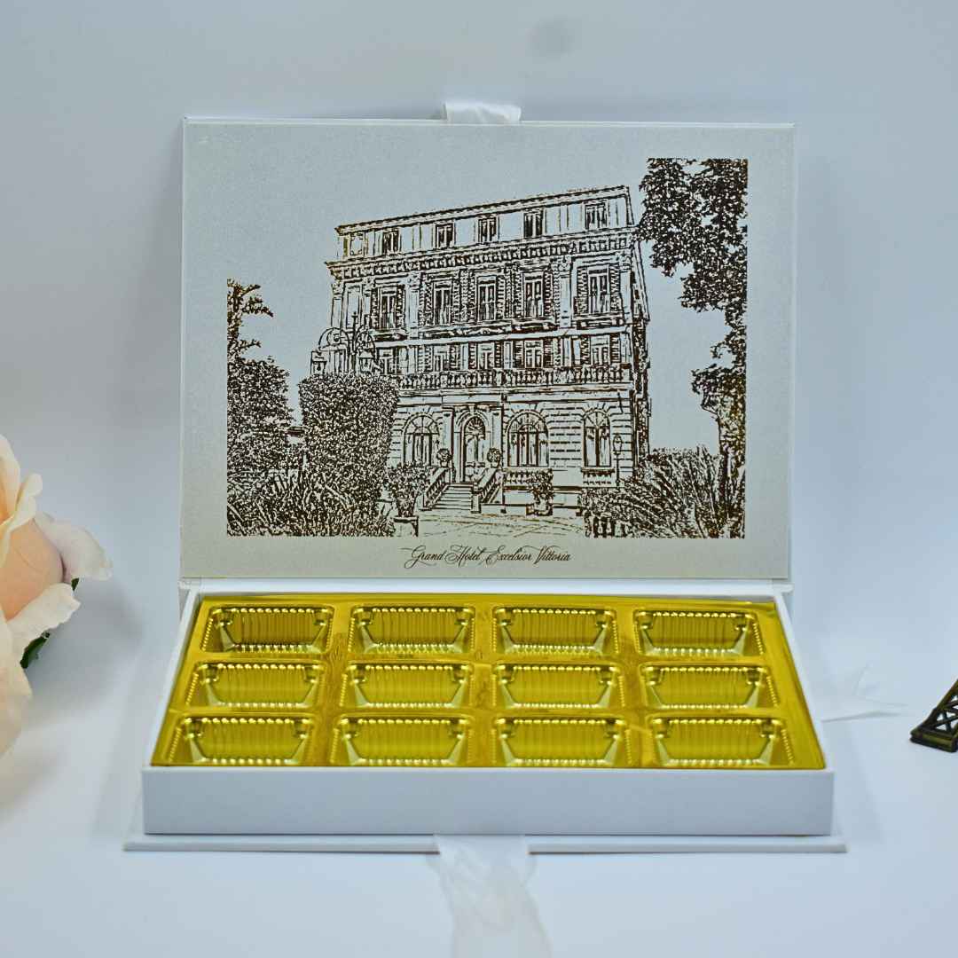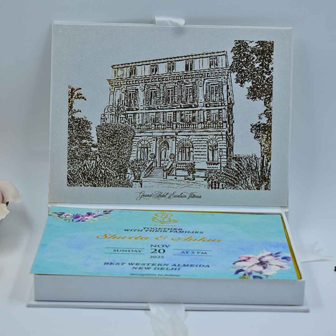 𝕋ℍ𝕀𝕊 𝕃𝕀𝕊𝕋𝕀ℕ𝔾 𝕀ℕℂ𝕃𝕌𝔻𝔼𝕊: A white velvet wedding invitation box with custom foil monogram and a chic clear acrylic invitation for a modern touch. The lid of the velvet box is customized with foil venue illustration. This boxed invitation comes with a mailing envelope.