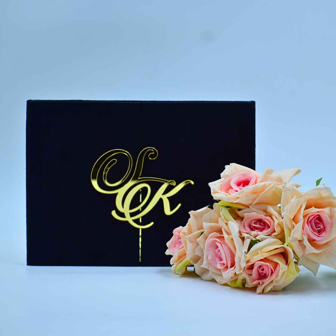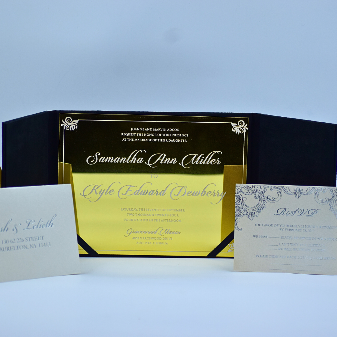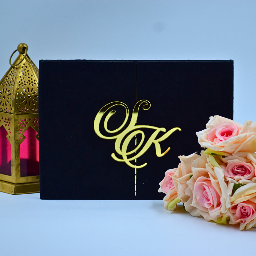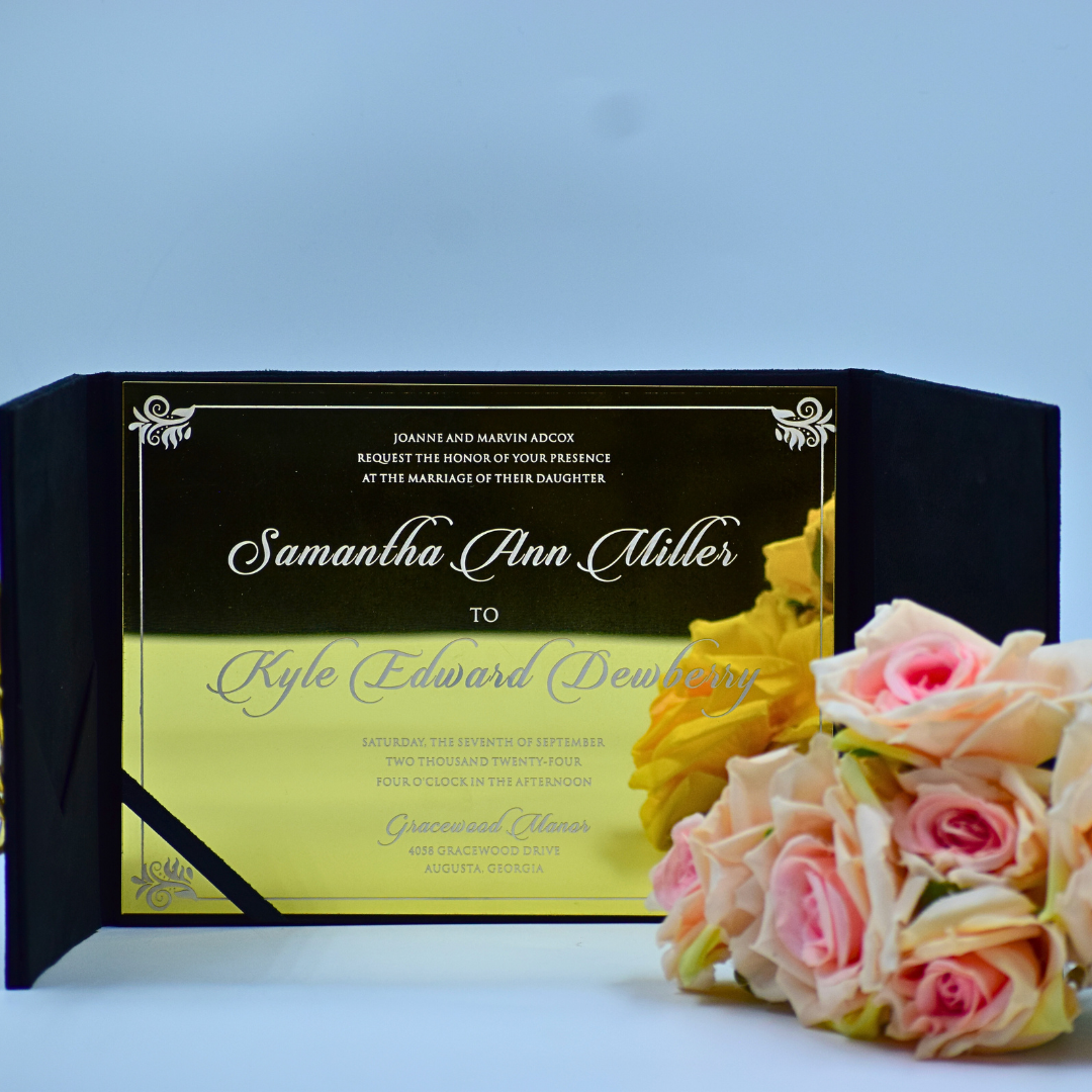 𝕋ℍ𝕀𝕊 𝕃𝕀𝕊𝕋𝕀ℕ𝔾 𝕀ℕℂ𝕃𝕌𝔻𝔼𝕊: A black velvet wedding Invitation folio with persozalized gold mirror acrylic laser cut monogram and a gold mirror acrylic invite.