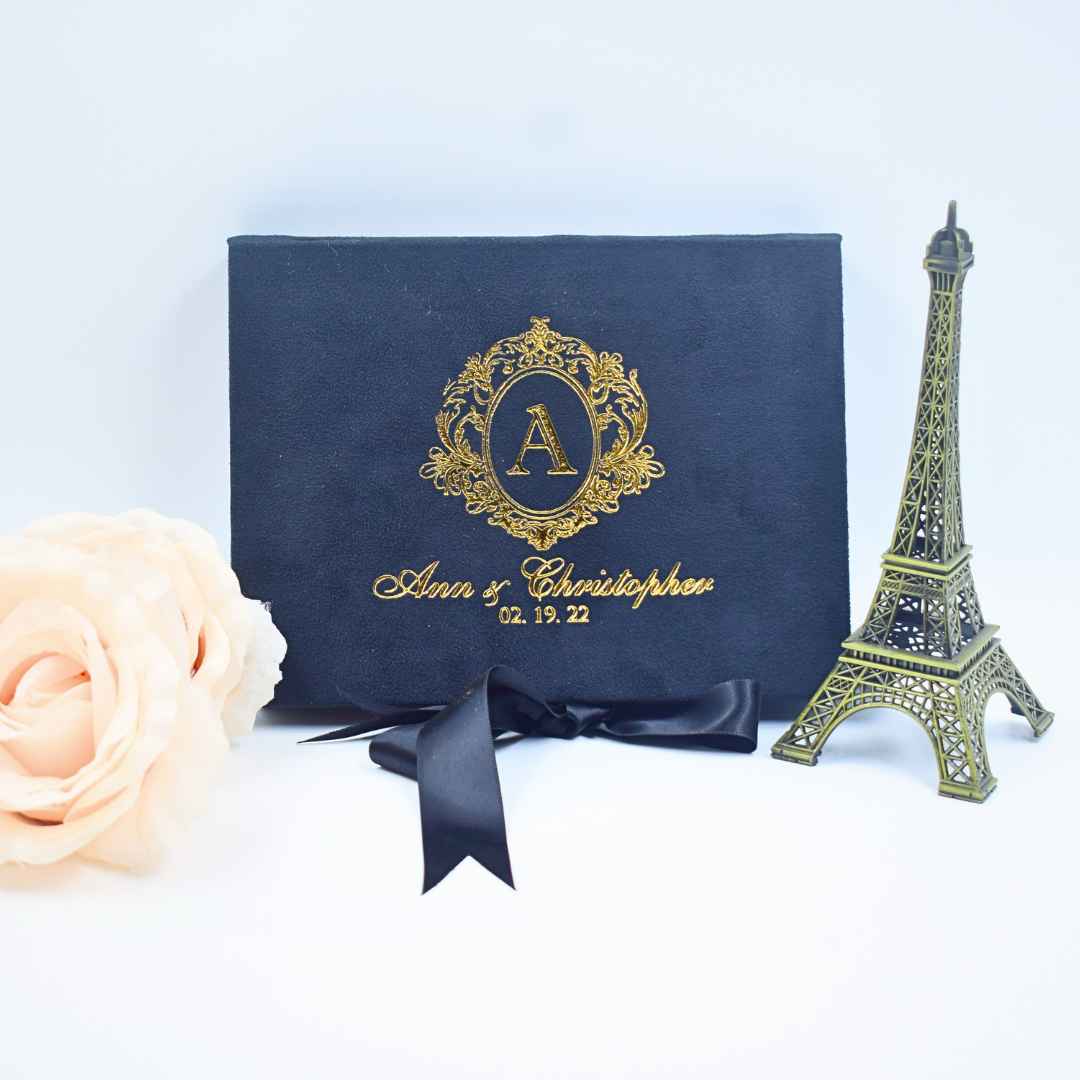 Black Velvet Wedding Invitation Box with Gold Foil Custom Monogram