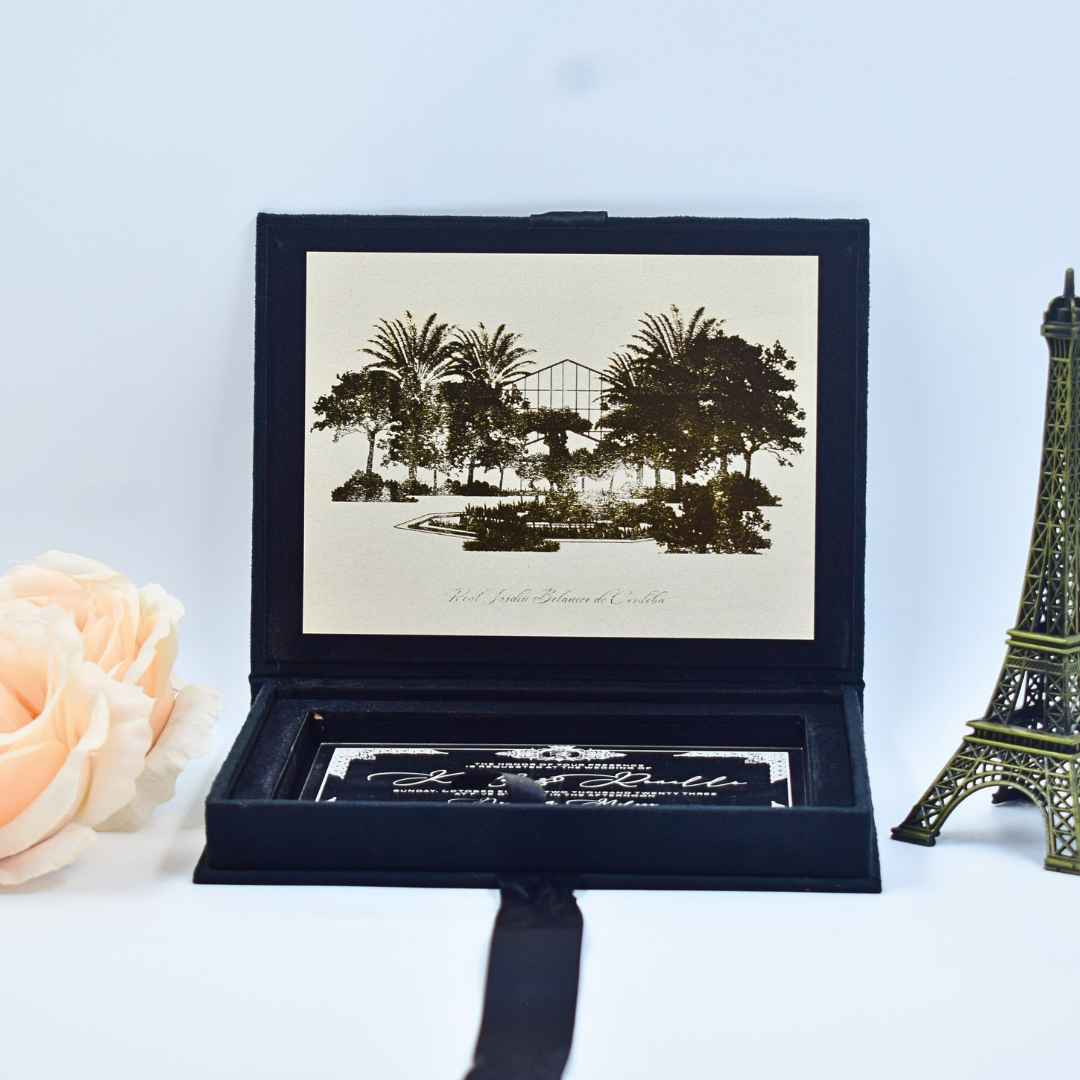 This luxurious black velvet wedding invitation box exudes sophistication and mystery. The plush, sumptuous velvet exterior with custom foil monogram creates a tactile experience that intrigues and delights. Inside, a stunning clear acrylic invite showcases your event details with modern elegance. As guests open this opulent ensemble, they’ll be captivated by the juxtaposition of dark velvet and transparent acrylic, setting the tone for an unforgettable celebration.