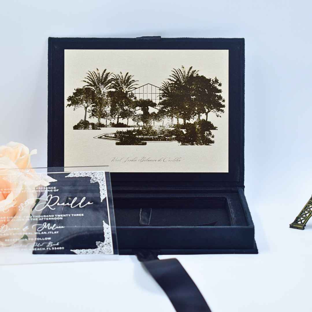 𝕋ℍ𝕀𝕊 𝕃𝕀𝕊𝕋𝕀ℕ𝔾 𝕀ℕℂ𝕃𝕌𝔻𝔼𝕊: This exquisite invitation suite features a luxurious suede hardboard box that makes a lasting first impression. The box is adorned with an elegant foil monogram and a captivating image of your venue on the flap, setting the tone for your special day. The flap inside illustrates your venue image and the box includes a clear acrylic invitation.