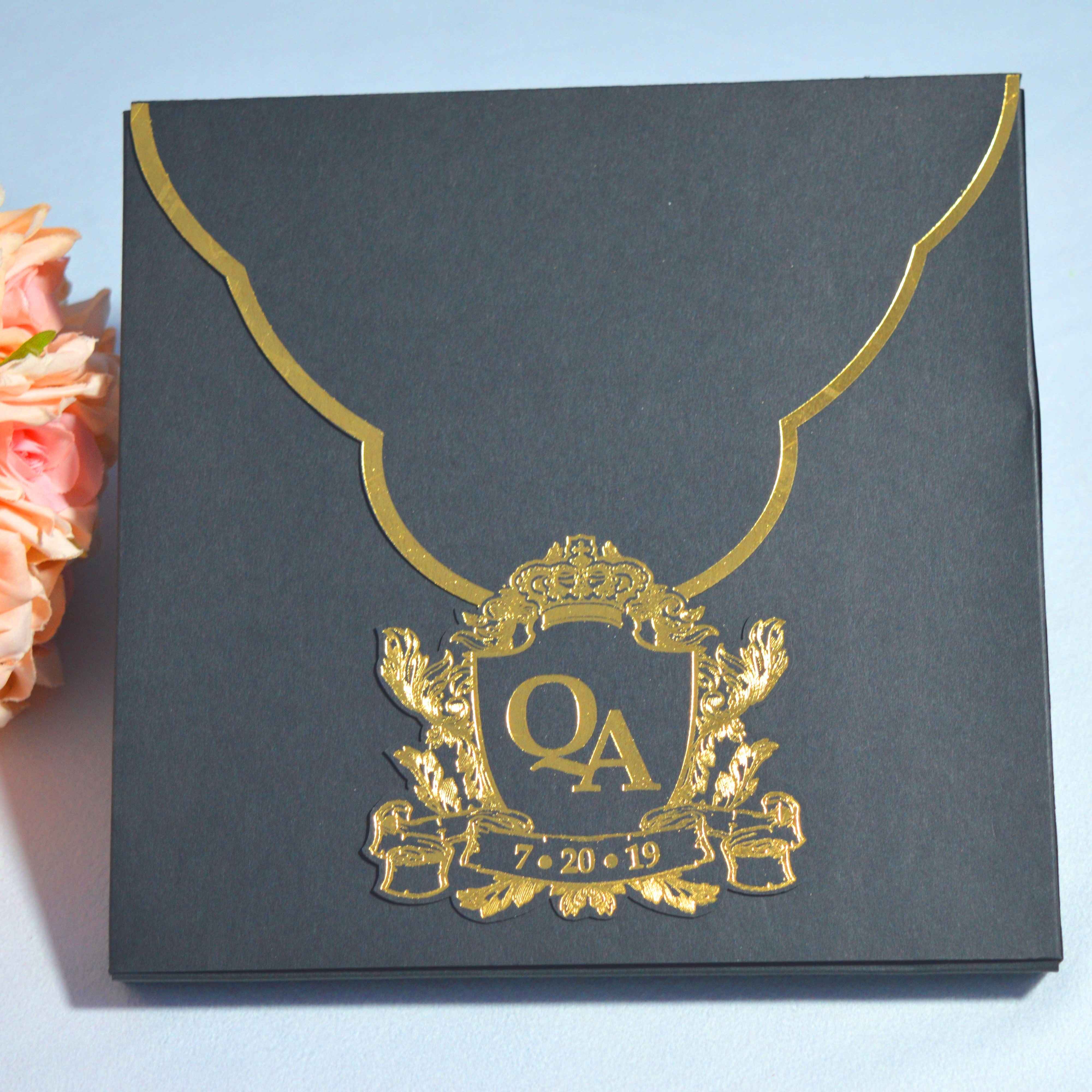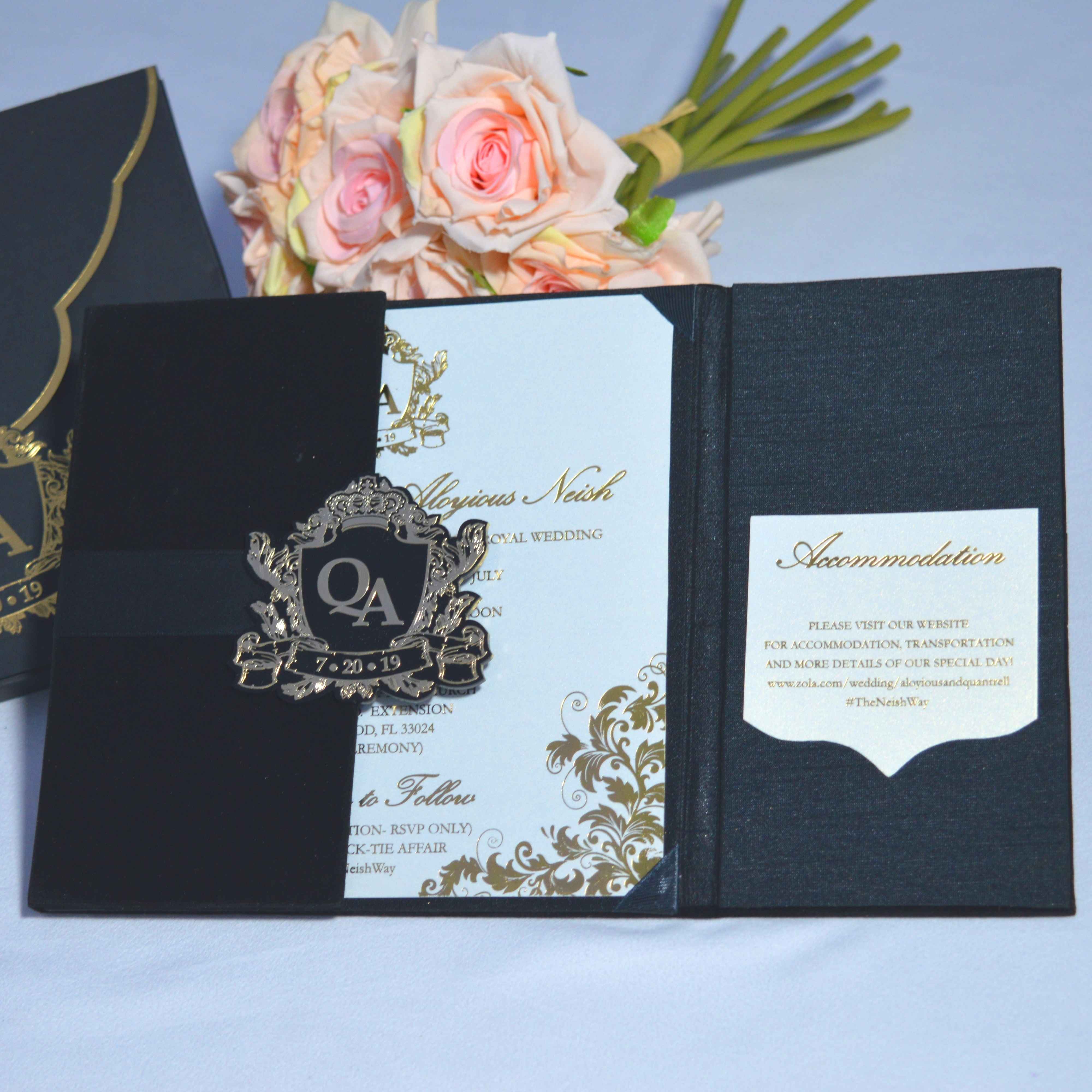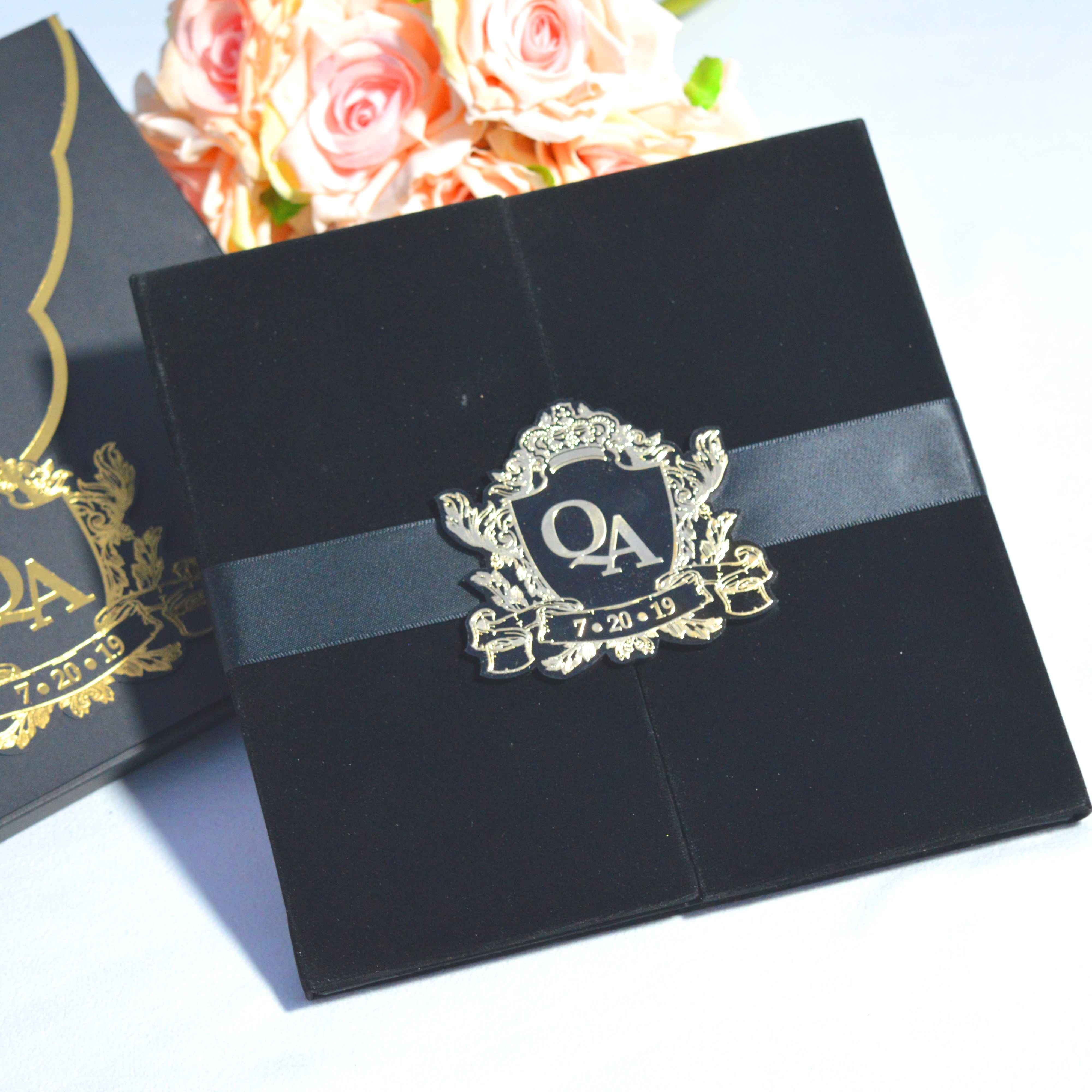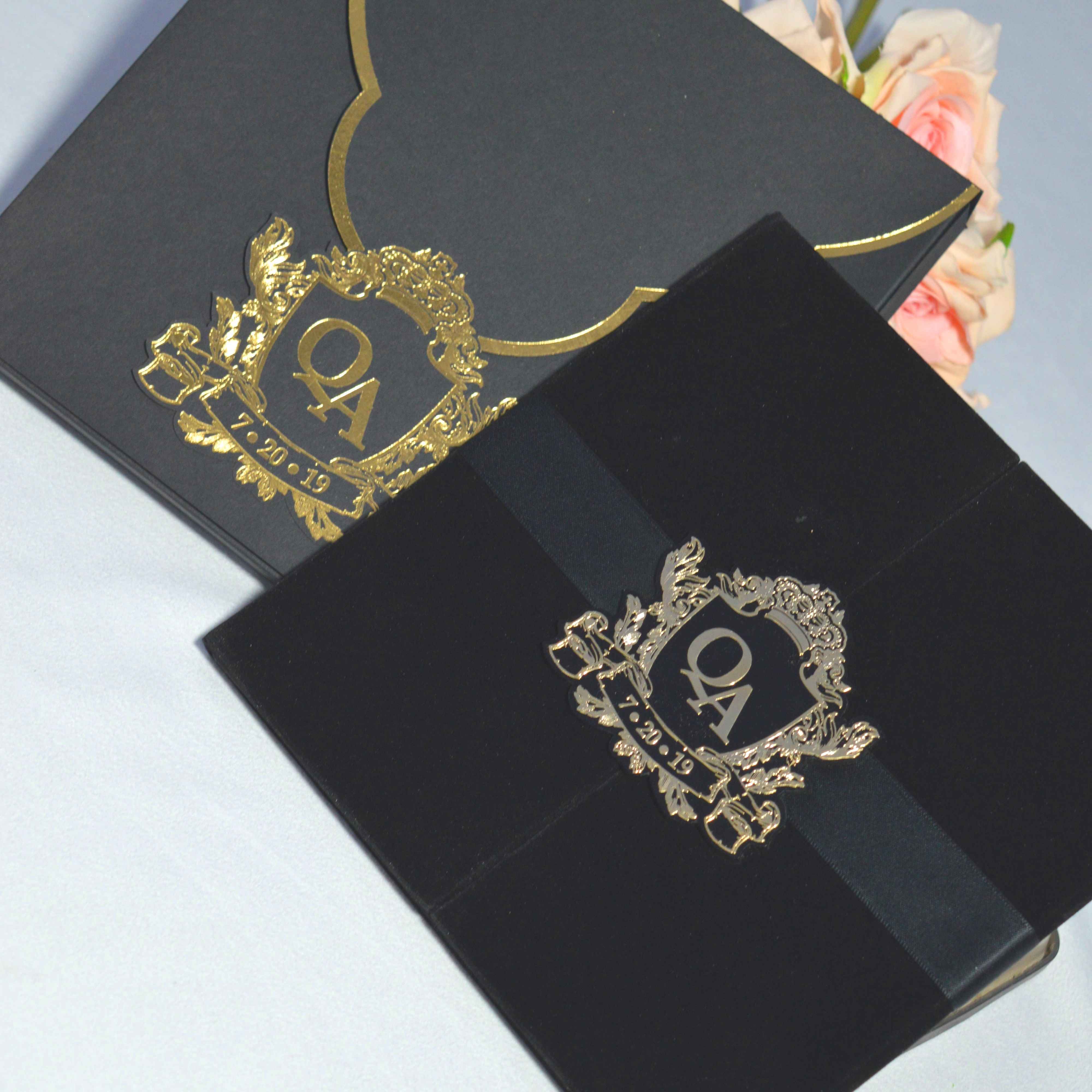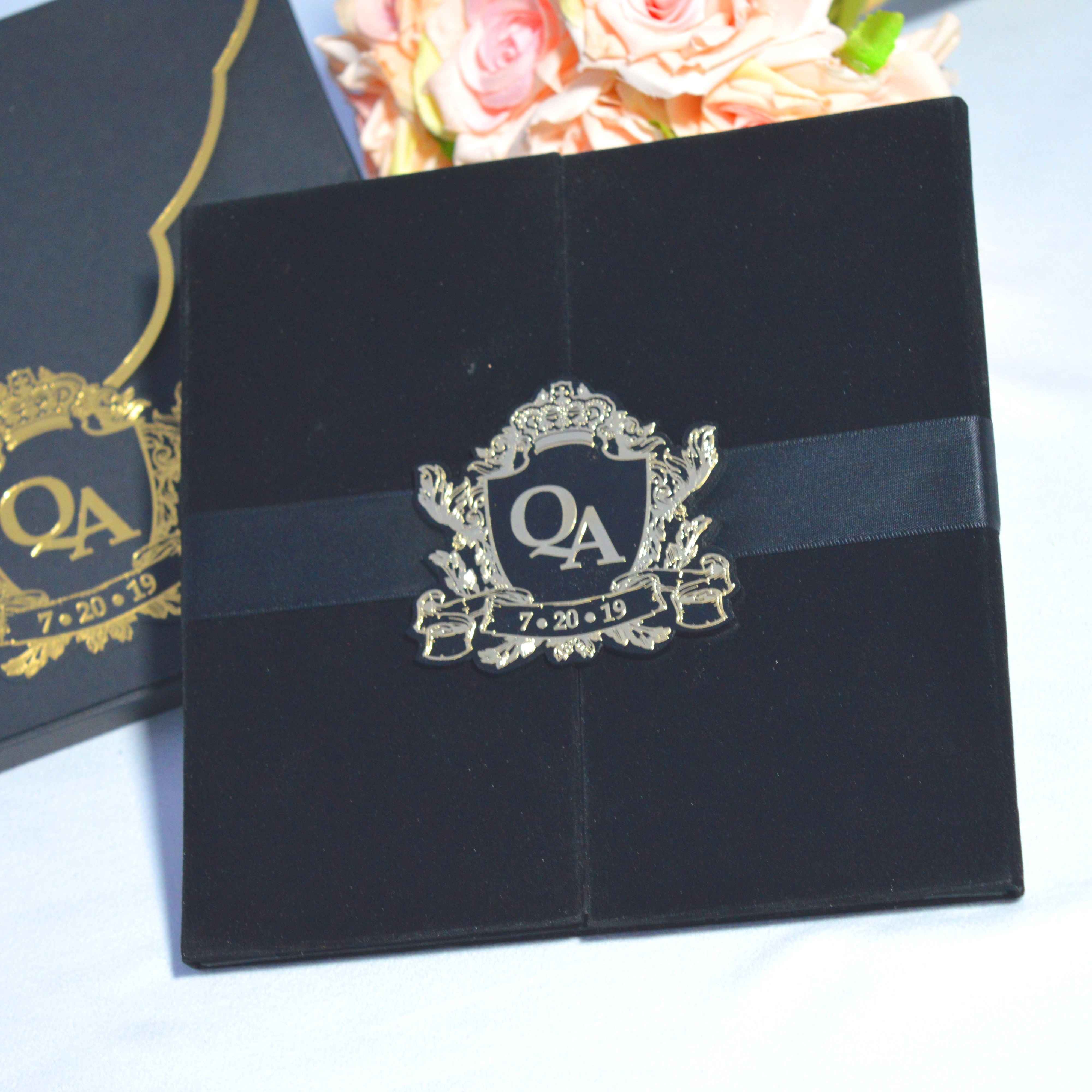 πβππ πππππβπΎ πββπππ»πΌπ: A velvet gate-fold invitation folio with a double-trimmed satin ribbon and a customized logo/monogram.