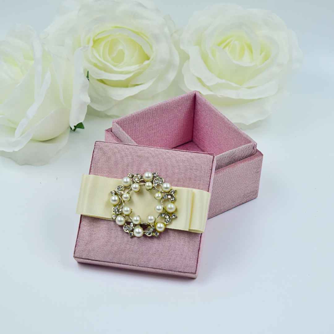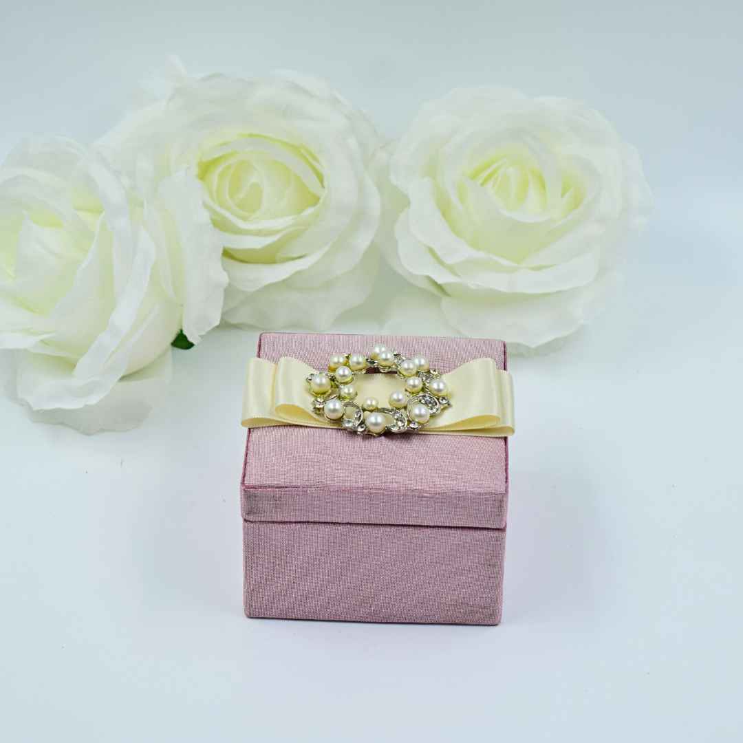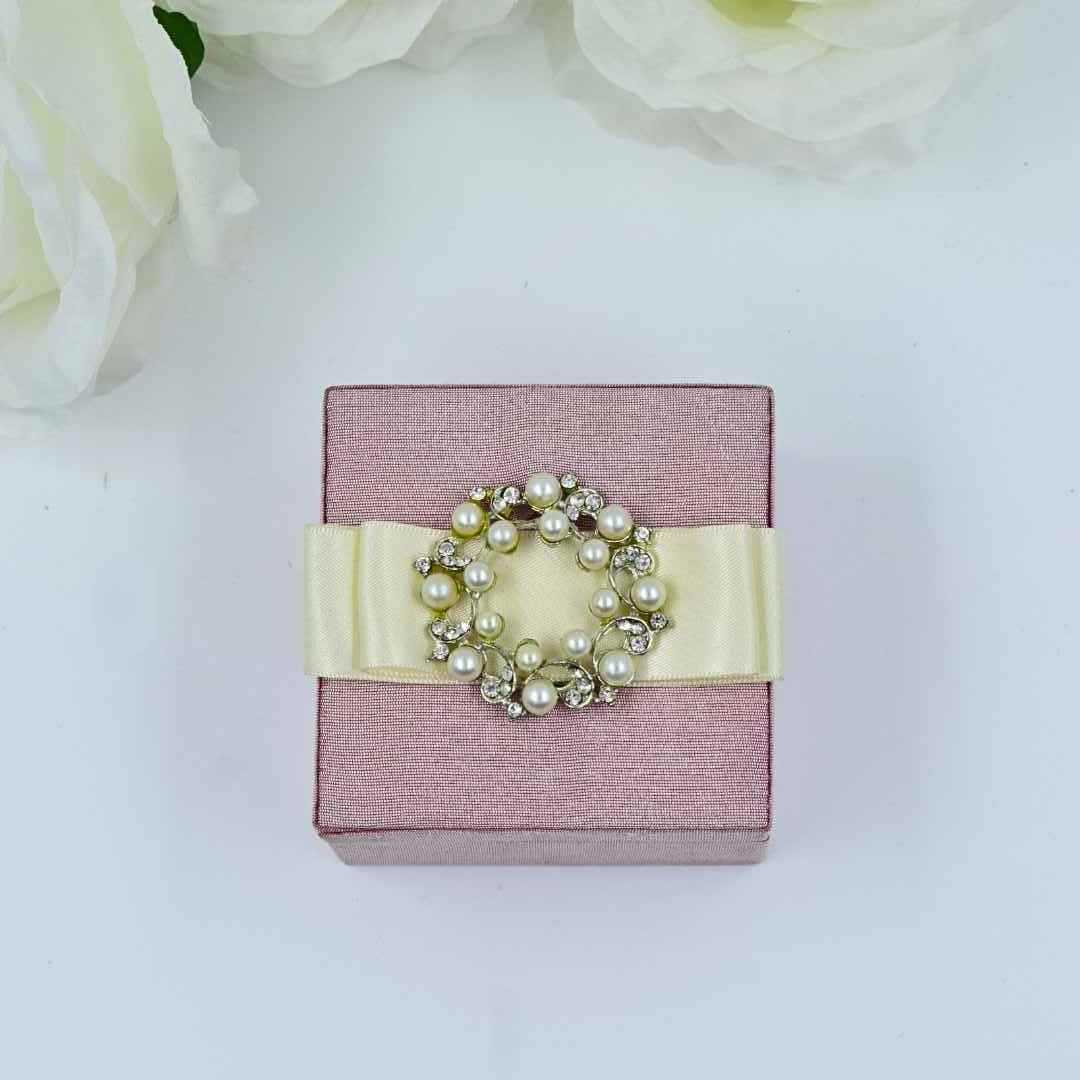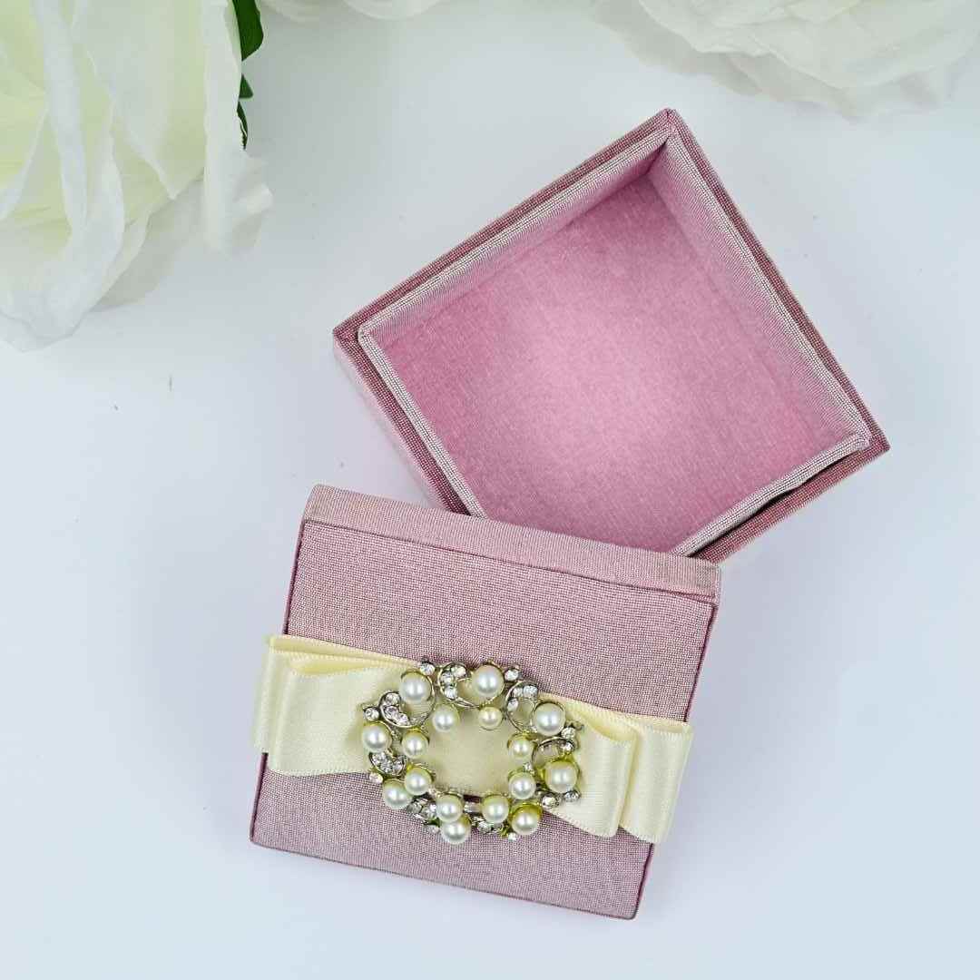 This enchanting blush pink silk wedding party favor box elevates gift-giving to an art form. Crafted from whisper-soft dupioni silk, its removable lid promises a moment of delightful anticipation. A delicate ribbon embraces the box, while a lustrous pearl brooch, surrounded by twinkling rhinestones, adds a touch of timeless romance. It’s not just a favor, but a miniature treasure chest embodying the tender beauty of your celebration.
