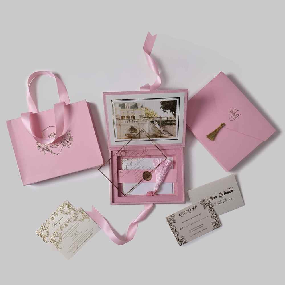 𝕋ℍ𝕀𝕊 𝕃𝕀𝕊𝕋𝕀ℕ𝔾 𝕀ℕℂ𝕃𝕌𝔻𝔼𝕊: A hardboard velvet wedding invitation box with personalized monogram. The box incorporates a foil printed illustration of the wedding venue on the flap inside. This boxed invitation comes with a clear acrylic invite that has silk screen printed details. This velvet wedding invitation suite comes with a ready to ship art paper mailing box and a personalized luxury paper bag for hand delivery of the invitations to your guests.
