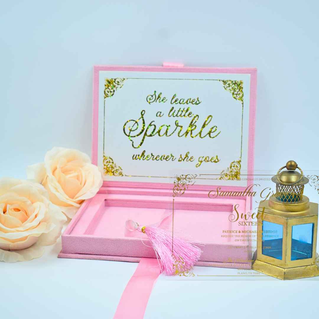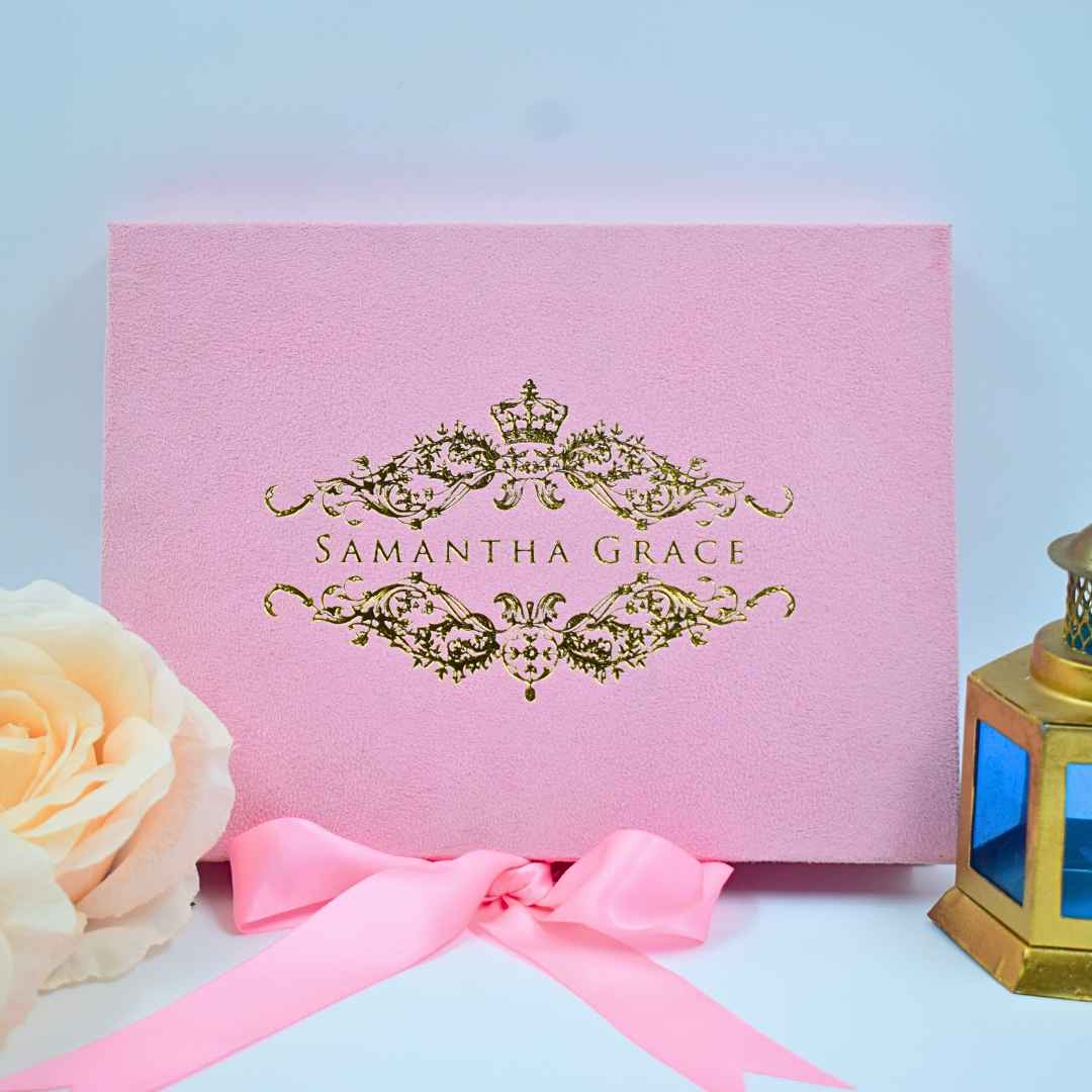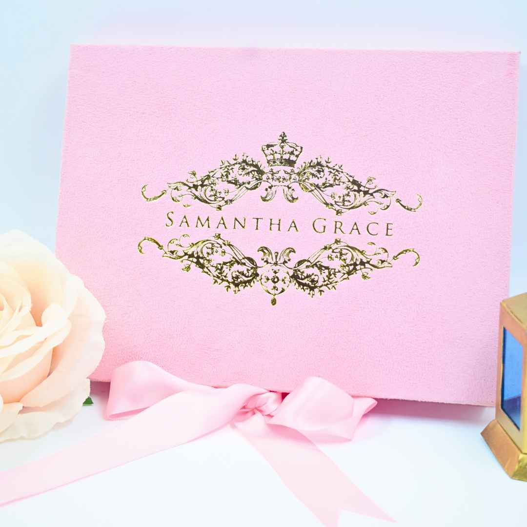 𝕋ℍ𝕀𝕊 𝕃𝕀𝕊𝕋𝕀ℕ𝔾 𝕀ℕℂ𝕃𝕌𝔻𝔼𝕊: A hardboard velvet wedding invitation box with personalized monogram. The box incorporates a foil printed illustration of the wedding venue on the flap inside. This boxed invitation comes with a clear acrylic invite that has silk screen printed details. This velvet wedding invitation suite comes with a ready to ship art paper mailing box and a personalized luxury paper bag for hand delivery of the invitations to your guests.