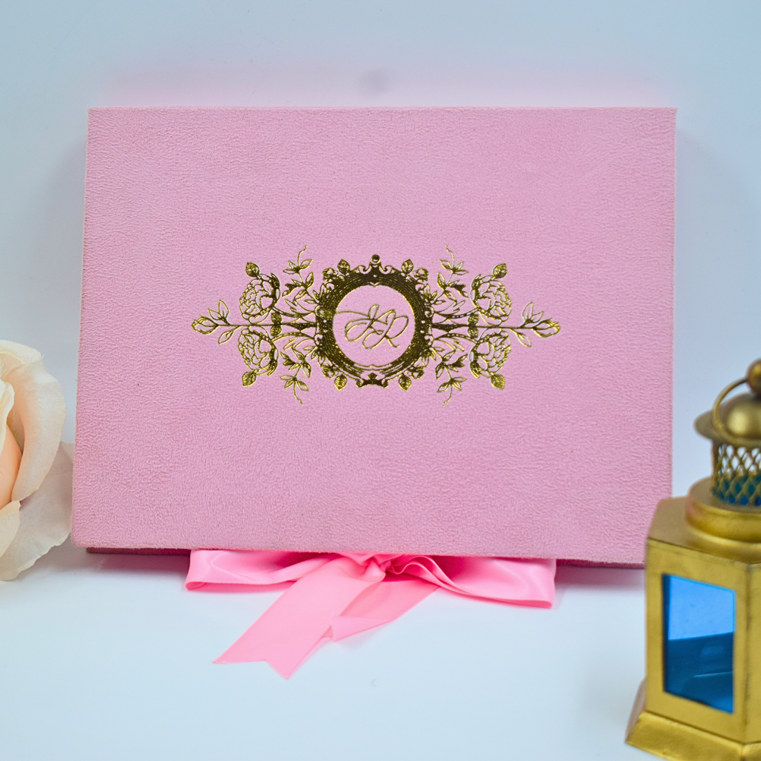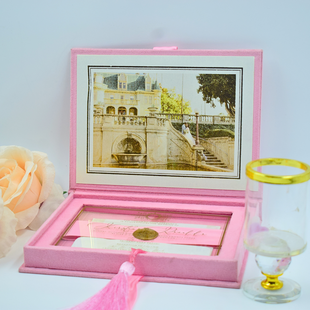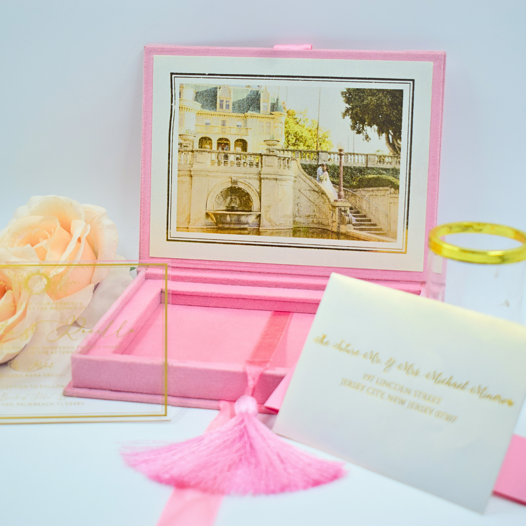 𝕋ℍ𝕀𝕊 𝕃𝕀𝕊𝕋𝕀ℕ𝔾 𝕀ℕℂ𝕃𝕌𝔻𝔼𝕊: A hardboard velvet wedding invitation box with personalized monogram. The box incorporates a foil printed illustration of the wedding venue on the flap inside. This boxed invitation comes with a clear acrylic invite that has silk screen printed details. This velvet wedding invitation suite comes with a ready to ship art paper mailing box and a personalized luxury paper bag for hand delivery of the invitations to your guests.