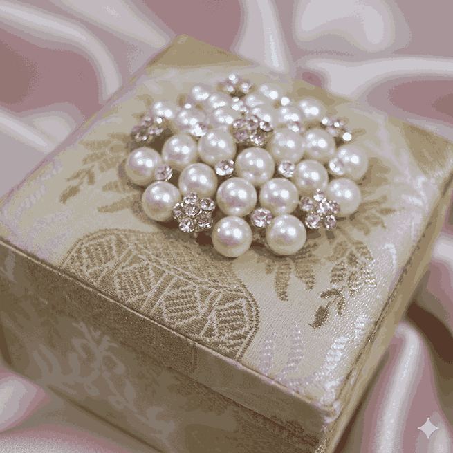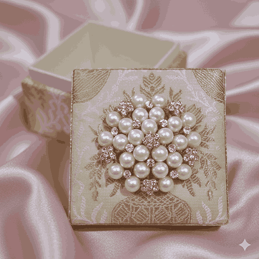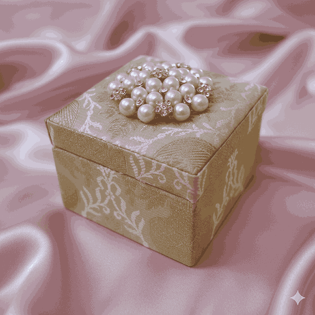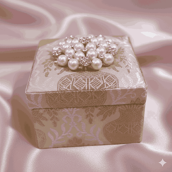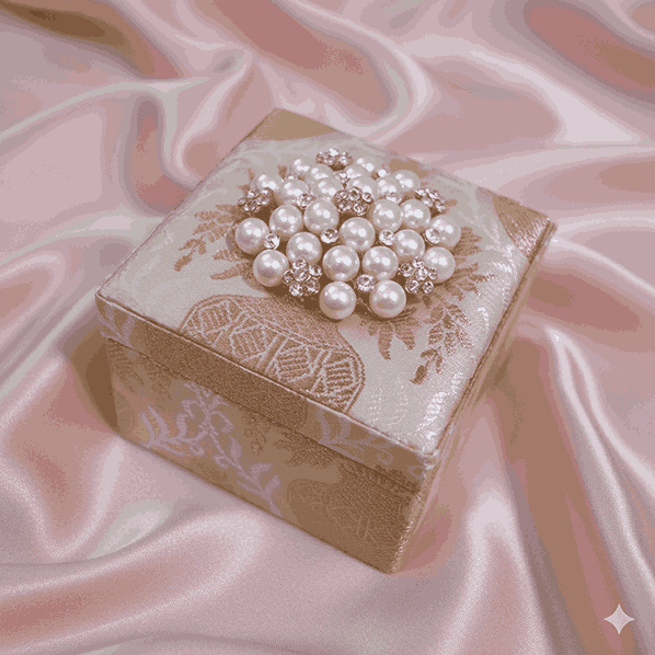 πβππ πππππβπΎ πββπππ»πΌπ: A wedding party favor box wrapped with gold brocade silk and adorned with a glittery pearl brooch embellishment.