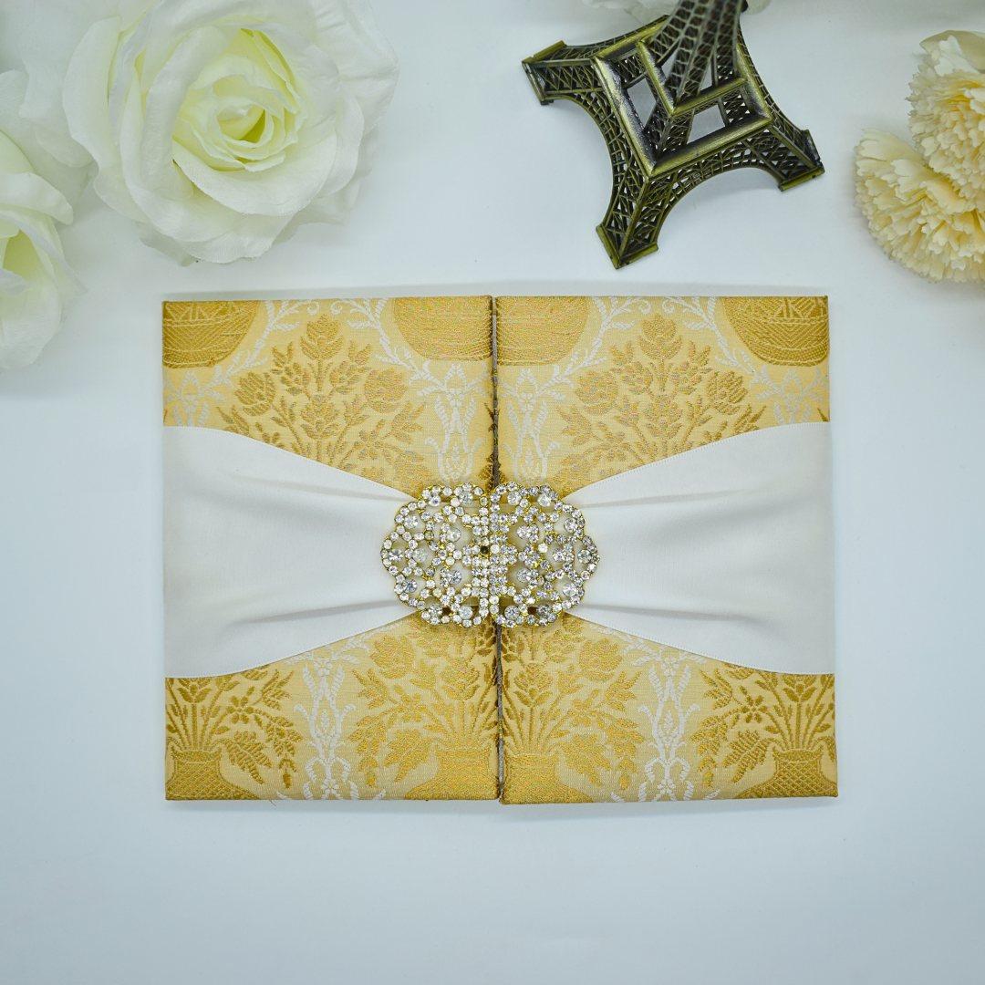 𝕋ℍ𝕀𝕊 𝕃𝕀𝕊𝕋𝕀ℕ𝔾 𝕀ℕℂ𝕃𝕌𝔻𝔼𝕊: A tri-fold wedding invitation folio made from brocade silk and adorned with a a double face satin ribbon sash. This silk folio is embellished with a sparkling crystal rhinestone buckle brooch. This silk wedding invitation folio has a pearl shimmery cardstock invitation insert in the center of the folio that is printed with hot stamp foil. There are two pockets inside the gates of the folio for additional enclosure card inserts.