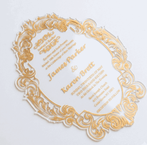 πβππ πππππβπΎ πββπππ»πΌπ: A clear acrylic wedding invitation with laser-cut swirl design details and silk screen printed details.Β This acrylic invitation comes with a cardstock mailing envelope. We can also make this invitation in gold, rose gold and silver mirror acrylic shades.