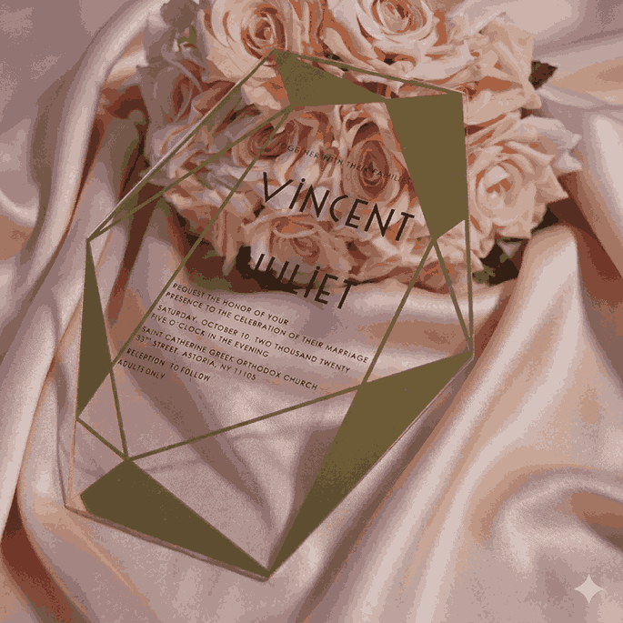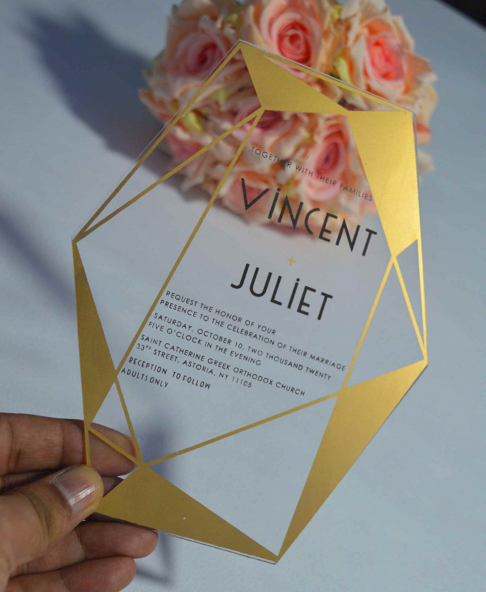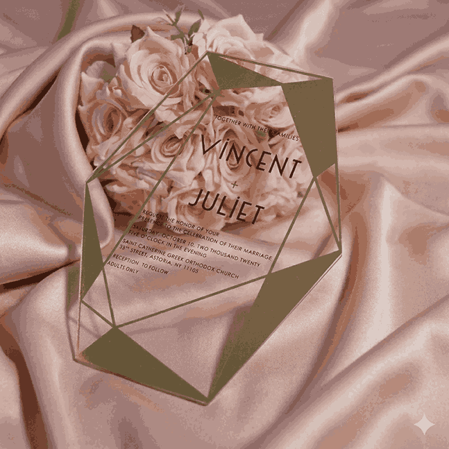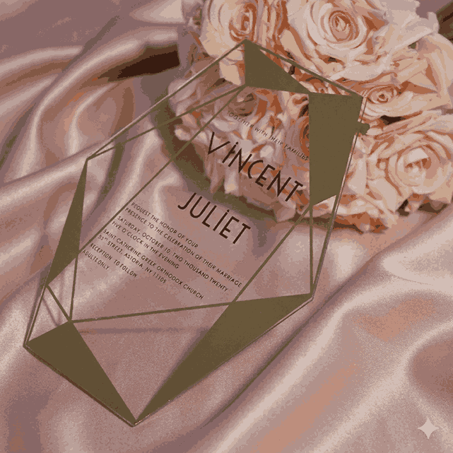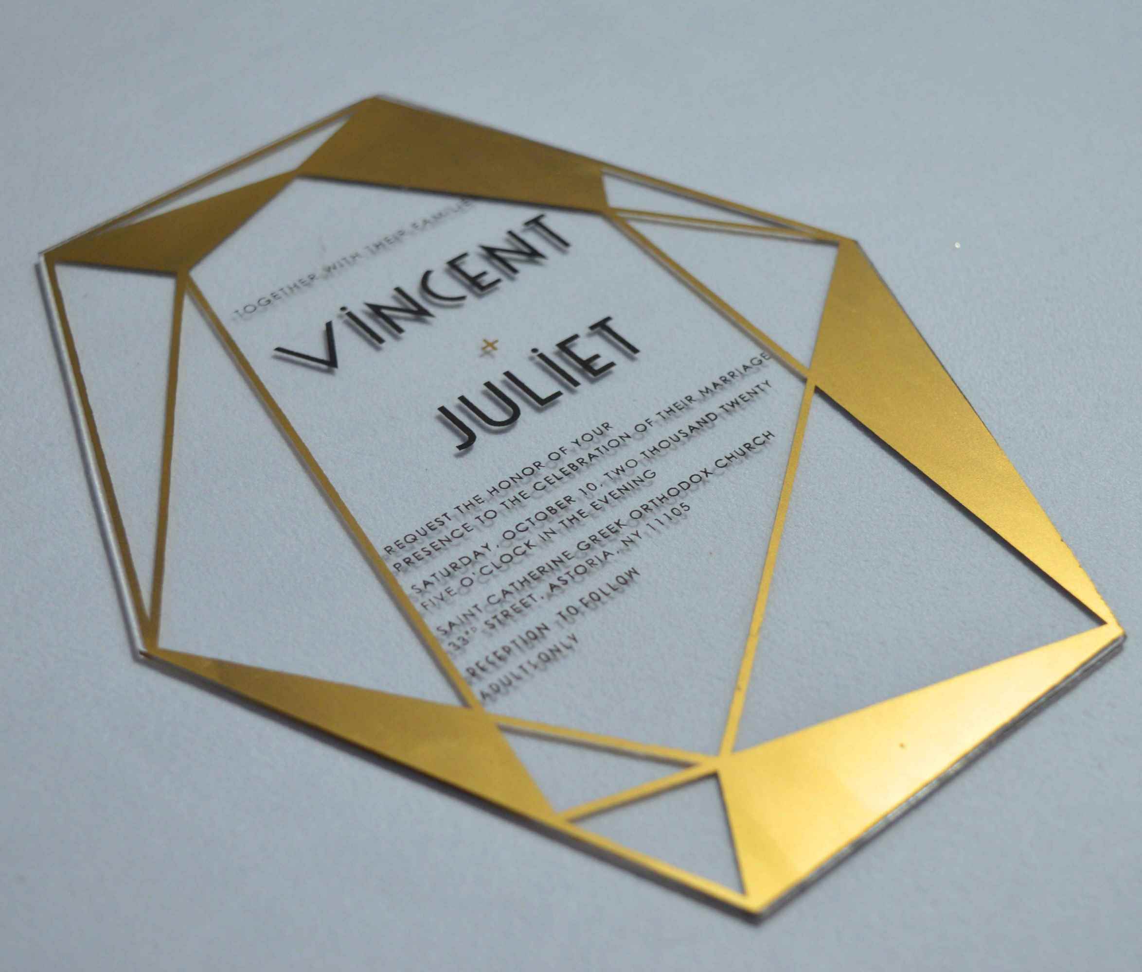 πβππ πππππβπΎ πββπππ»πΌπ: A clear acrylic wedding invitation with laser-cut polygonal shape design and silk screen printed details. This acrylic invite comes with a mailing envelope.