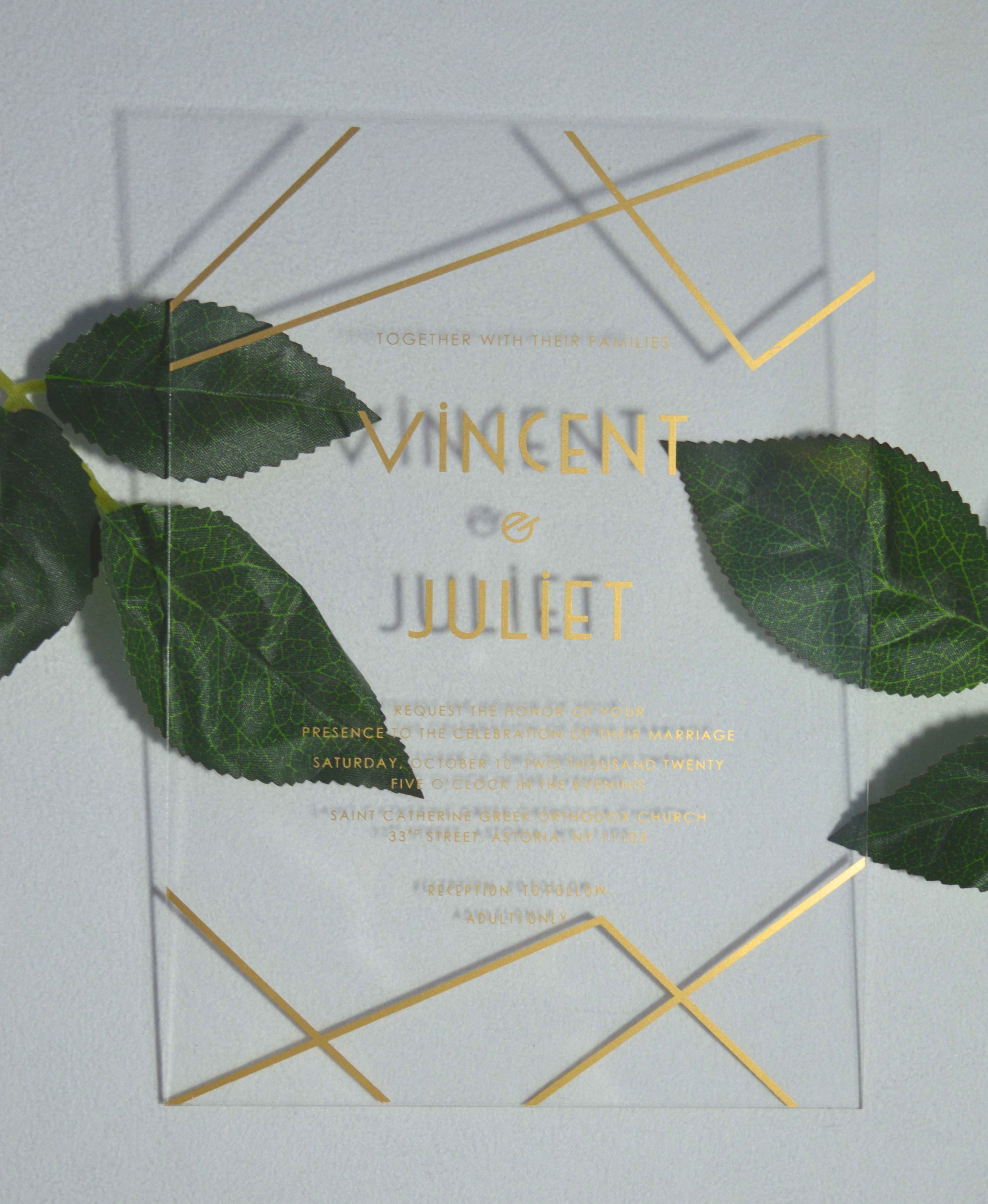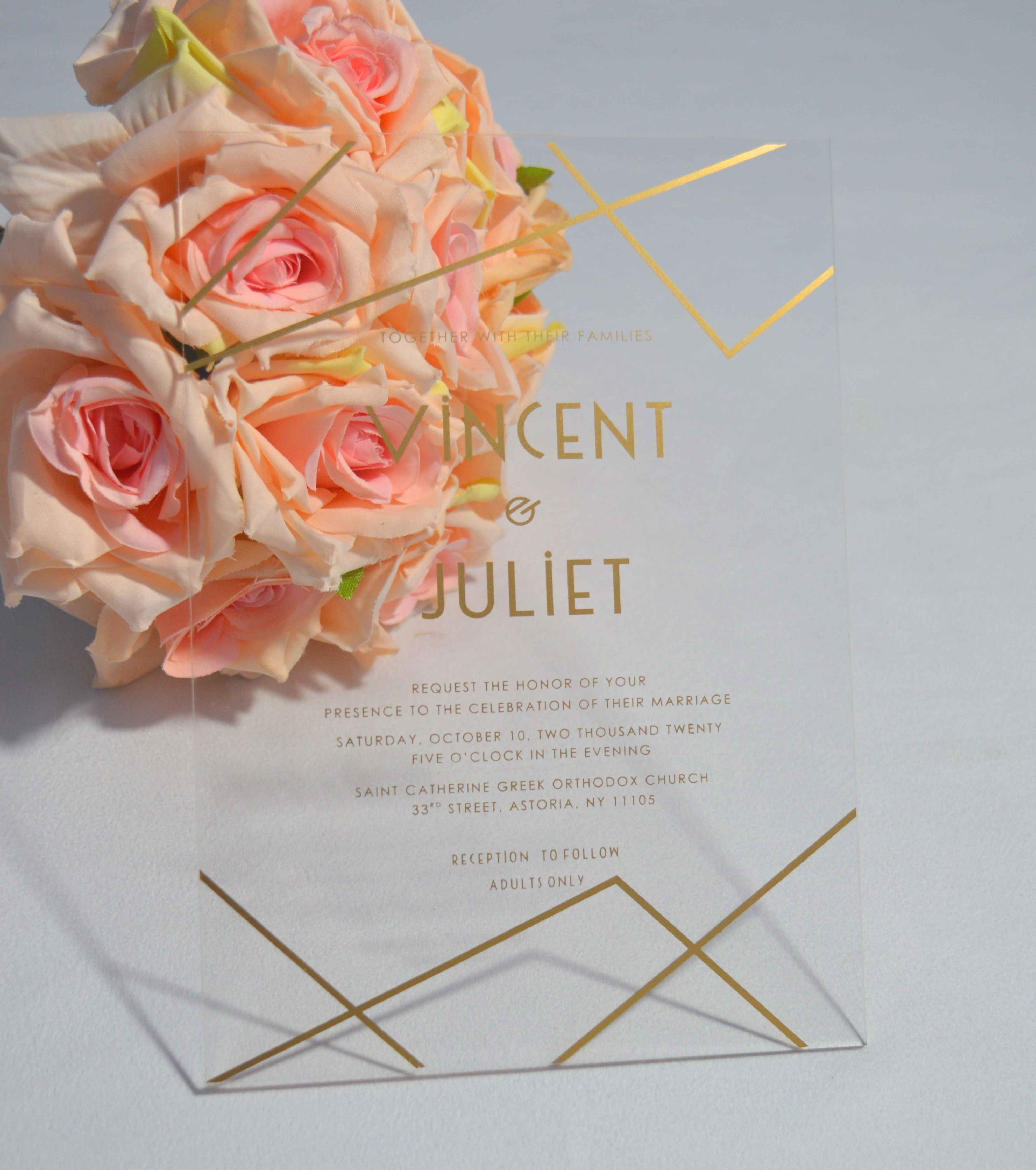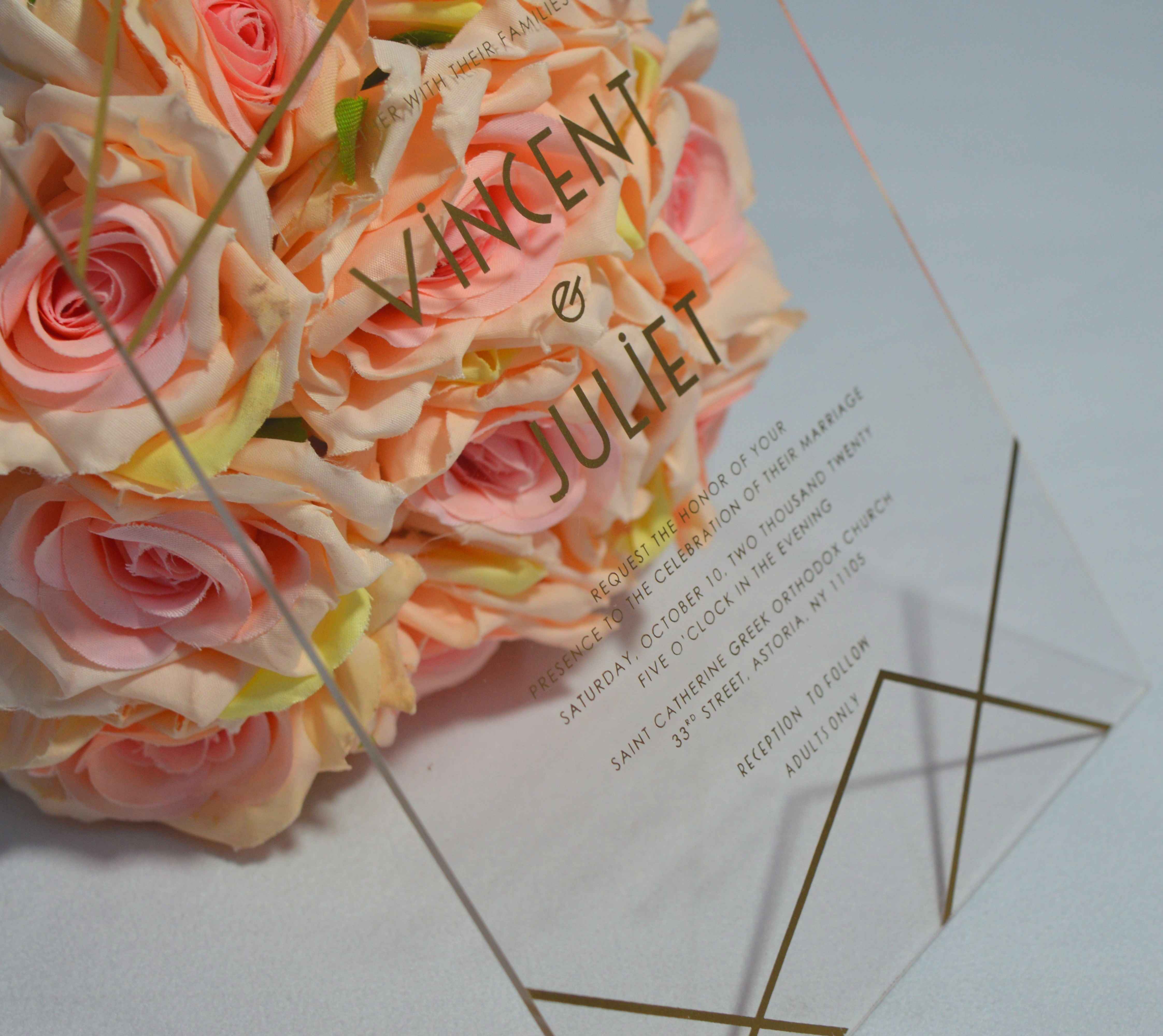πβππ πππππβπΎ πββπππ»πΌπ: A clear acrylic wedding invitation processed with laser-cut in geometric shape. The details are silk screen printed and it comes with a mailing envelope.