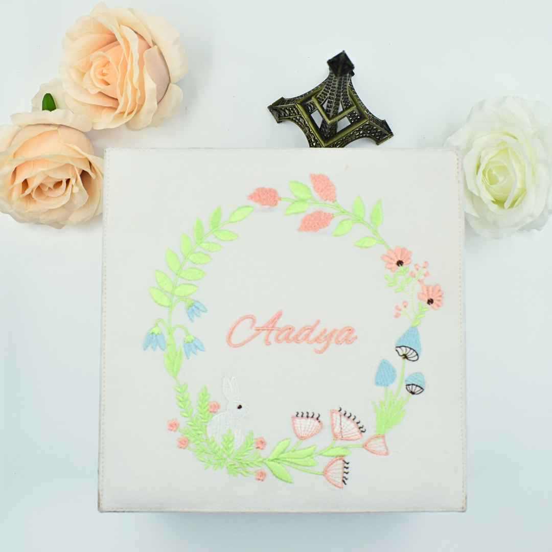 A customized gift packaging box made from MDF wood and finsihed with a pure denim fabric and adorned with a custom embroidered monogram. The box has customized padded cavities to ensure the gift items are delivered secure and safe!