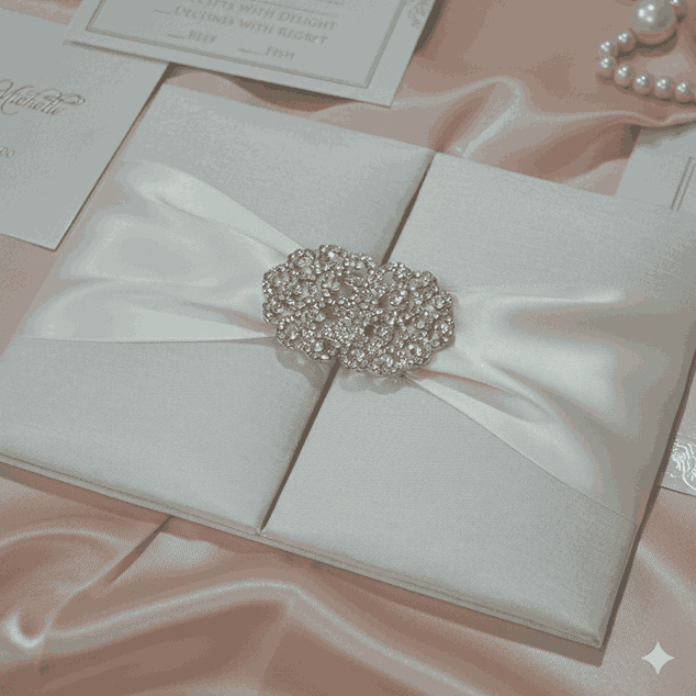 πβππ πππππβπΎ πββπππ»πΌπ: A gate-fold silk wedding invitation folio with a double trim satin ribbon and a crsytal rhinestone brooch. This silk invitation folio comes with a pearl shimmery cardstock invitation insert printed with hot foil. The silk folio invite has two pockets inside for additional enclosure card inserts.