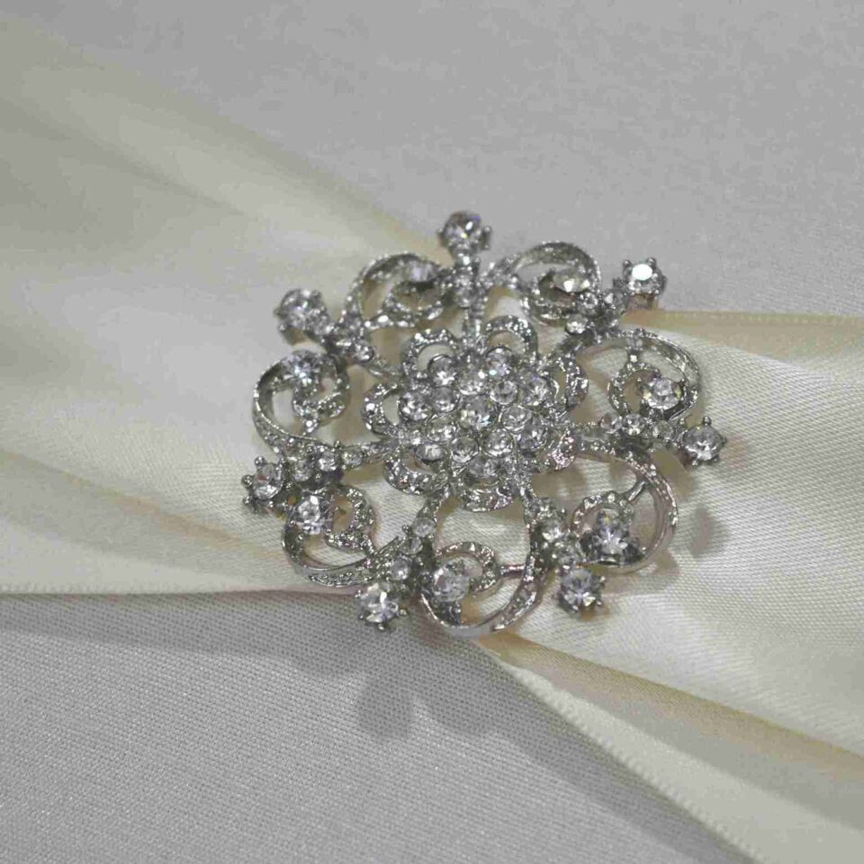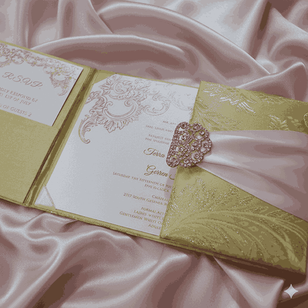 𝕋ℍ𝕀𝕊 𝕃𝕀𝕊𝕋𝕀ℕ𝔾 𝕀ℕℂ𝕃𝕌𝔻𝔼𝕊: A bi-fold silk wedding invitation folio with a shiny pearl brooch adorned on a double trim satin ribbon. This silk folio has a pearl shimmery cardstock invitation insert added on the lower part and the upper part has a pocket for additional enclosure insert cards.