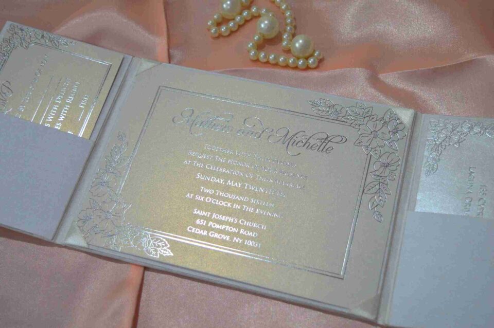 π•‹β„π•€π•Š π•ƒπ•€π•Šπ•‹π•€β„•π”Ύ π•€β„•β„‚π•ƒπ•Œπ”»π”Όπ•Š: A bi-fold dupioni silk wedding invitation folio. This silk folio invitation has a double trim satin ribbon and has a starfish rhinestone embellishment. The wedding invite comes with a pearl shimmery cardstock invitation insert printed with hot foil details.