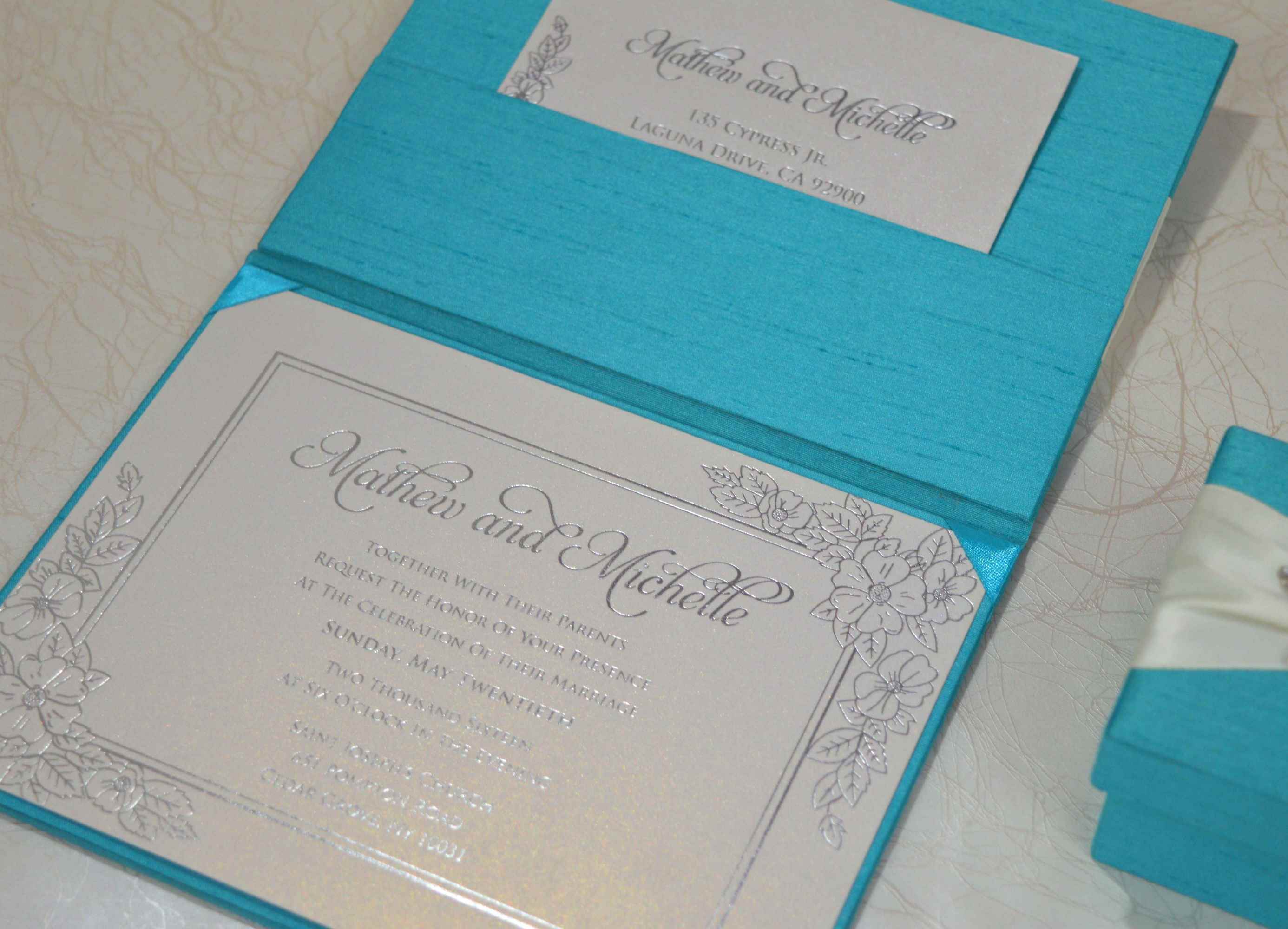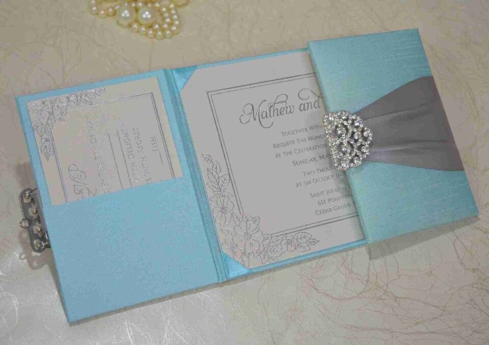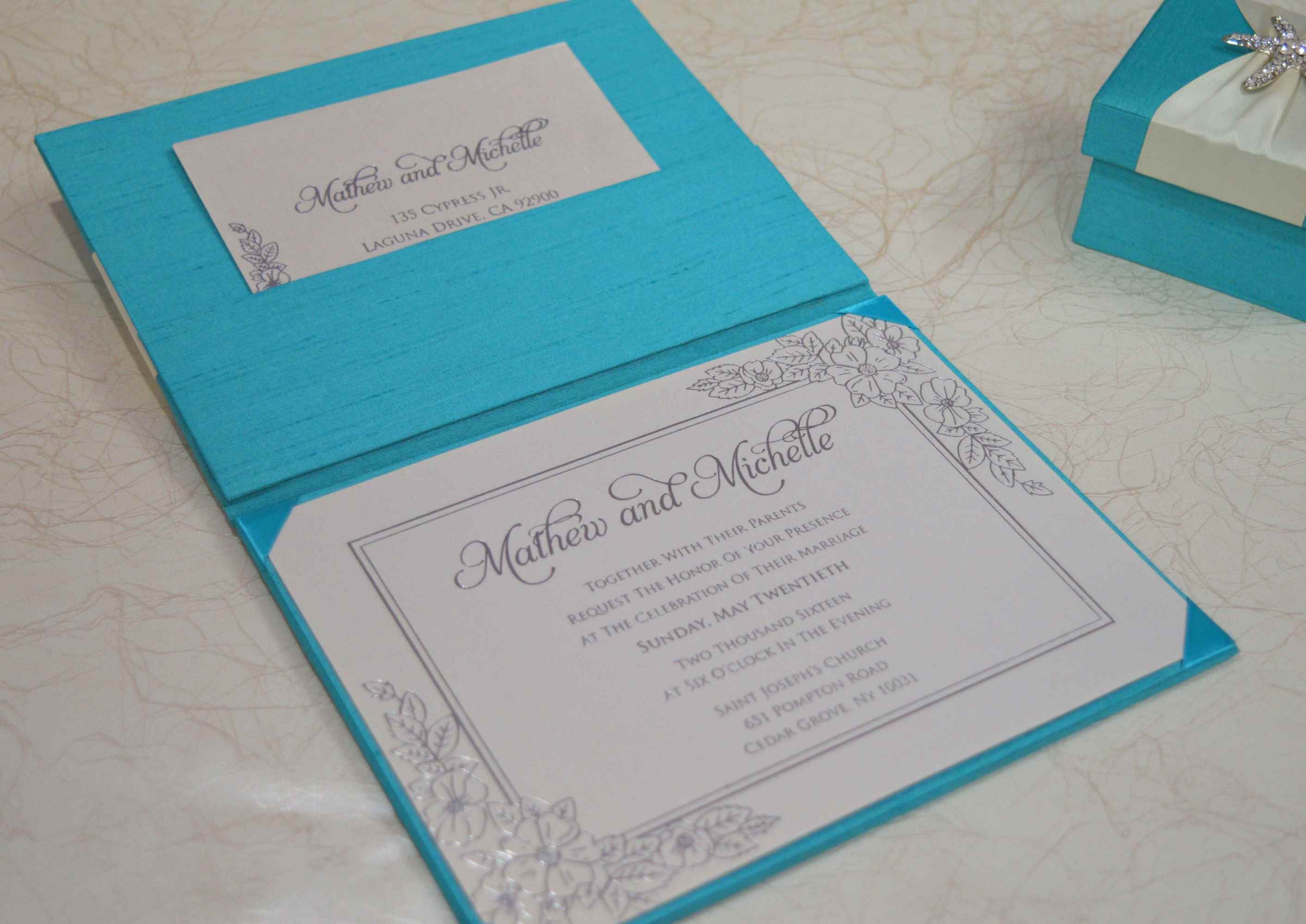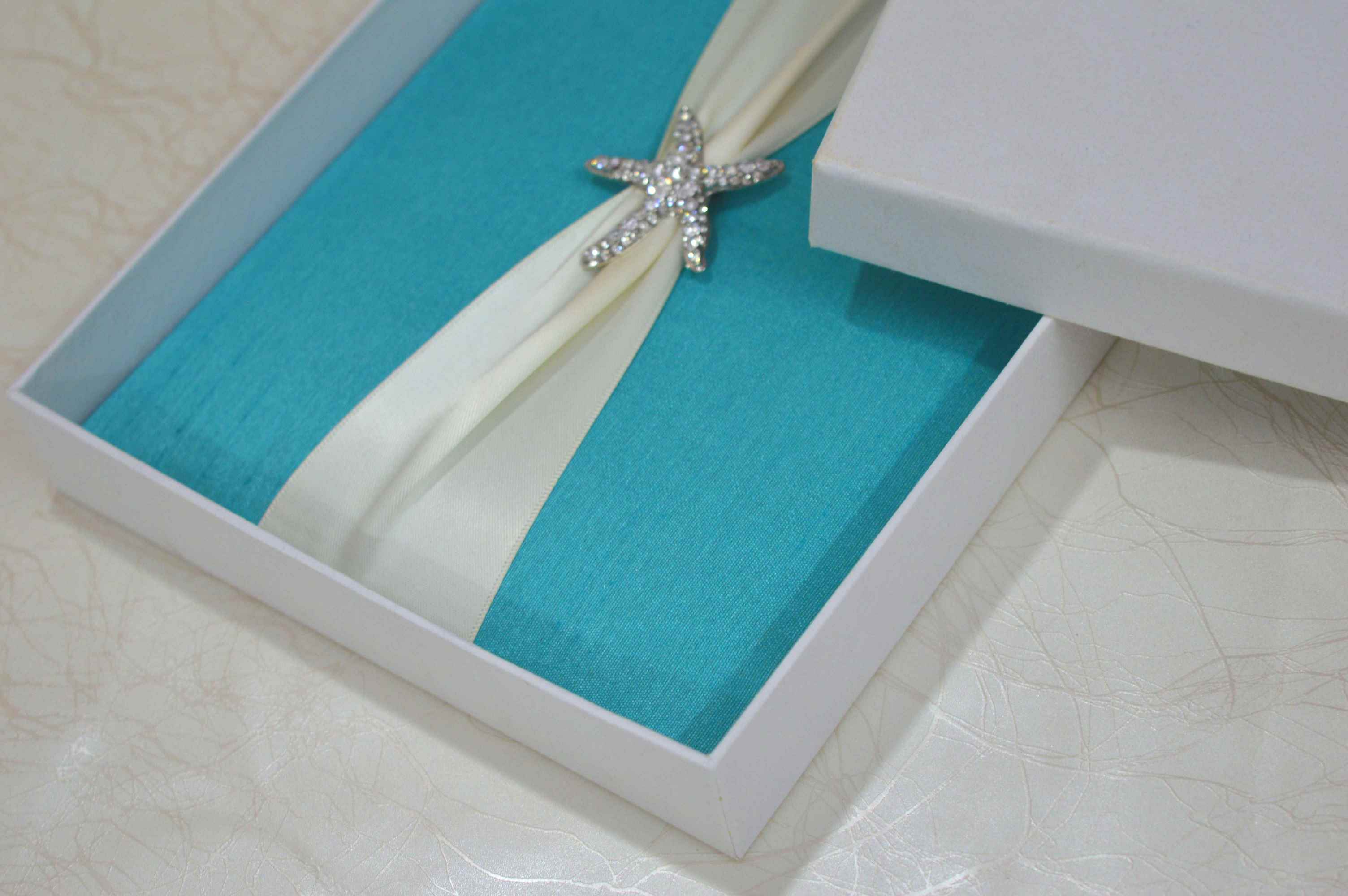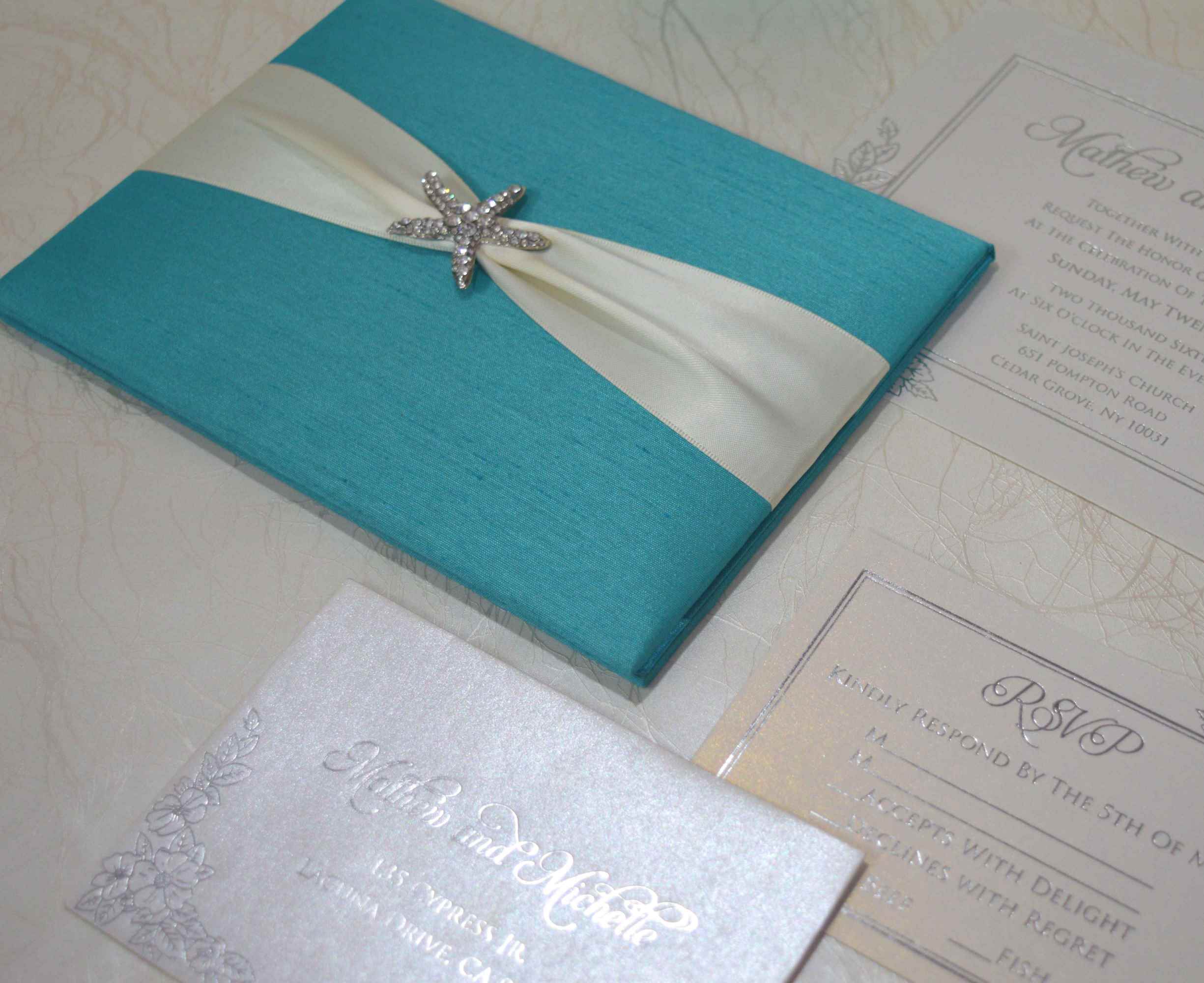 A beautiful dupioni silk wedding invitation folio. This elegant invitation is totally hand-made with starfish rhinestone embellishment.