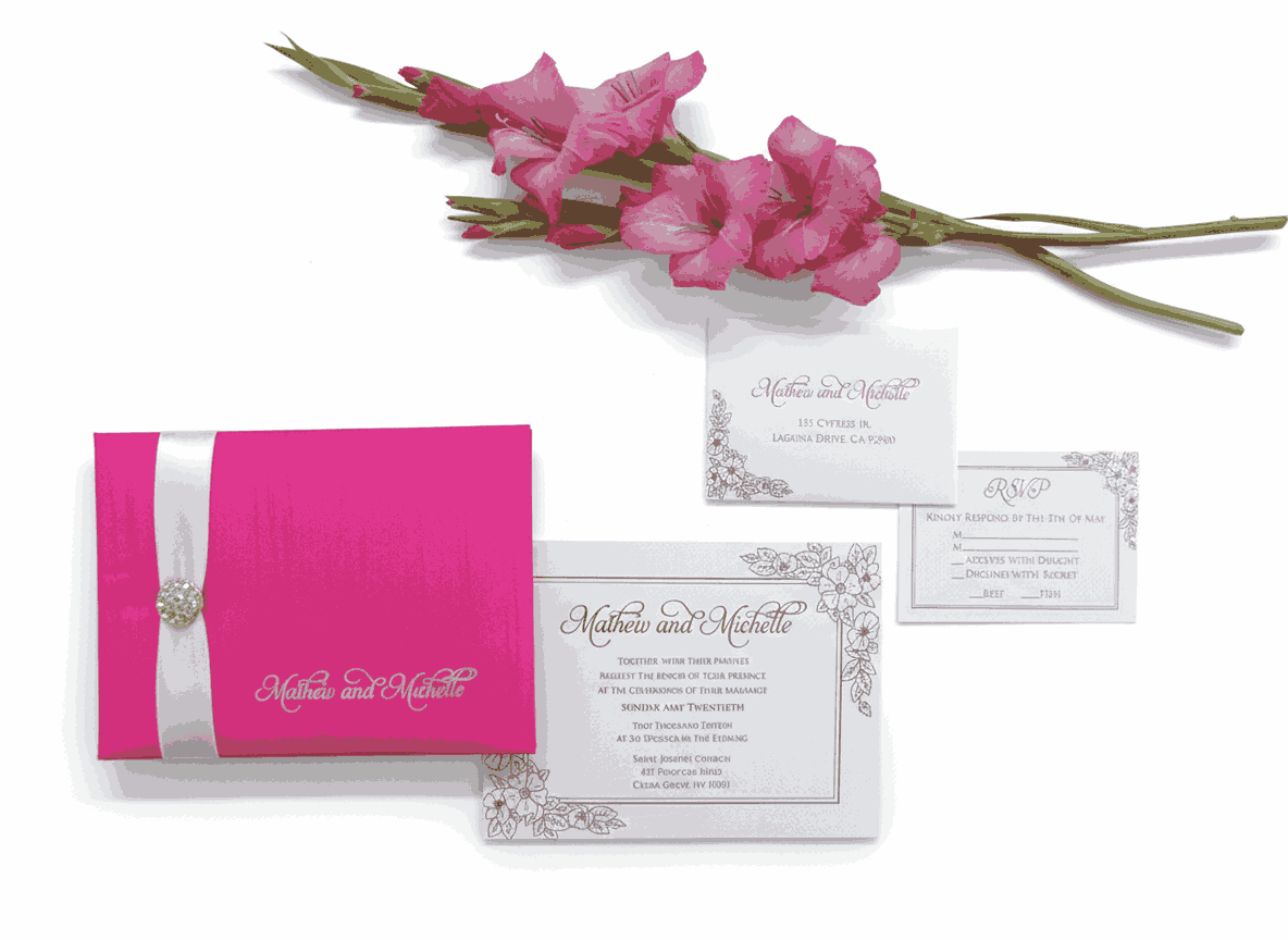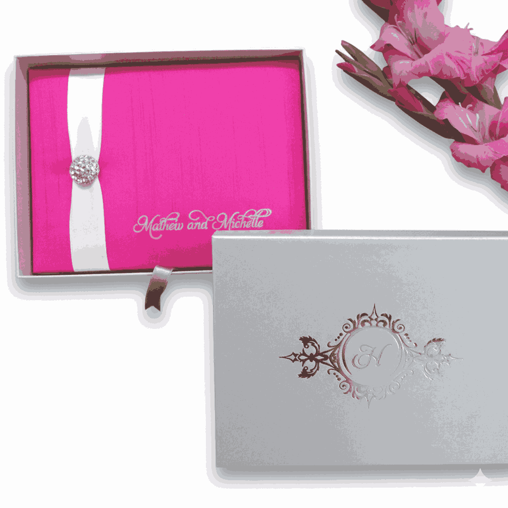 πβππ πππππβπΎ πββπππ»πΌπ: A hot pink silk bi-fold wedding invitation folio embellished with a crystal rhinestone brooch on a double face satin ribbon. This silk folio comes with a pearl shimmery cardstock invitation insert with foiled details.