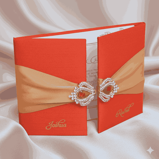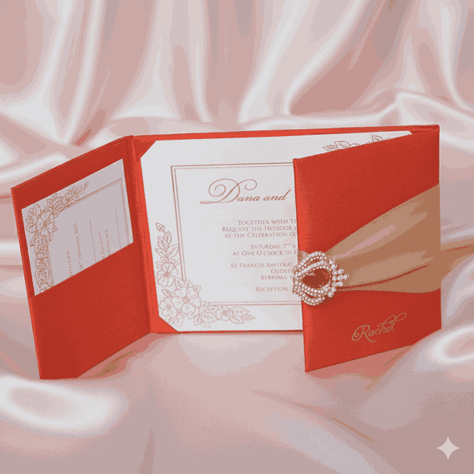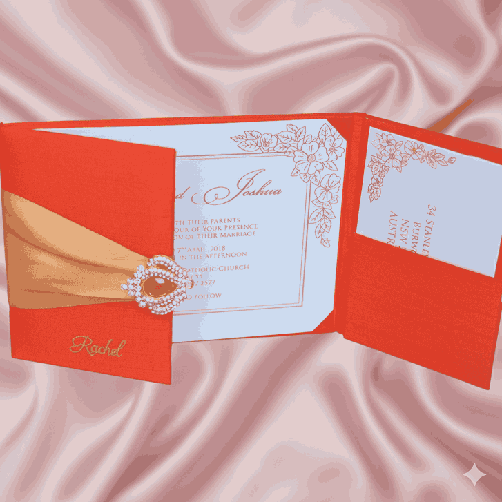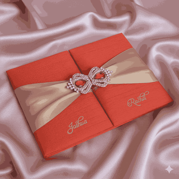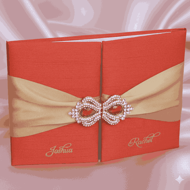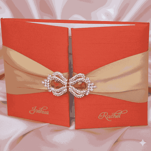 πβππ πππππβπΎ πββπππ»πΌπ: A gate-fold dupioni silk wedding invitation folio with double trim satin ribbon and sparklingly crystal rhinestones buckle. This folio invitation can be customized with hot-foiled names. This silk folio comes with a hot foil printed pearl shimmery cardstock invitation insert. There are two pockets inside the gates for additional enclosure cards.