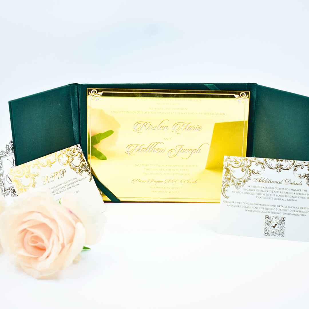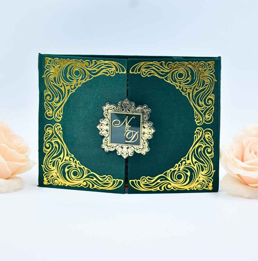 This emerald green satin wedding invitation folio commands attention with its luxurious allure. The gate-fold design unfolds like a majestic curtain, revealing hot-foiled artistry that dances across the sumptuous satin. A bespoke acrylic & electroplated monogram crowns the ensemble, adding a contemporary twist to timeless elegance. Inside, a hot foil-printed cardstock insert nestles in silky splendor, heralding a celebration fit for royalty.