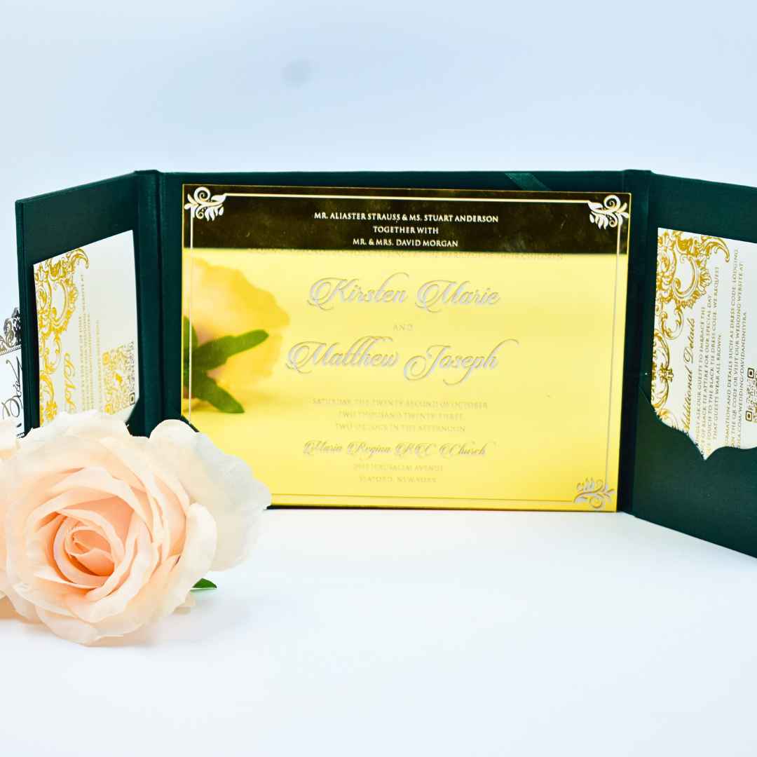 𝕋ℍ𝕀𝕊 𝕃𝕀𝕊𝕋𝕀ℕ𝔾 𝕀ℕℂ𝕃𝕌𝔻𝔼𝕊: A gate-fold wedding invitation folio with a custom acrylic & electroplated monogram. Inside the center of this folio invitation, there is a pearl shimmery cardstock with foil print & has pockets on both gates for additional enclosure cards.