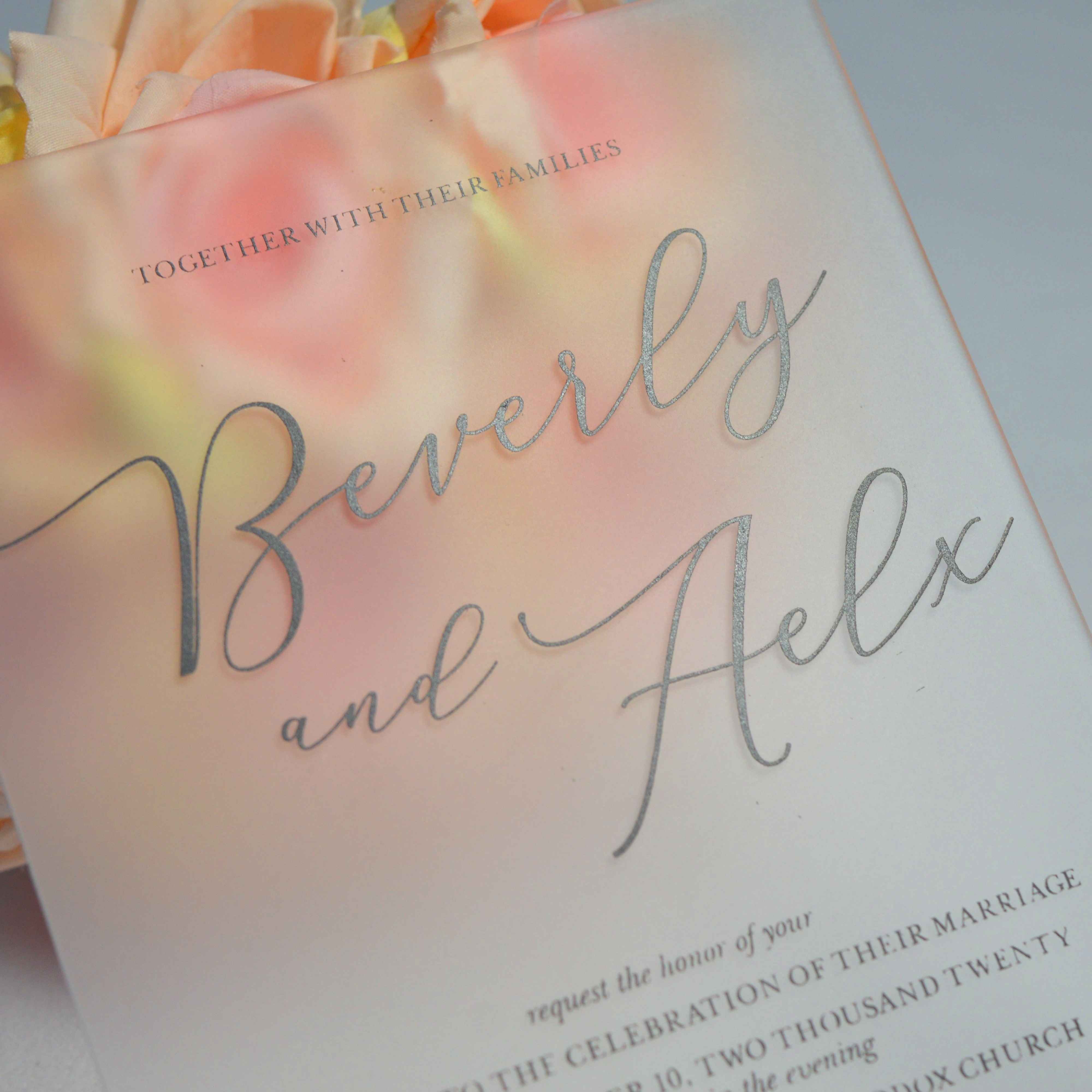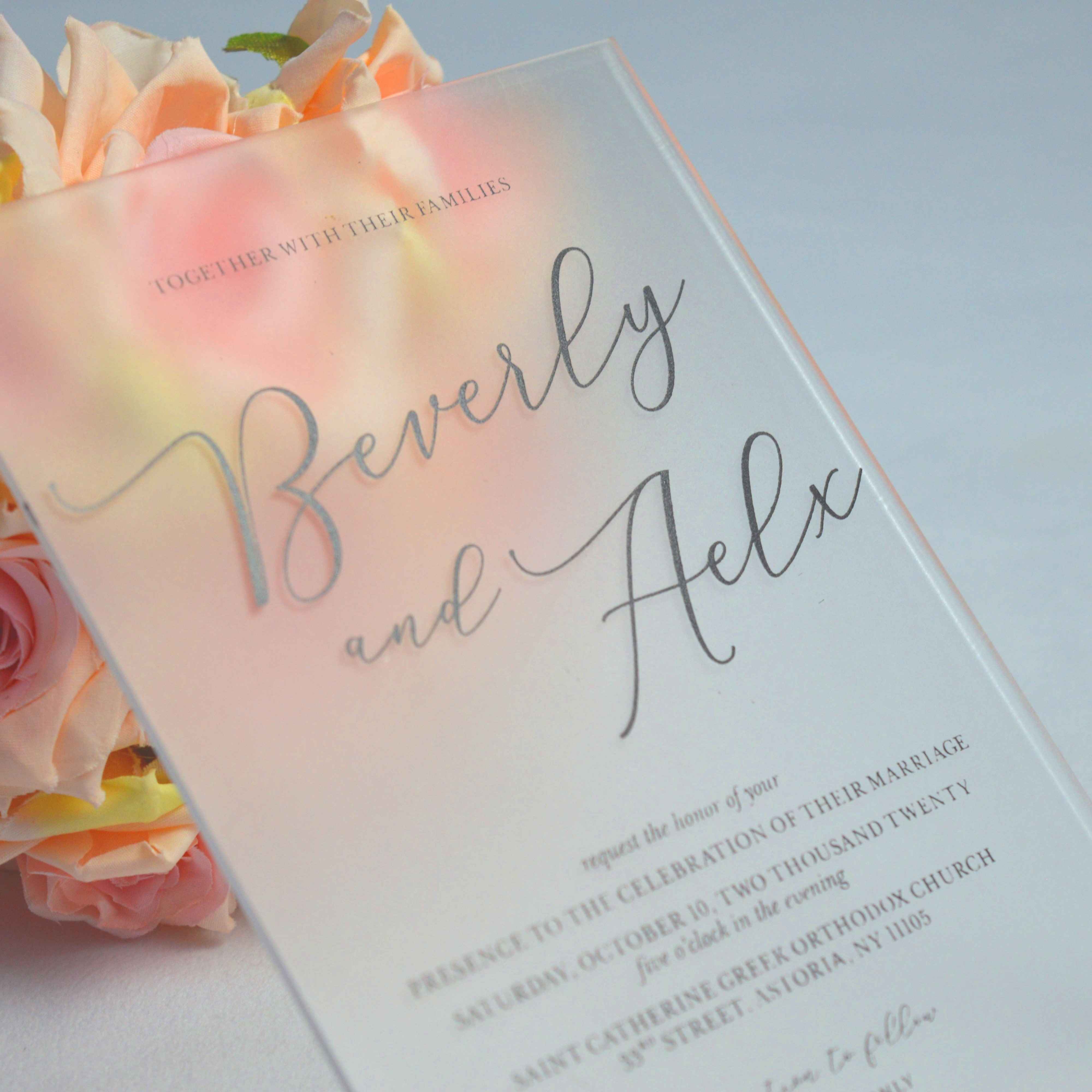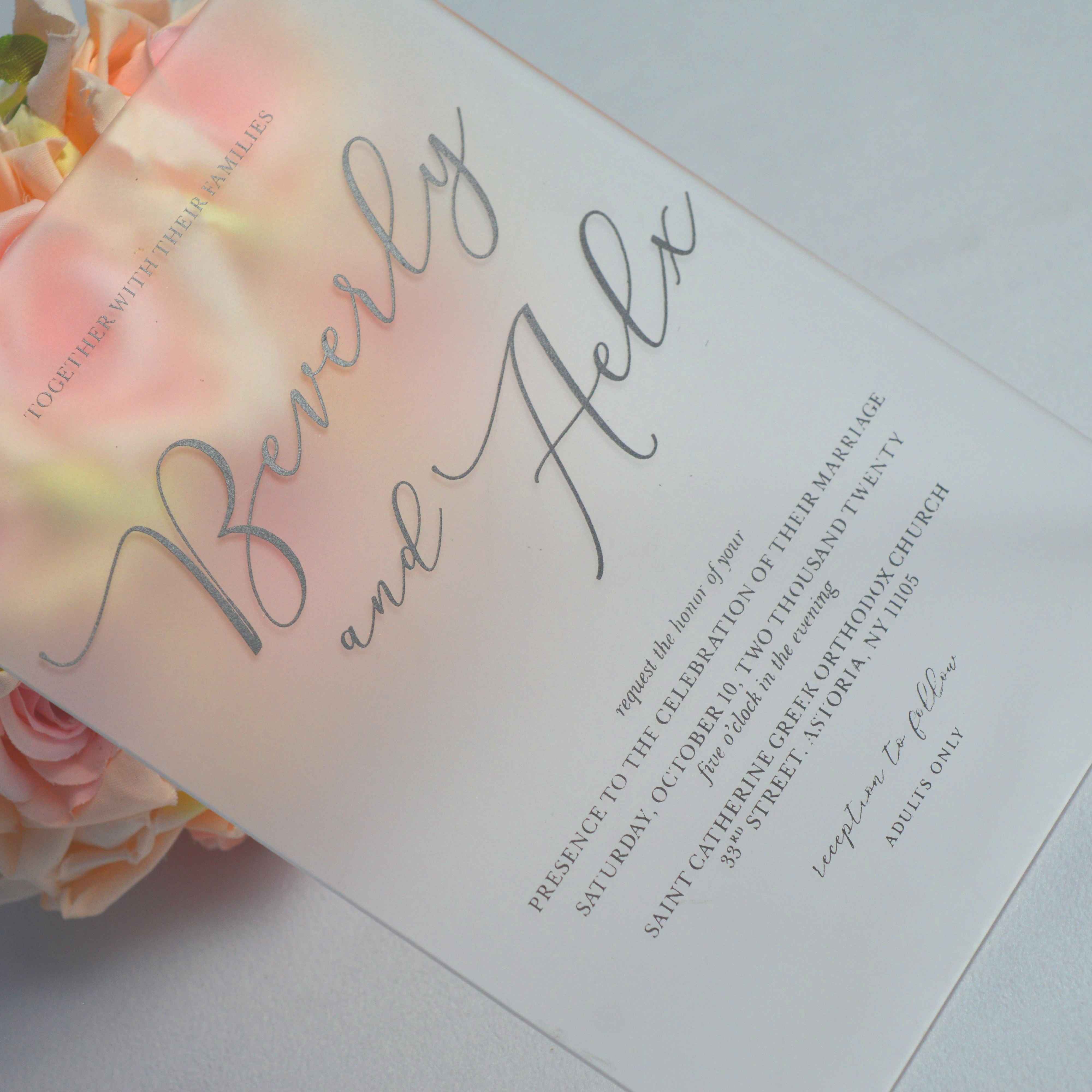 πβππ πππππβπΎ πββπππ»πΌπ: A frosted acrylic wedding invitation with silk screen printed details and a mailing envelope.