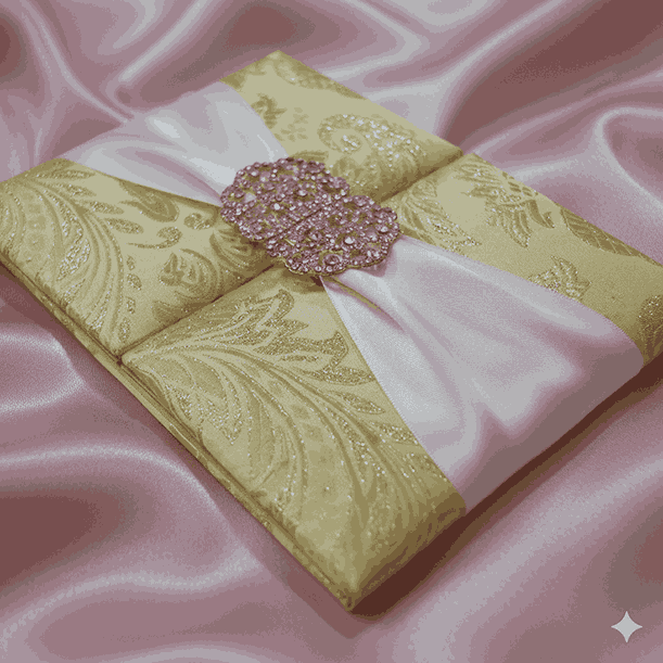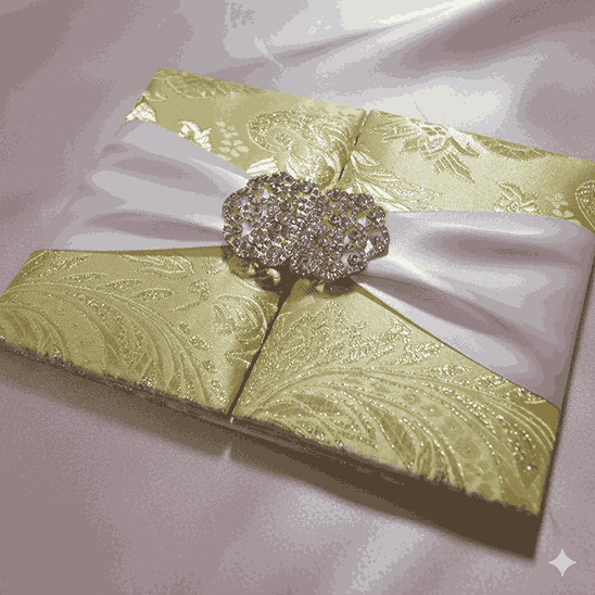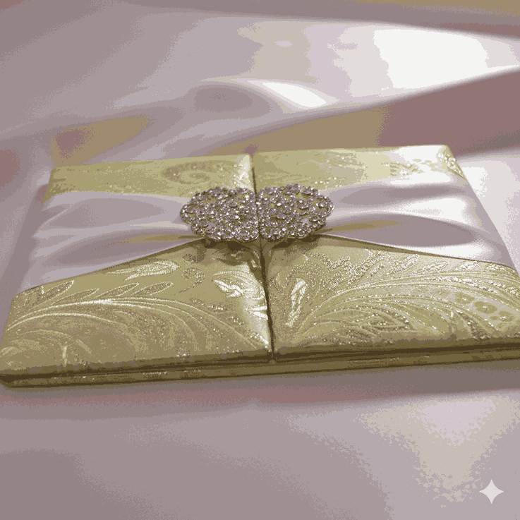 πβππ πππππβπΎ πββπππ»πΌπ: A gate-fold brocade silk wedding invitation folio with a double trim satin ribbon embellished with a crystal rhinestone buckle brooch. The silk folio has a pearl shimmery cardstock invitation insert in the center inside printed with hot foil. Both the gates inside have pockets for additional enclosure card inserts.