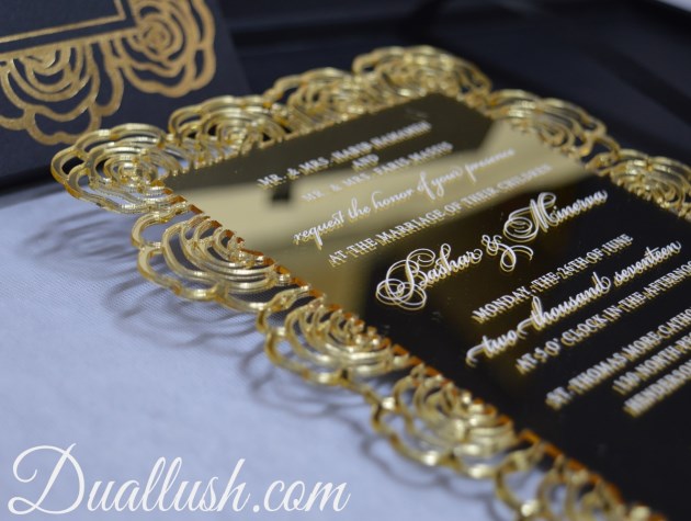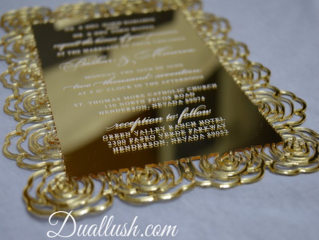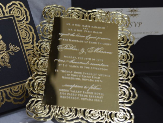 πβππ πππππβπΎ πββπππ»πΌπ: A gold mirror acrylic wedding invitation, trimed to beautiful details with laser-cut roses artwork. This acrylic invitation has silk-screen printed details and it comes with a mailing envelope.
