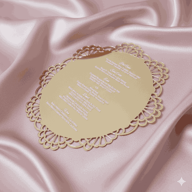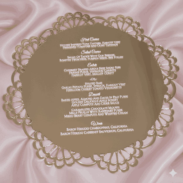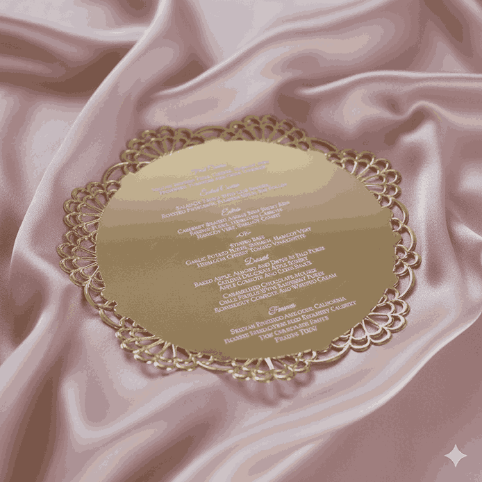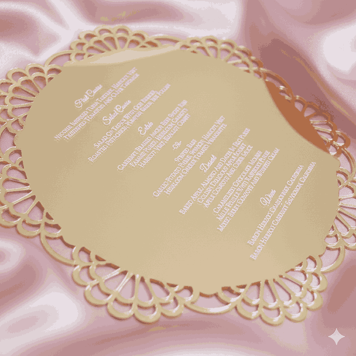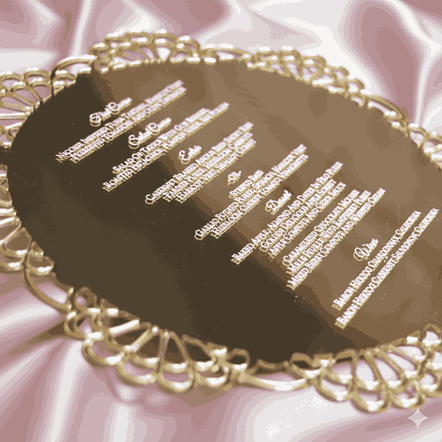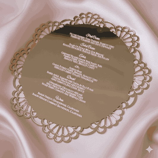 πβππ πππππβπΎ πββπππ»πΌπ: A round gold mirror acrylic wedding dinner menu with floral laser-cut details and silk screen printing.