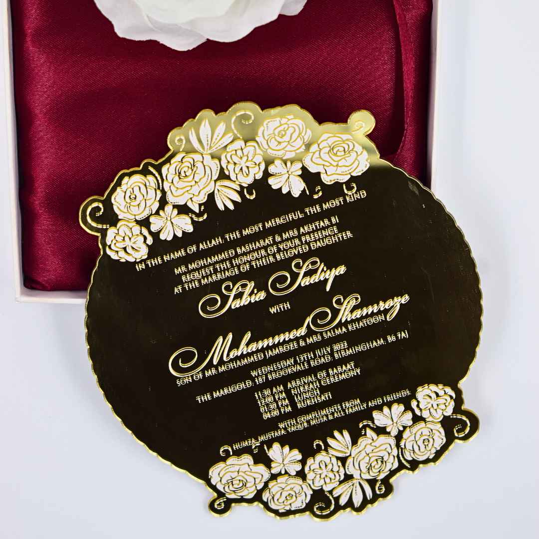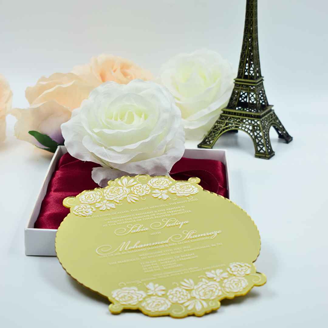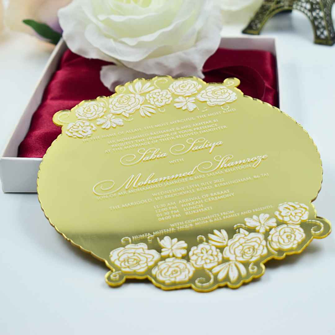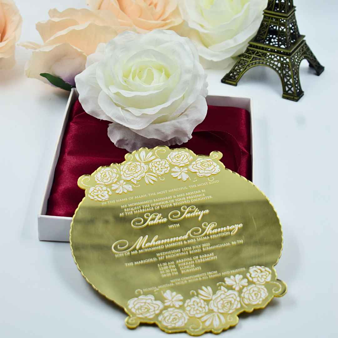 𝕋ℍ𝕀𝕊 𝕃𝕀𝕊𝕋𝕀ℕ𝔾 𝕀ℕℂ𝕃𝕌𝔻𝔼𝕊: A mirror acrylic invitation with laser-cut design and silk screen printed details. This mirrored acrylic invitation comes with a mailing envelope.
