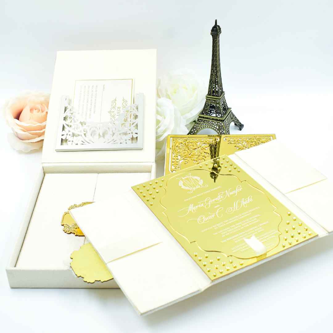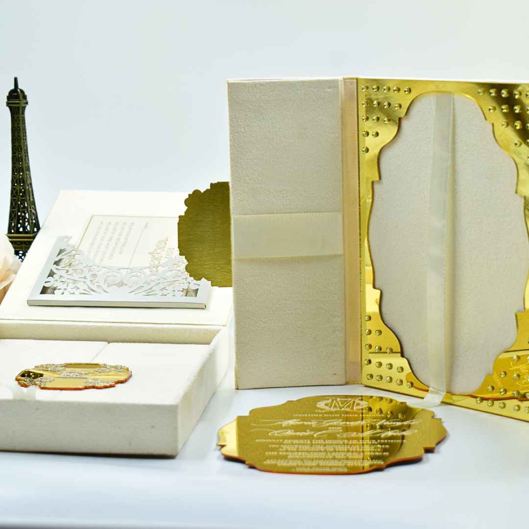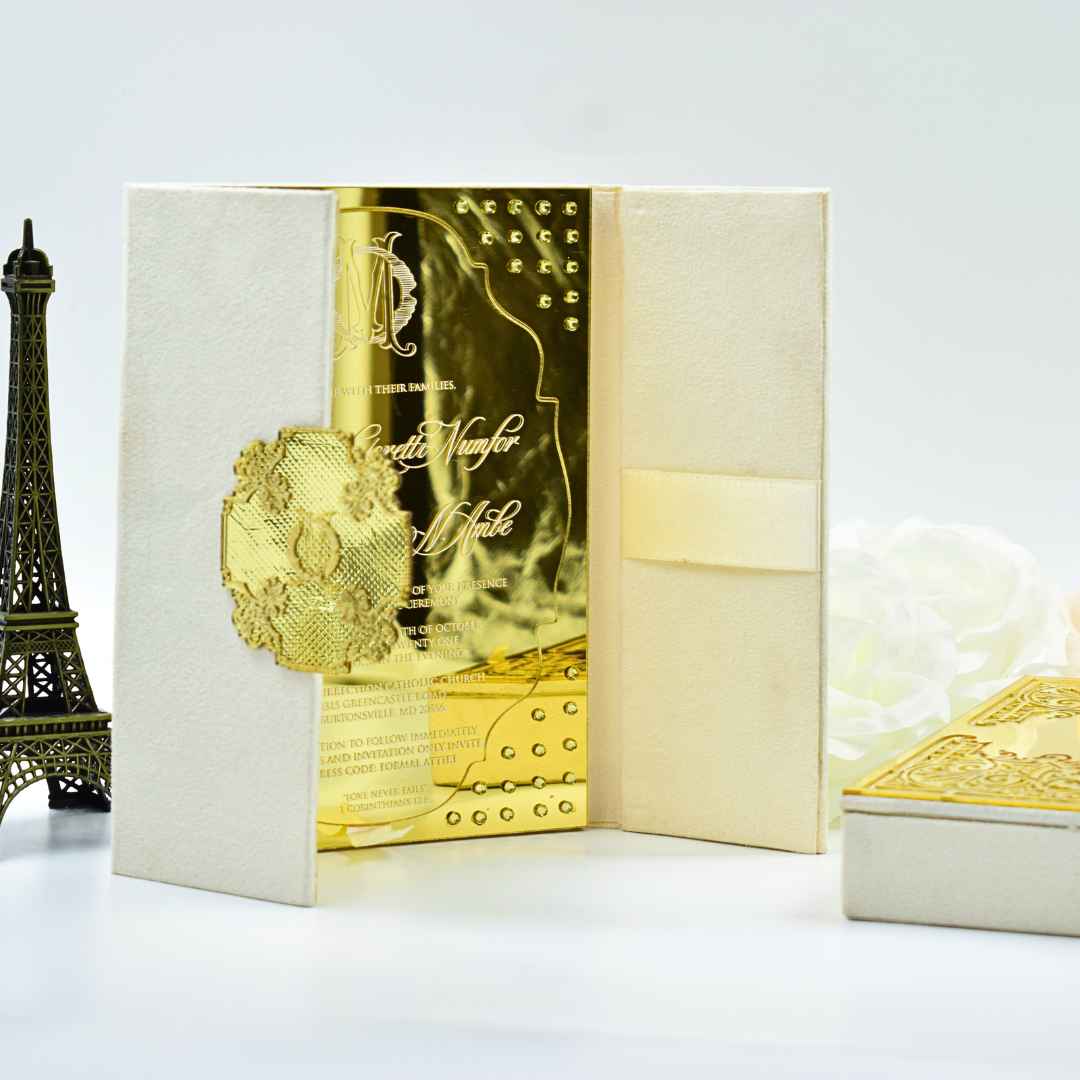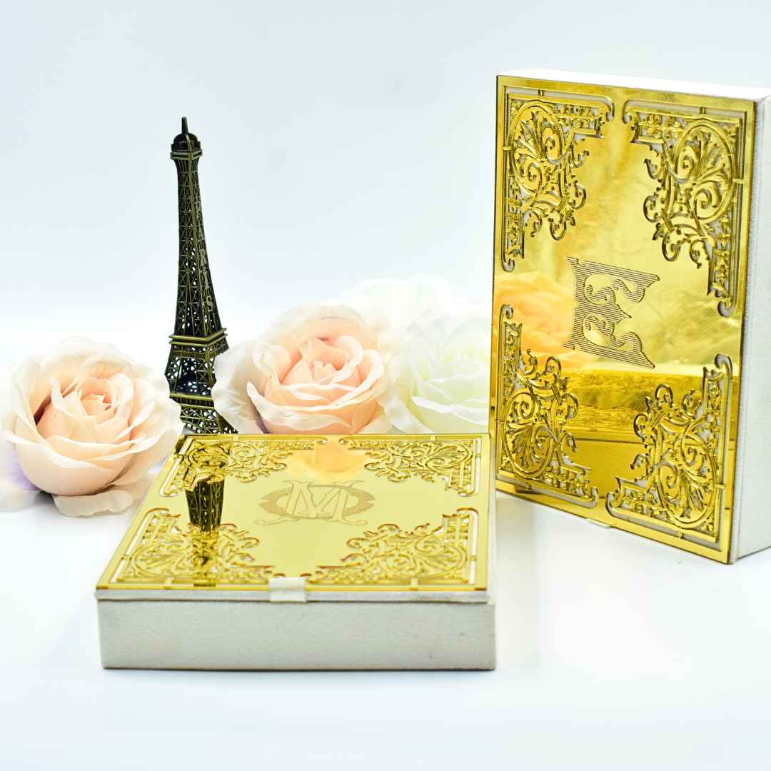 𝕋ℍ𝕀𝕊 𝕃𝕀𝕊𝕋𝕀ℕ𝔾 𝕀ℕℂ𝕃𝕌𝔻𝔼𝕊: A beautiful velvet wedding invitation box with engraved mirror acrylic top with an electroplated custom monogram. The box comes with a velvet bi-fold folio with a mirrored acrylic and electroplated monogram. Further, the folio has a mirrored acrylic invitation inside adorned with rhinestones. This wedding invitation box has a laser cut designed pocket on the lid for additional enclosure card inserts. This invitation comes inside a hardboard mailing box.
