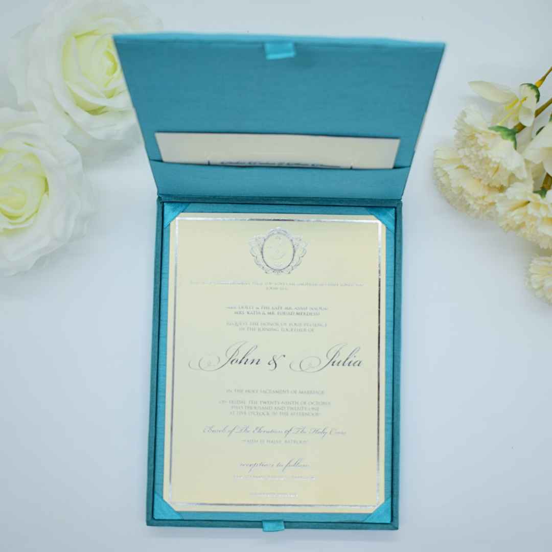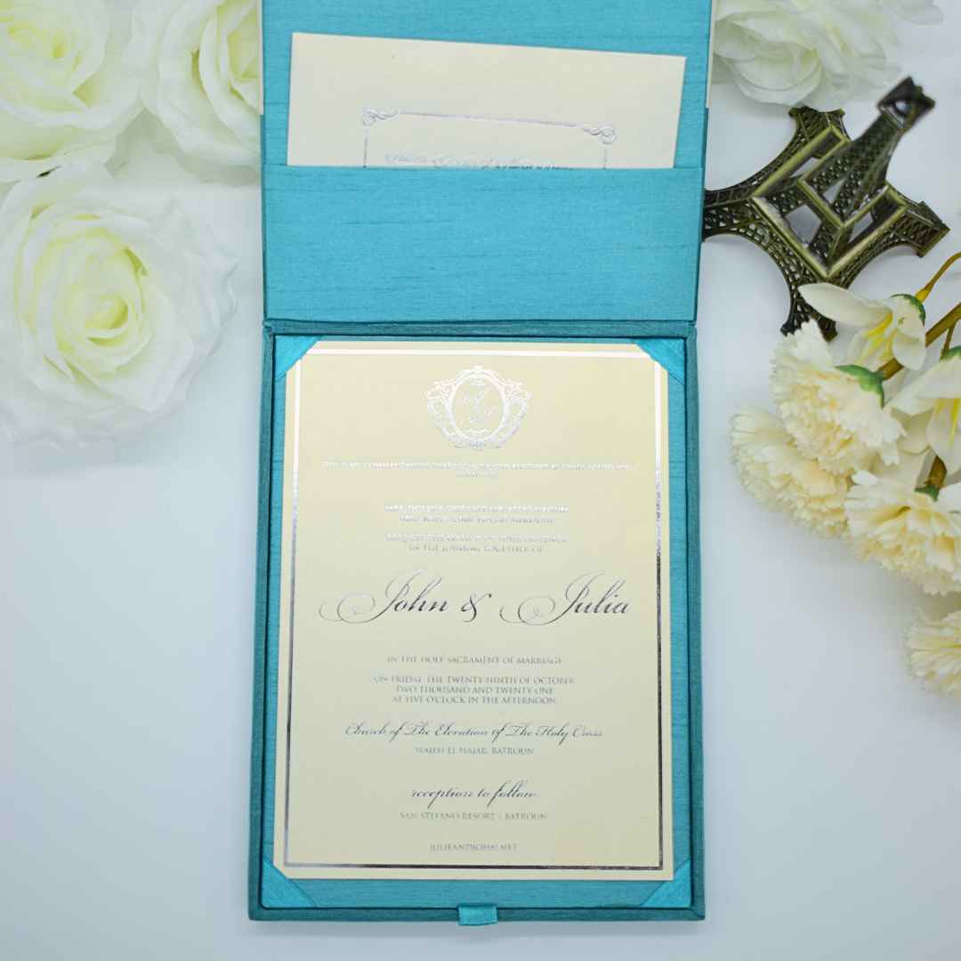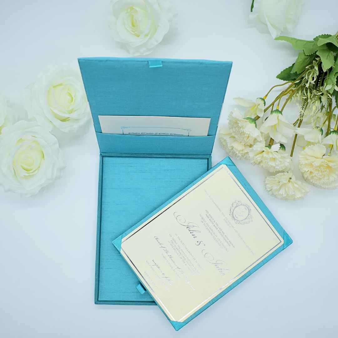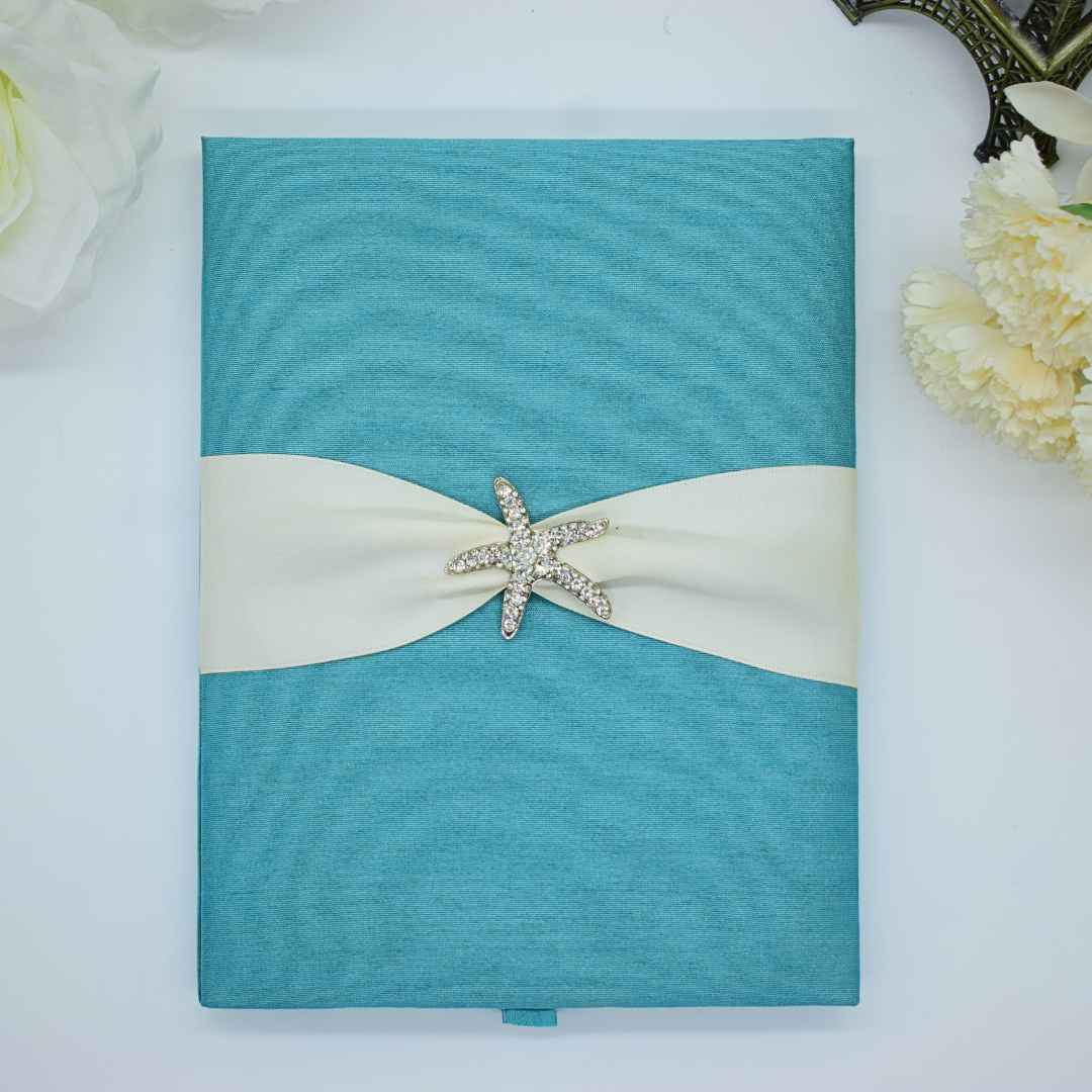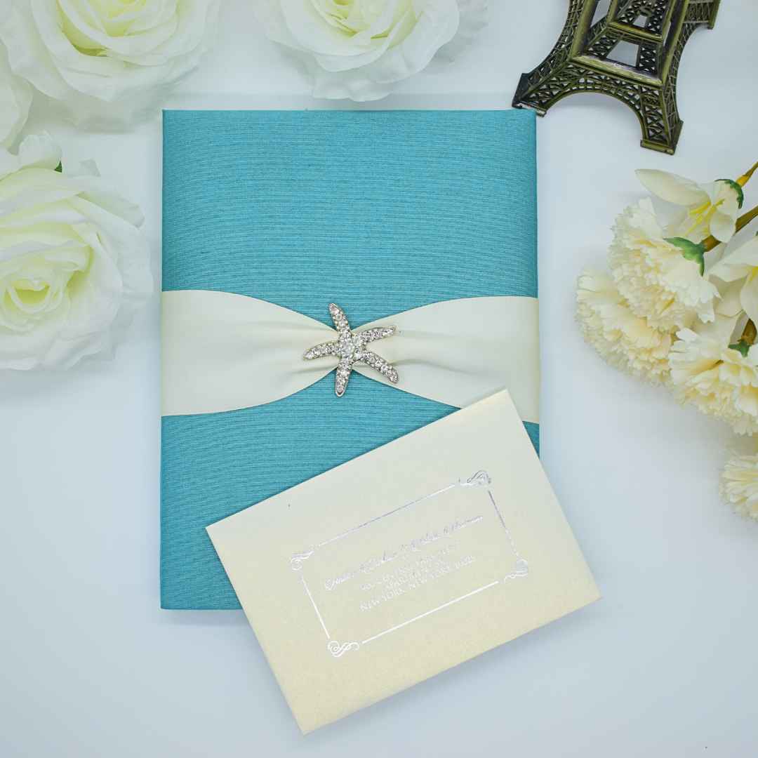 𝕋ℍ𝕀𝕊 𝕃𝕀𝕊𝕋𝕀ℕ𝔾 𝕀ℕℂ𝕃𝕌𝔻𝔼𝕊: A silk wedding invitation box with a crystal rhinetstone starfish brooch on a double trim satin ribbon. This boxed invitation comes with a silk cardholder that carries a pearl shimmery cardstock invitation insert with a foil printed details.