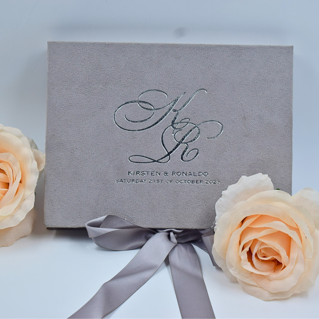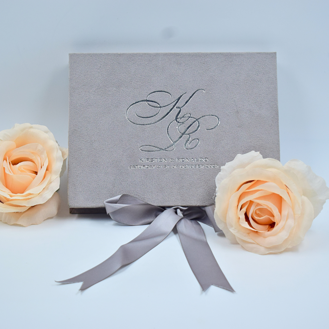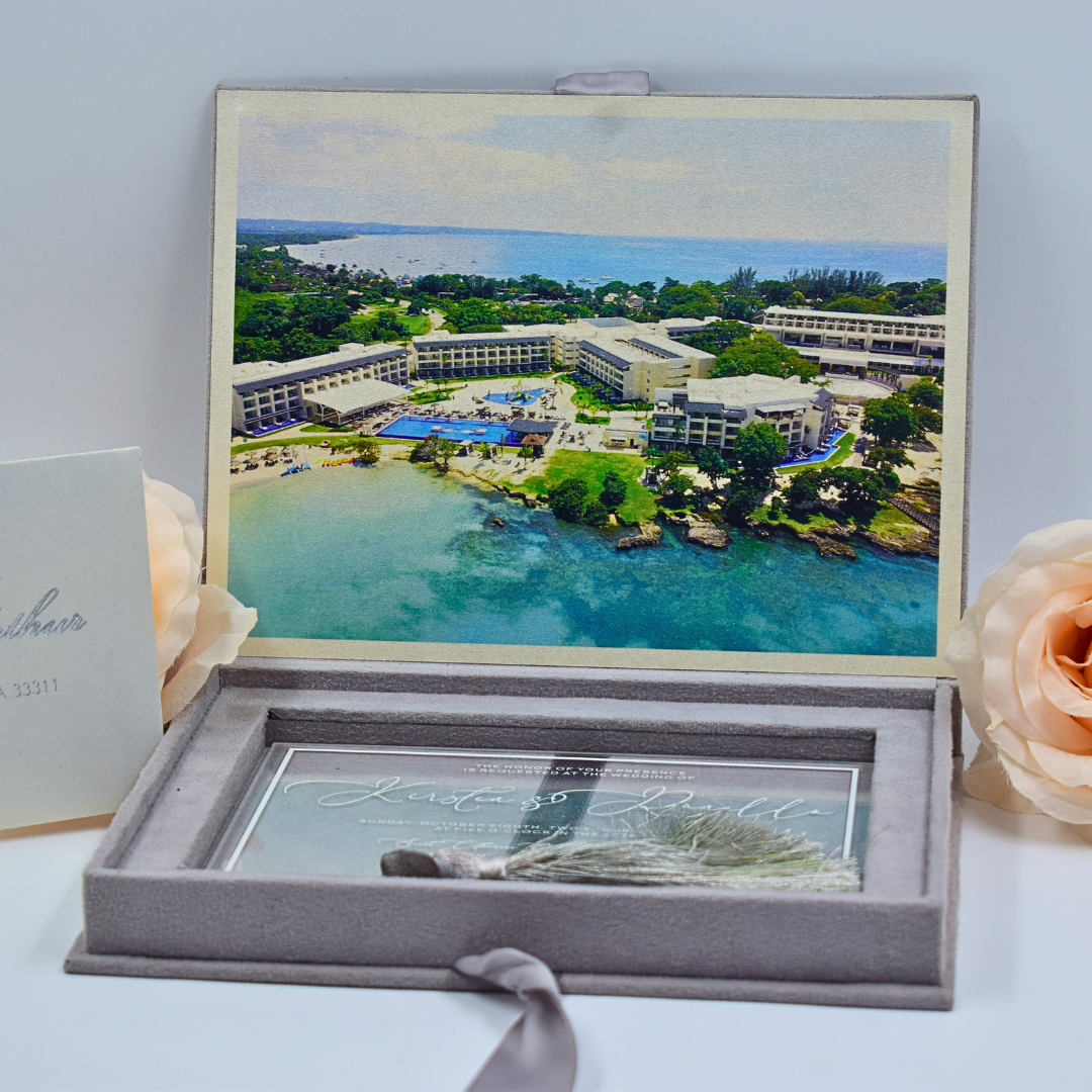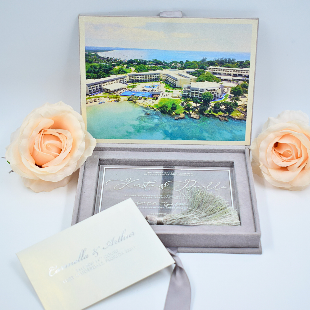 𝕋ℍ𝕀𝕊 𝕃𝕀𝕊𝕋𝕀ℕ𝔾 𝕀ℕℂ𝕃𝕌𝔻𝔼𝕊: A velvet wedding invitation box with a custom foil monogram and a clear acrylic invitation with silk screen printed details. The box has a picturesque representation of your venue on the flap, promising a first impression that captivates and delights. Completing the suite, a cardstock mailing envelope showcases your custom foil logo, ensuring every aspect of your invitation reflects the elegance of your event.