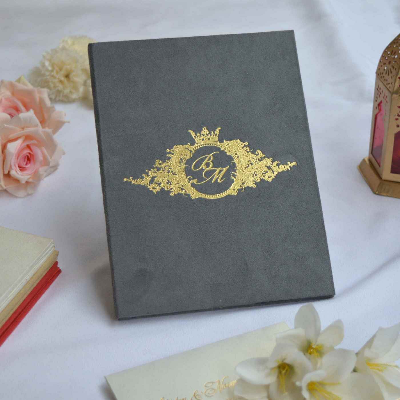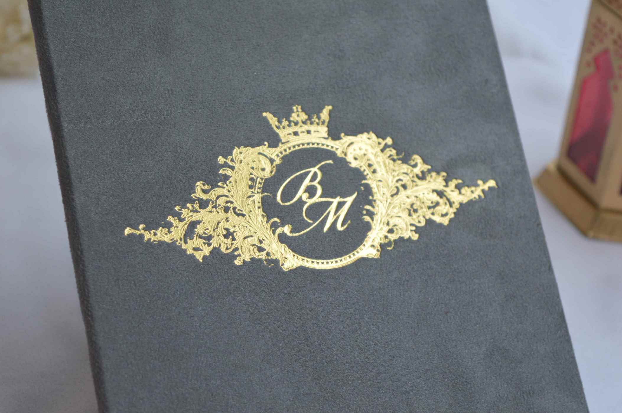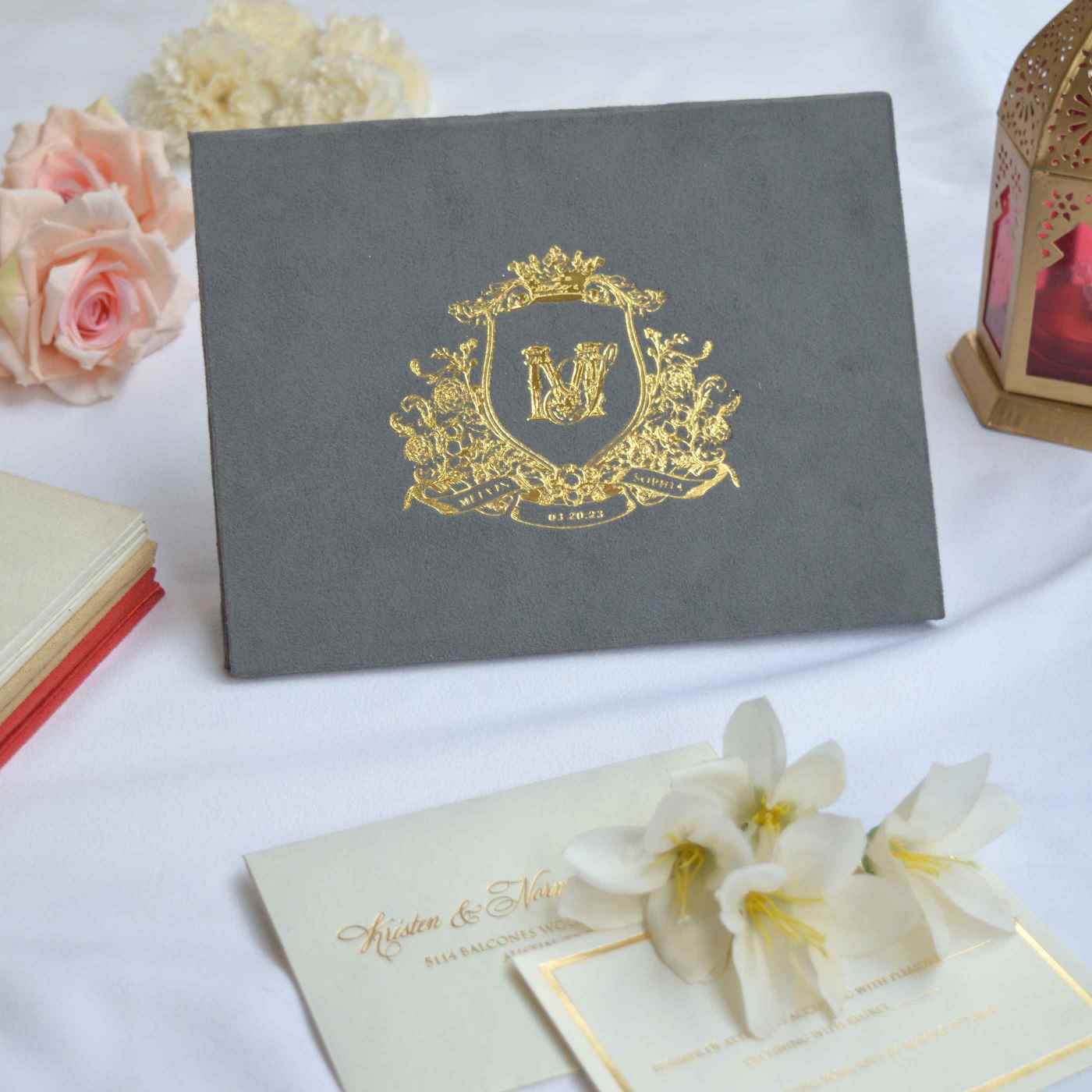 Grey Velvet Wedding Invitation Folio: Custom Foil Monogram