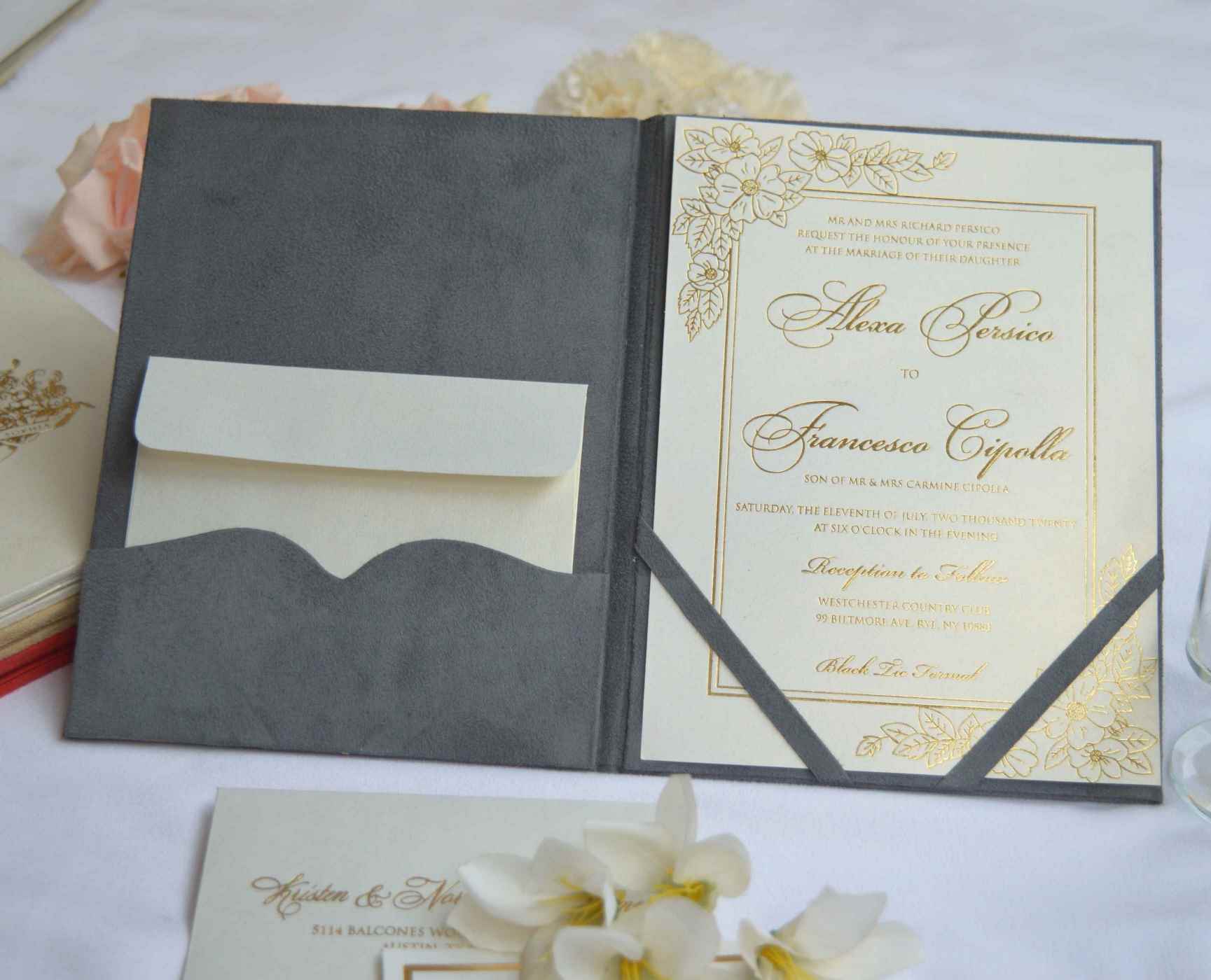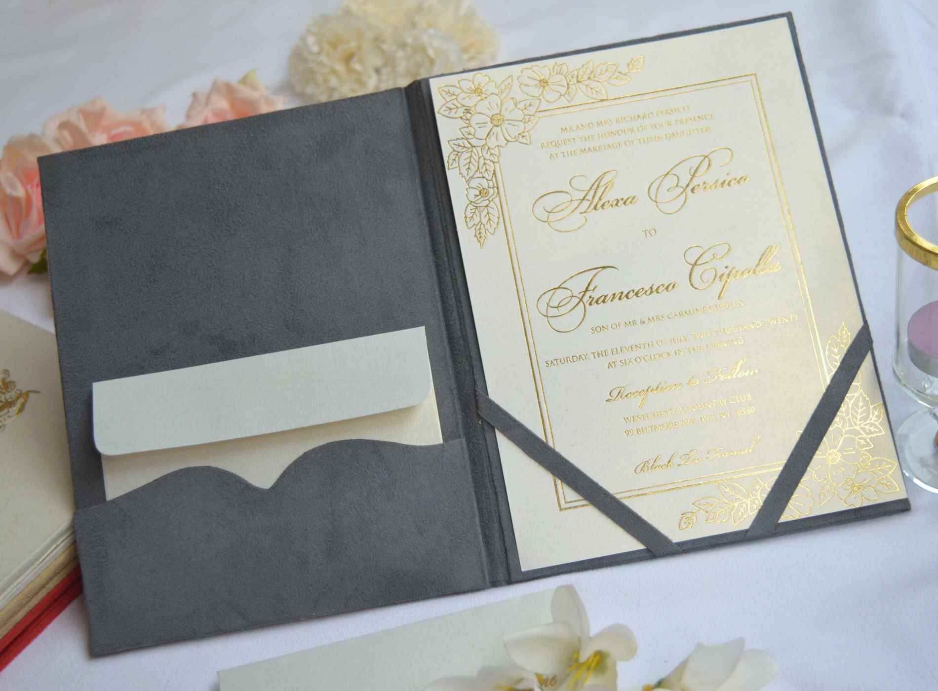 π•‹β„π•€π•Š π•ƒπ•€π•Šπ•‹π•€β„•π”Ύ π•€β„•β„‚π•ƒπ•Œπ”»π”Όπ•Š: A suede wedding invitation folio with a customized gold foil monogram. This suede folio comes with a foil printed cardstock invitation insert and a mailing envelope.