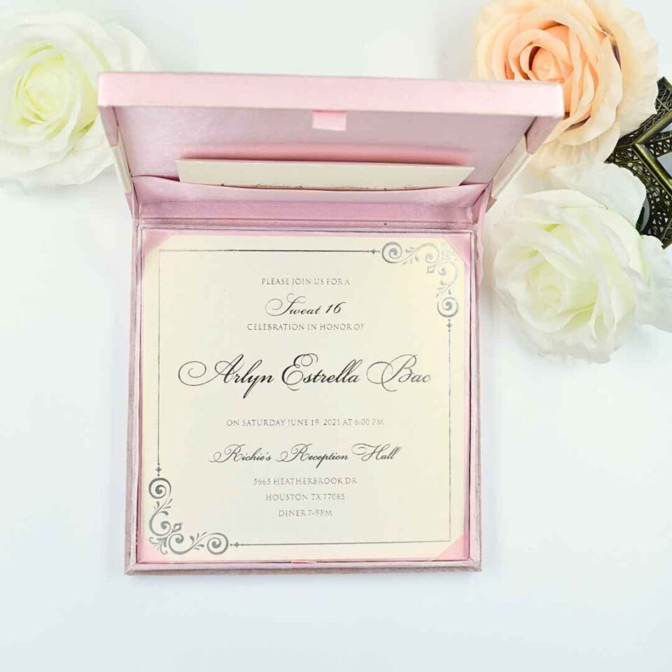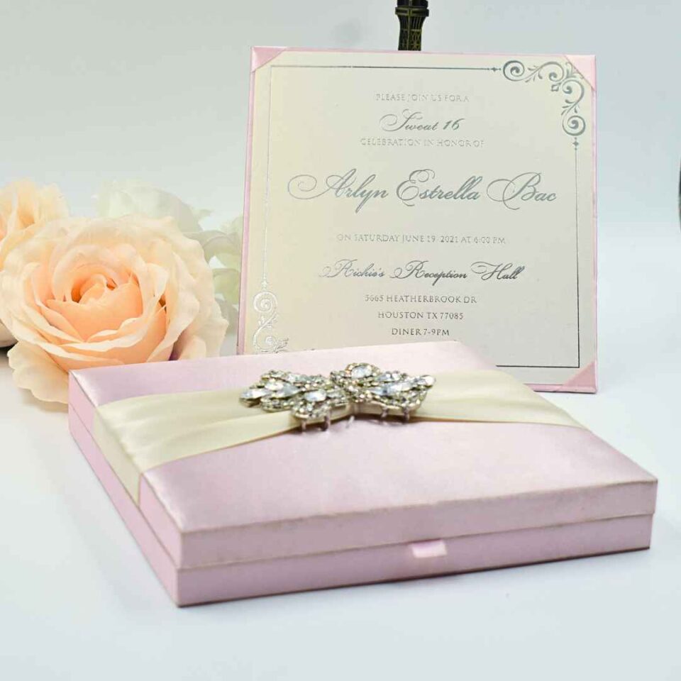 𝕋ℍ𝕀𝕊 𝕃𝕀𝕊𝕋𝕀ℕ𝔾 𝕀ℕℂ𝕃𝕌𝔻𝔼𝕊: A handmade silk wedding invitation box with embroidered pearls and rhinetsones. This boxed invite has a custom electroplated acrylic monogram. This boxed invitation comes with a silk cardholder that carries a pearl shimmery cardstock invitation insert printed with hot foil.