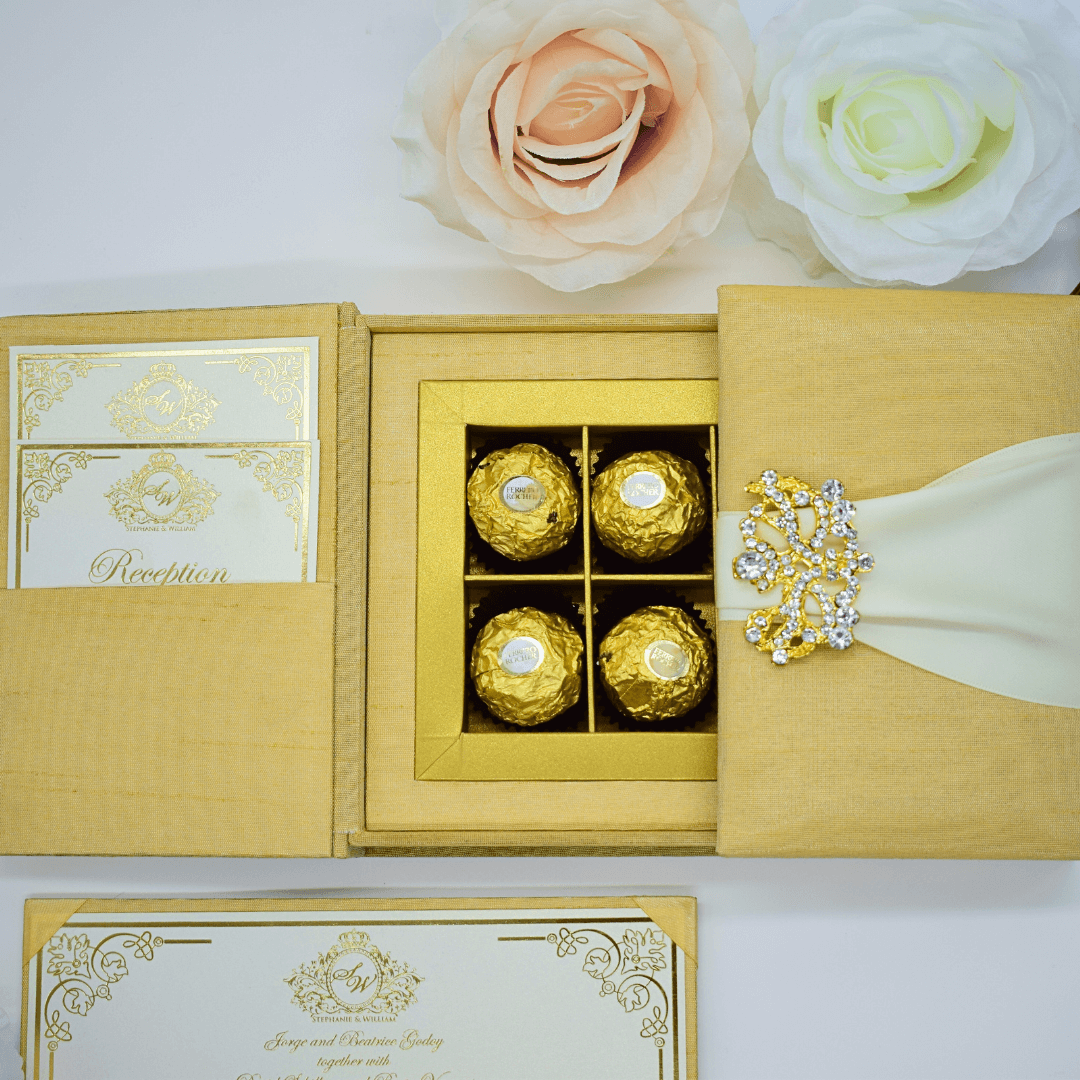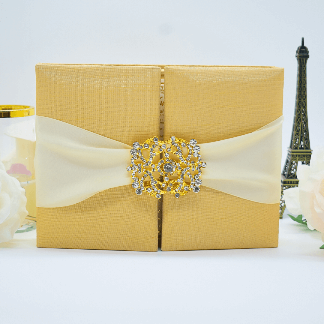 𝕋ℍ𝕀𝕊 𝕃𝕀𝕊𝕋𝕀ℕ𝔾 𝕀ℕℂ𝕃𝕌𝔻𝔼𝕊: This sumptuous gold silk wedding invitation box is a gateway to grandeur. Its gate-fold design, secured by double-trimmed satin ribbon, unveils like a precious tome. The sparkling rhinestone buckle adds a regal touch, while the hot-foil printed cardstock insert nestles within, protected by an elegant hardcover. More than an invitation, it’s a luxurious prologue to your extraordinary celebration, promising an event as exquisite as its announcement.