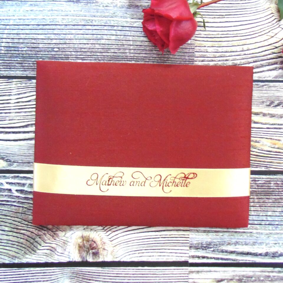 𝕋ℍ𝕀𝕊 𝕃𝕀𝕊𝕋𝕀ℕ𝔾 𝕀ℕℂ𝕃𝕌𝔻𝔼𝕊: A trifold dupioni silk wedding invitation folio with double trim satin ribbon and sparklingly rhinestones buckle embellishment. This silk folio comes with a hot foil-printed cardstock invitation insert. The folio has pockets inside the gates for additional enclosure card inserts.