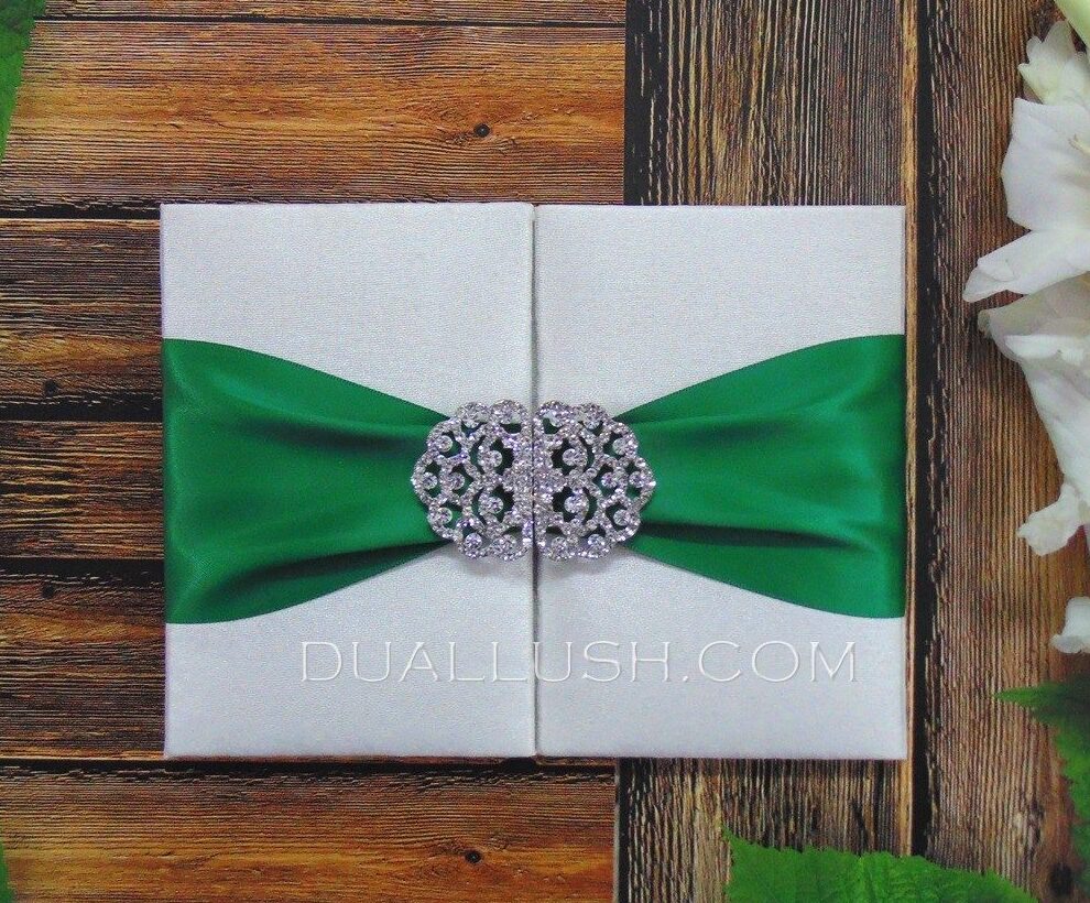 𝕋ℍ𝕀𝕊 𝕃𝕀𝕊𝕋𝕀ℕ𝔾 𝕀ℕℂ𝕃𝕌𝔻𝔼𝕊: A trifold silk wedding invitation folio with a double trim satin ribbon and a rhinestone buckle brooch. This silk folio has a pearl shimmery cardstock foil printed invitation insert card in center and has pockets inside both the gates for additional insert cards.