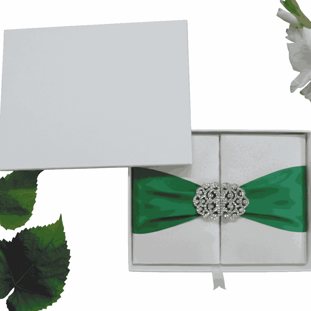 πβππ πππππβπΎ πββπππ»πΌπ: A trifold silk wedding invitation folio with a double trim satin ribbon and a rhinestone buckle brooch. This silk folio has a pearl shimmery cardstock foil printed invitation insert card in center and has pockets inside both the gates for additional insert cards.